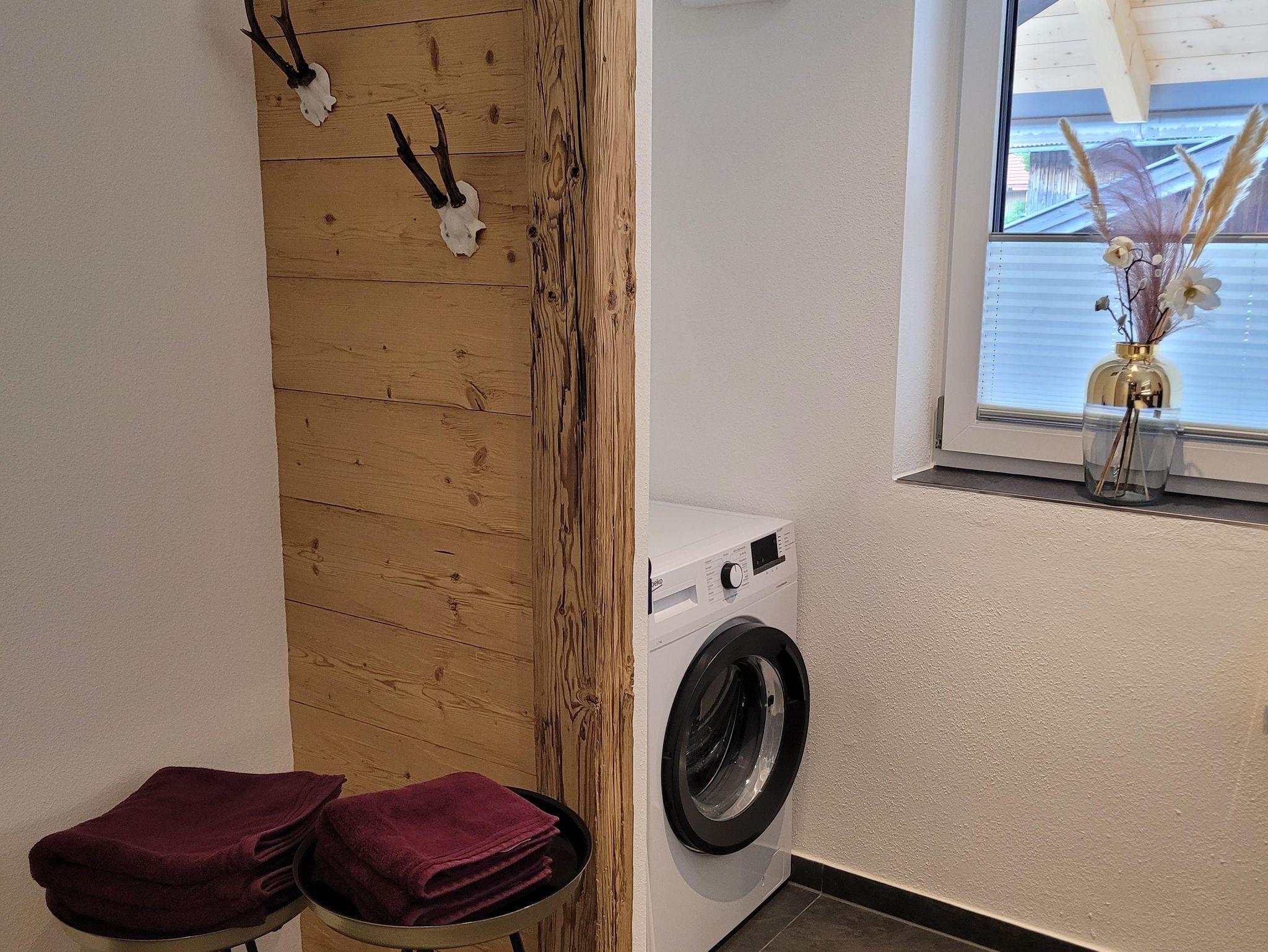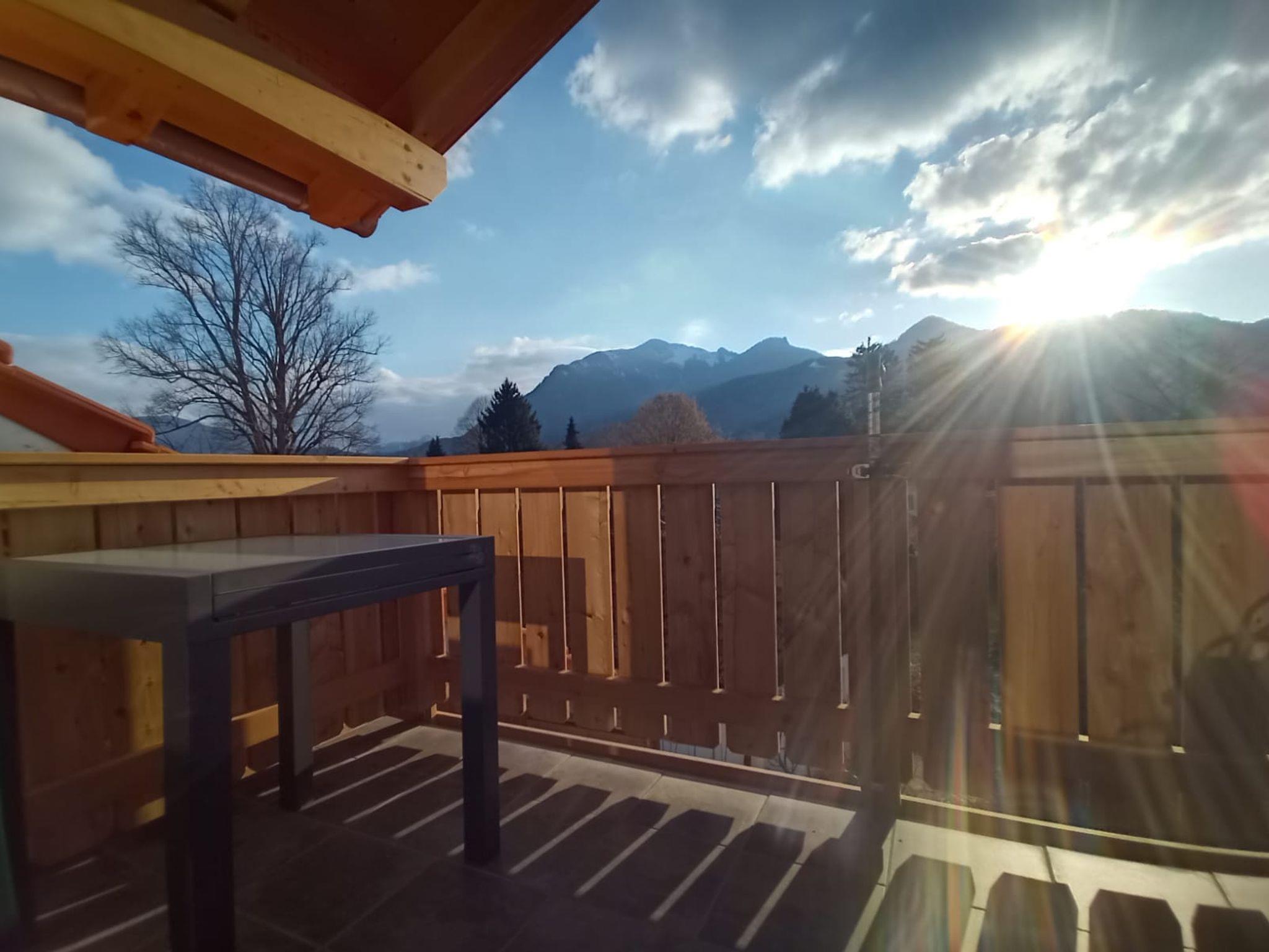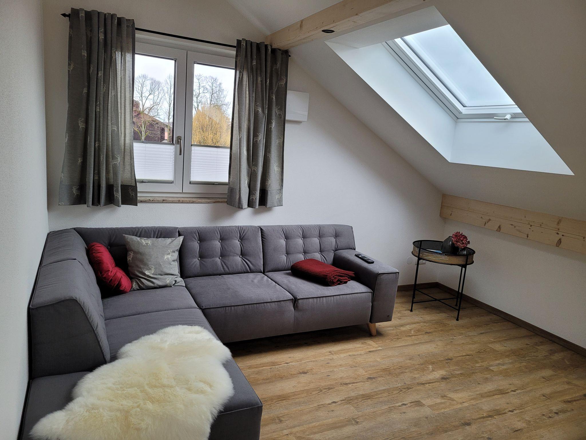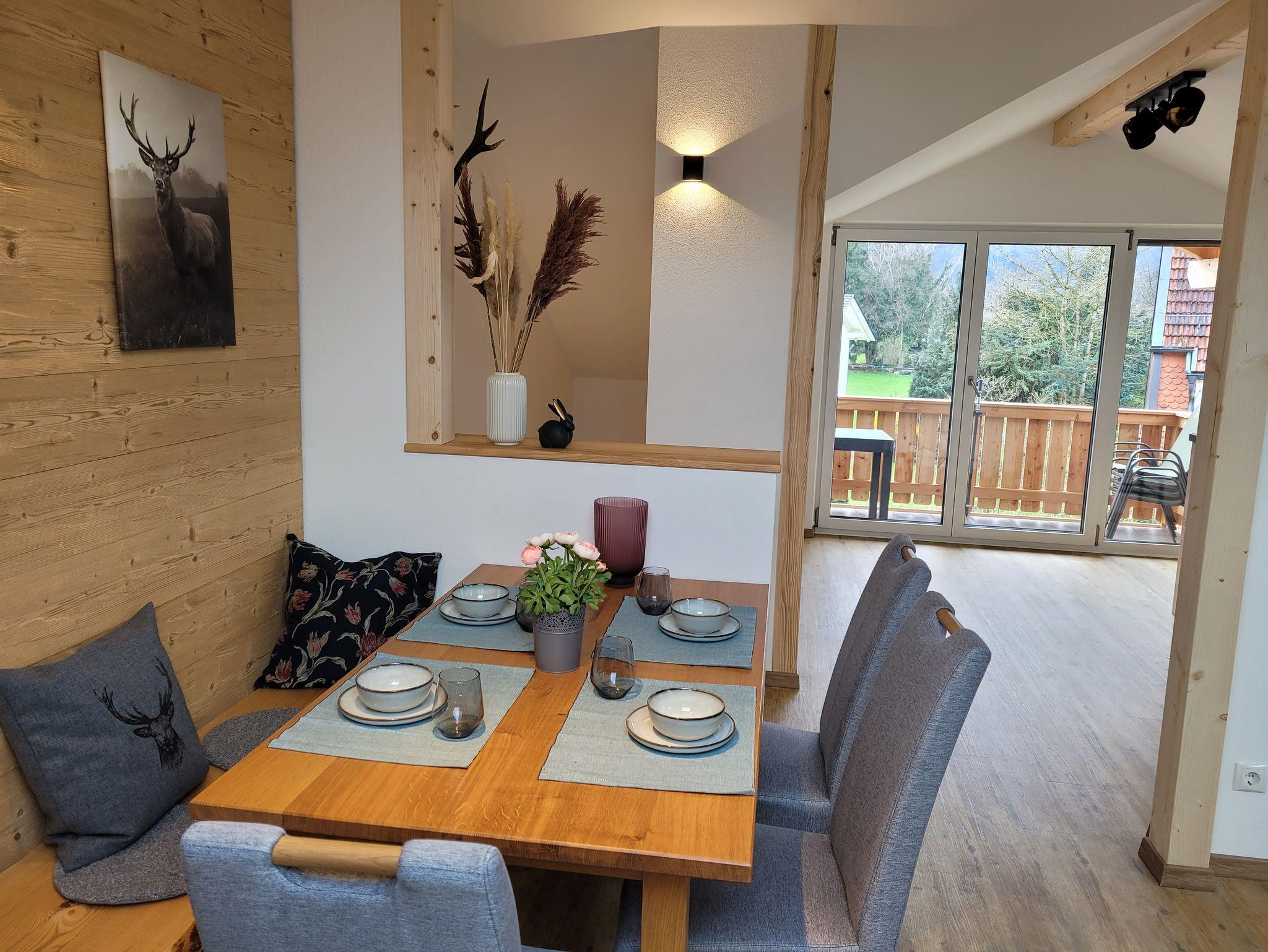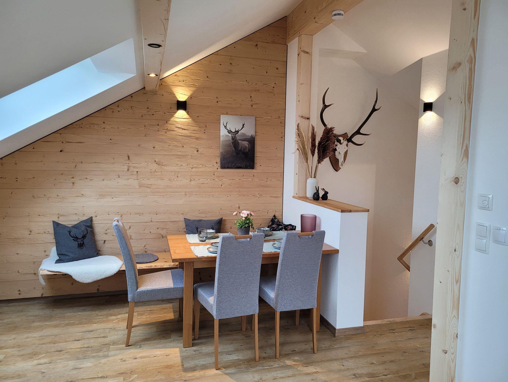 Unsere neu entstandene, 5 Sterne-Ferienwohnung ist sehr stilvoll und hochwertig eingerichtet. Die Mischung zwischen rustikalen Holzelementen und modernen Ambiente verleiht der Wohnung einen besonderen Flair. In der sehr lichtdurchfluteten Wohnküche im Dachgeschoss fühlt man sich sofort wie zu Hause. Dieser Bereich und auch der Rest der Wohnung ist gut geschützt vor sommerlicher Hitze durch Rollos und Raffstores. Im hinteren Teil des offenen Raumes kann man auf unserer großen Familiencouch den Tag gemütlich zum Ausklang bringen. Dort befindet sich auch der einladende Essbereich. Im vorderen Teil ist die großzügige Küche, von der aus man einen Kaffee mit Bergblick genießen kann. Von hier aus ist der Zugang zum überdachten Balkon möglich, der sich auf der Westseite befindet und von dem aus man einen wunderbaren Blick auf die Hochplatte bishin zum, in Tirol liegenden, Wilden Kaiser hat. Die zwei Schlafzimmer sind ausgestattet mit zwei Doppelbetten in der Größe 180x200 cm. Im Zirbenzimmer kann man den Duft der wohltuenden, ätherischen Öle der massiven Zirbenmöbel auf sich wirken lassen. Im Eichenzimmer findet man ein sehr hochwertig ausgestattetes Schlafzimmer mit Rustikalmassiveichenmöbel mit großem Kleiderschrank. Im geräumigen Bad befindet sich eine ebenerdige große Dusche. Die Wohnung ist mit einer kontrollierten Wohnraumlüftung ausgestattet und so auch für Allergiker gut geeignet. Die Eingangstür der Wohnung befindet sich im 1.Stock, zu der man durch eine separate Außentreppe kommt.