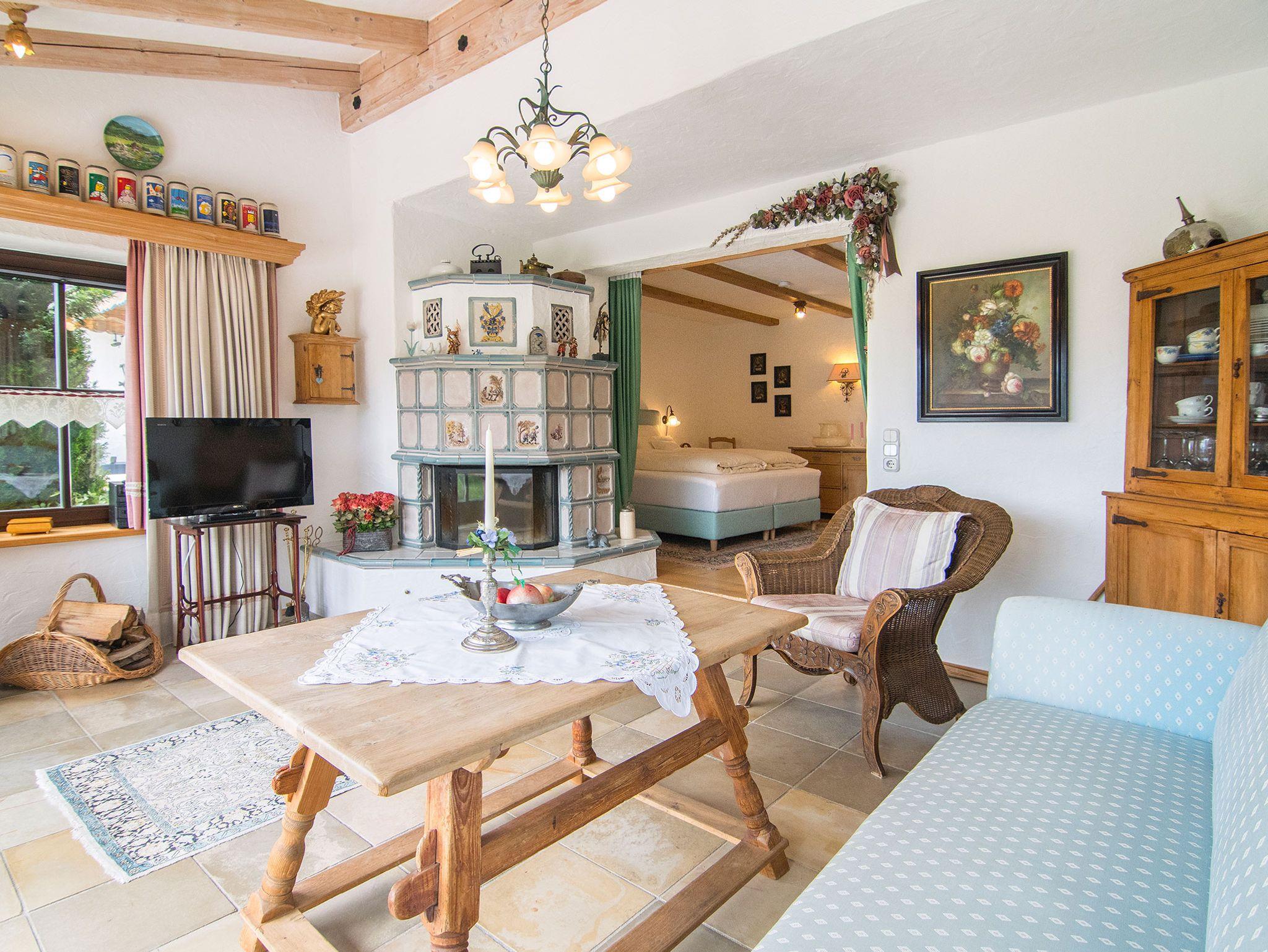 Die 5 * Wohnung befindet sich im Erdgeschoss, ca. 65qm Wohnfläche mit unverbautem Südblick zum Kammerköhr, Winklmoosgebirge, Wilden Kaiser und im Westen zur Hochplatte (1587m). Zur Wohnung gehört eine ca. 20 qm große Terrasse mit Sitzgruppe, Liege und Markise. Die Wohnung besteht aus einem Kaminzimmer (Wohnzimmer), mit offenem Kamin, Sofa, Sessel und Tisch und einem, durch einem Vorhang abgetrennten Schlafzimmer mit 1,80m x 2,00m Boxspringbett, Schrank, kleinem Sofa m. Tisch und Verdunklungssvorhängen. Separater sehr gut ausgestatteter Einbauküche mit 4 Elektrokochplatten, Backofen, Dunstabzug, Kühlschrank mit Tiefkühlfach, Geschirrspüler und Mikrowelle, Mixer, Wasserkocher, Filter-Kaffeemaschine und Geschirrtücher. Bad mit Fenster, Wanne und Duschabtrennung, WC, sowie ein beleuchteter Kosmetikspiegel und Hand-u. Badetücher, Pflegeprodukte, Kosmetiktücher und Toilettenpapier. Kleine Diele mit Schuhschrank. Kabel-TV (Flachbildschirm) mit Vodafone GigaTV Home/ DAB-Radio und kostenloses WLAN. An allen Fenstern und Türen sind Fliegengitter. Parkplätze am Haus/Hof oder unmittelbar vor dem Haus und ein überdachter Fahrradunterstand ist ebenfalls vorhanden. Außerdem steht ein Holzkohlegrill und ein Gartenpavillon mit Sitzgelegenheit zur Allgemeinbenutzung zur Verfügung. Keine Haustiere! Nichtraucher in den Fewo's, Rauchen ist auf Balkon, Terrasse oder Garten möglich! Kfz-Stellplatz befindet sich am Haus. Keine Haustiere!