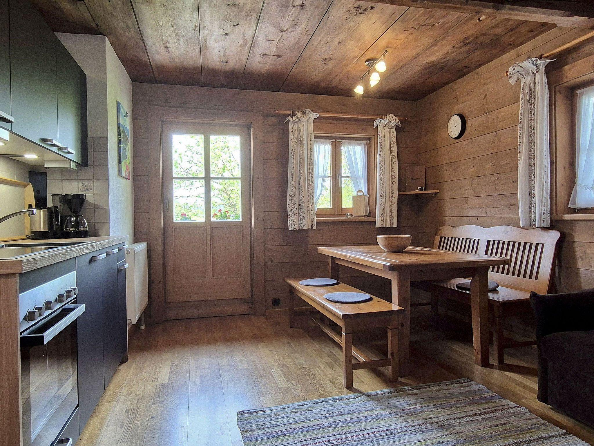 Das unter Denkmalschutz gestellte Zuhaus liegt sehr ruhig am Ortsrand mit freiem Blick auf Wiesen und Berge. Die Ferienwohnung befindet sich im 1. Stock und ist mit 2 separaten Schlafzimmern, 2 Balkonen, einer gemütlichen Wohnküche mit Essplatz und Du/WC ausgestattet. 1 Doppelzimmer kann zur FW zugemietet werden. Grillmöglichkeit mit Gartenhäuschen vorhanden.