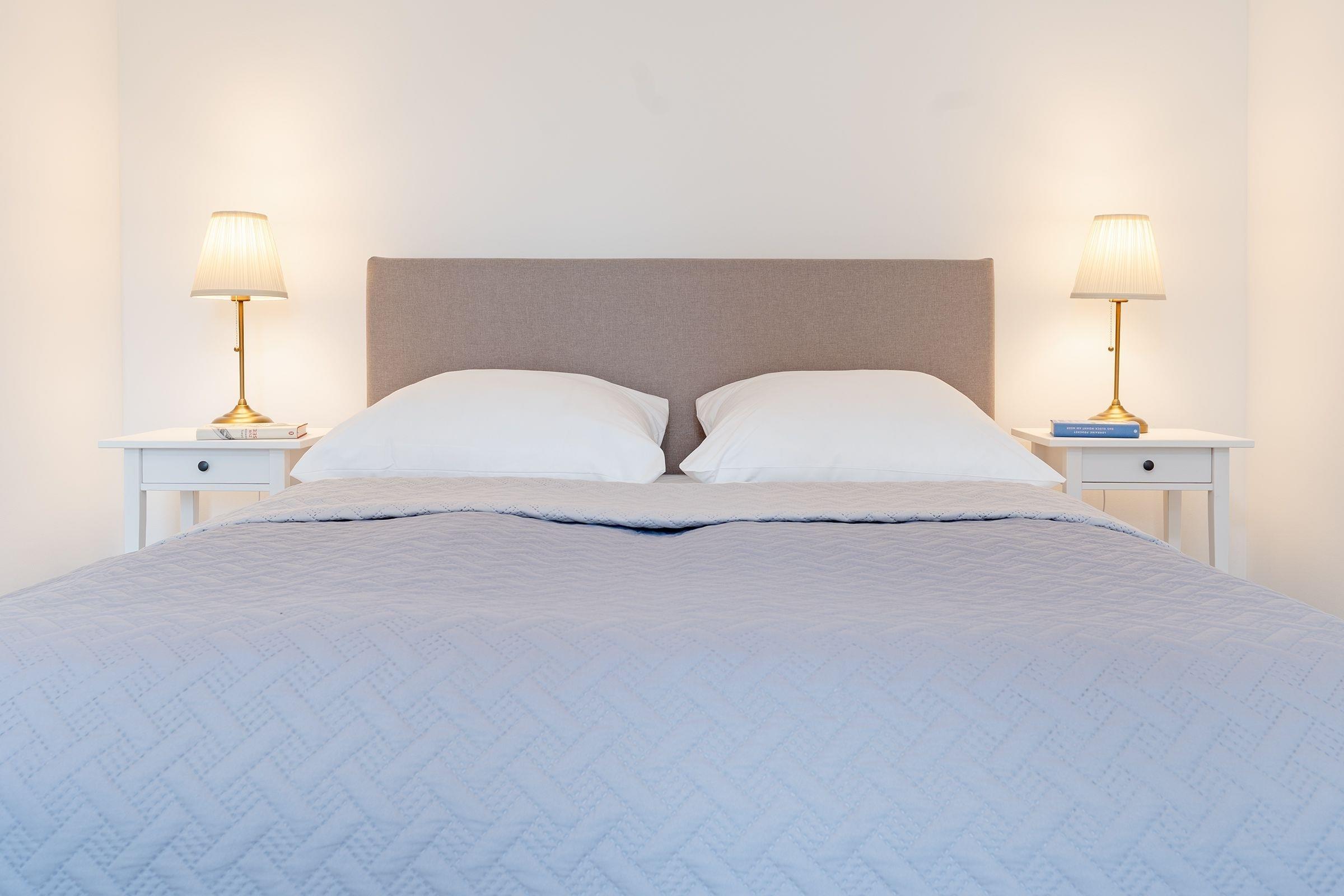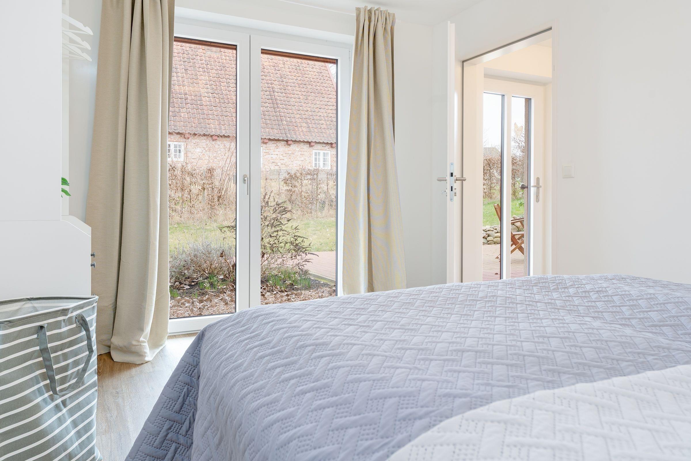 Schlafzimmer: 1 Boxspring-Doppelbett (160x200 cm), Kleiderschrank, Verdunkelung: Vorhänge, Platz für Babybett vorhanden