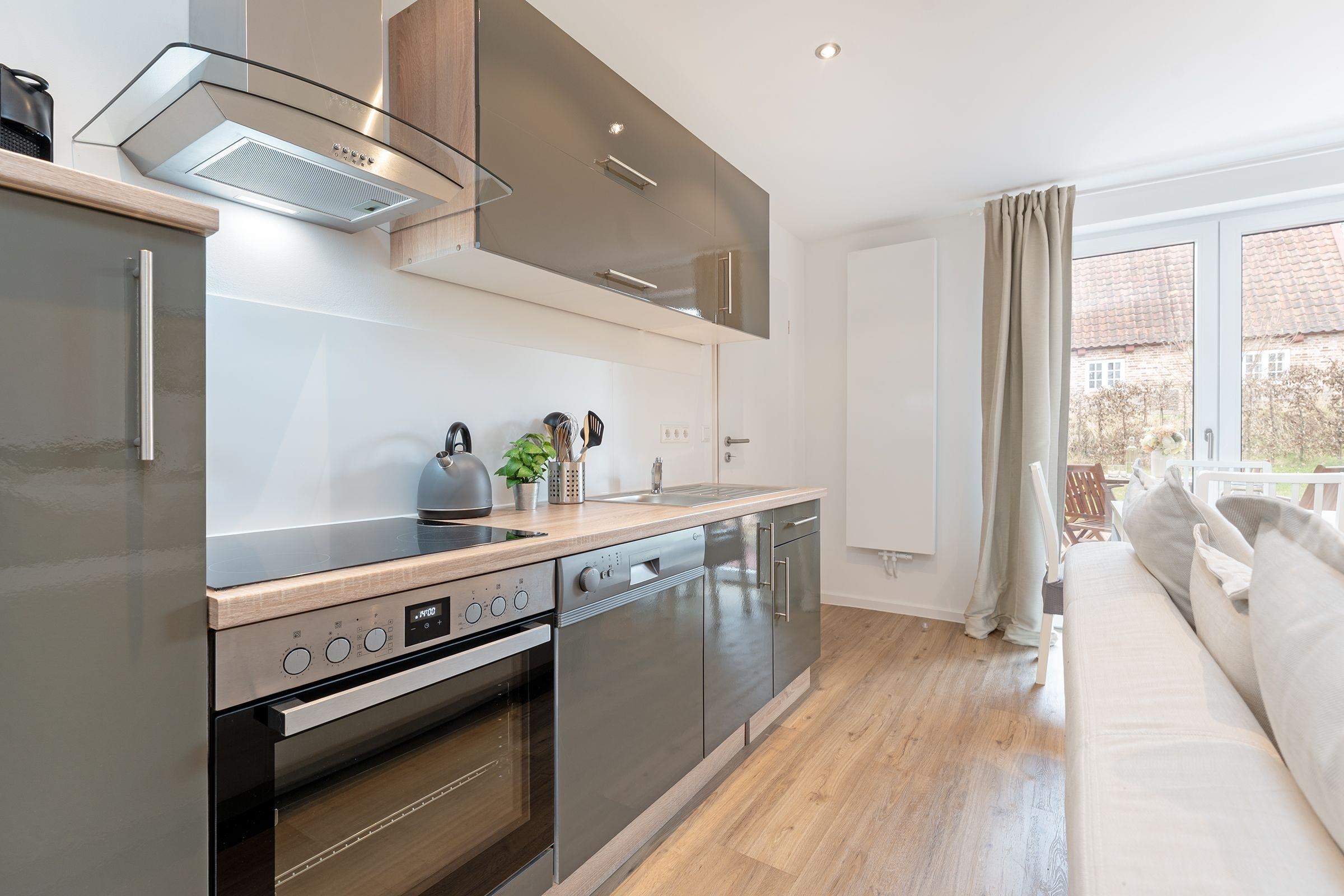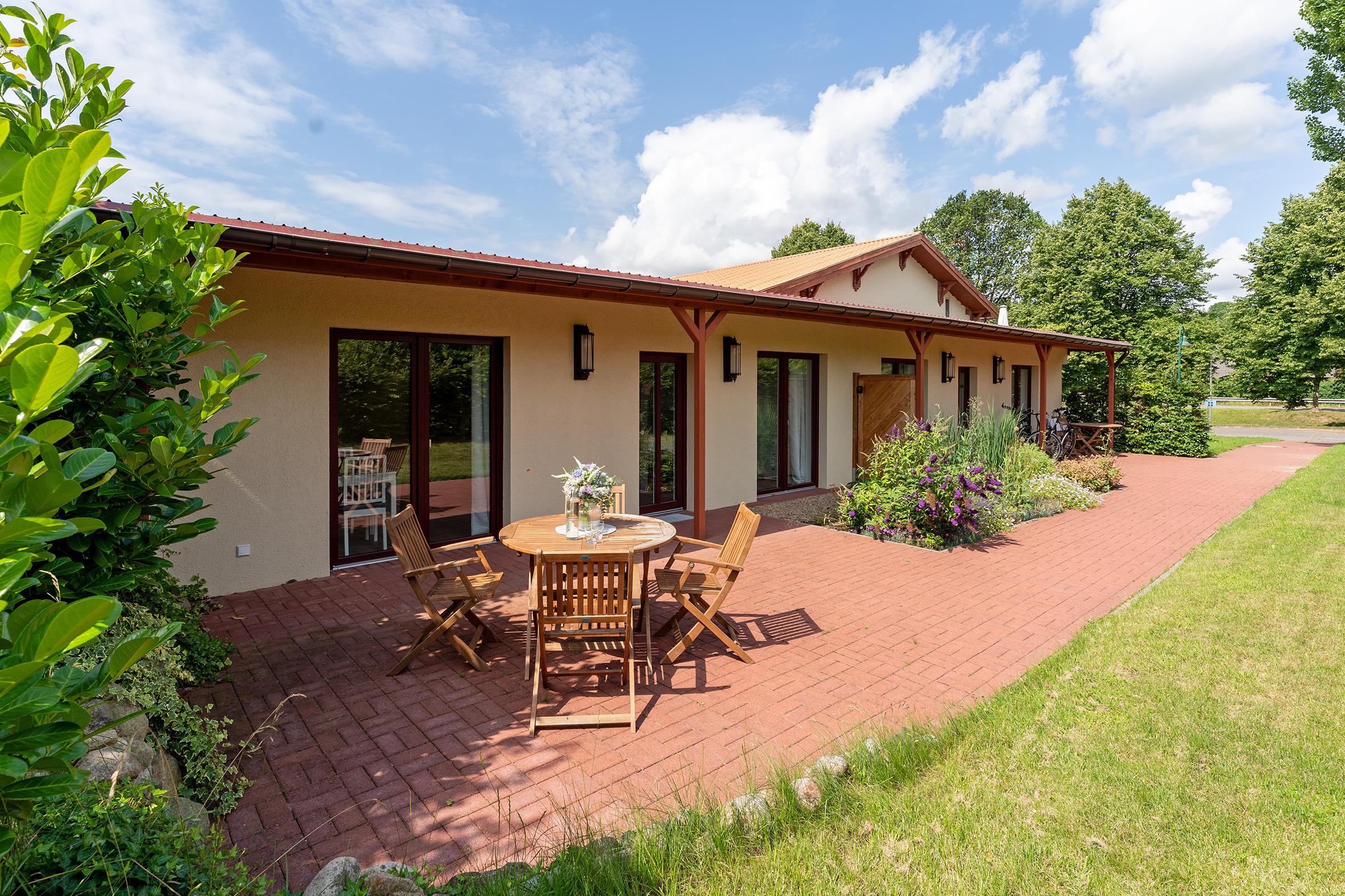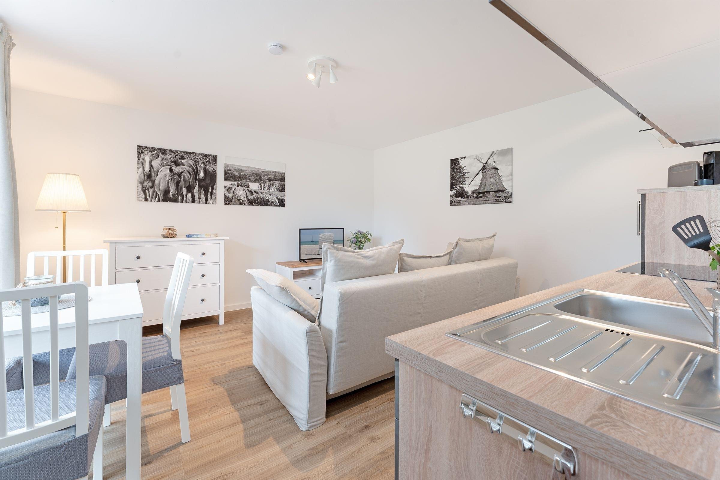 Ihre Ferienwohnung bietet einen traumhaften Ausblick auf die umliegende Natur, den Sie durch große Fensterfronten genießen können. Von hier aus gelangen Sie auf die großzügige, überdachte Terrasse mit vorgelagertem Gemeinschaftsgarten, die sich perfekt für entspannte Stunden an der frischen Luft eignet. Machen Sie es sich auf den komfortablen Gartenmöbeln gemütlich. In der offen zum Wohnzimmer gestalteten Küche können Sie kulinarische Highlights zaubern und diese gemeinsam am Esstisch genießen. Das separate Schlafzimmer verfügt über ein komfortables Boxspring-Doppelbett (160x200 cm) sowie genügend Stauraum für Ihre Urlaubsgarderobe. Eine zusätzliche Schlafmöglichkeit für zwei Personen befindet sich im Wohnbereich. Hier können Sie das gemütlich Sofa für die Nacht leicht in einen weiteren Schlafbereich (2x80x200 cm) verwandeln. Das moderne Duschbad verfügt zusätzlich über eine Waschmaschine, die für eine stets saubere Urlaubsgarderobe sorgt.