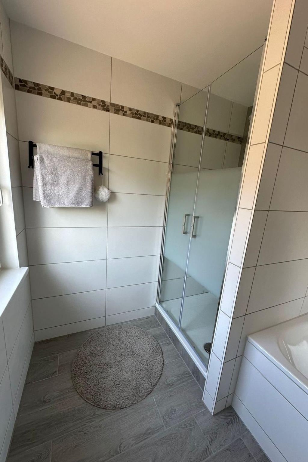 We have equipped the large fitted kitchen for you with a fridge-freezer, dishwasher, cooker and oven, filter coffee machine, waffle iron, toaster, sandwich maker, kettle and a Monsieur Cuisine. The living area has two real leather sofas and a Smart TV on which you can watch your usual TV programme. We have left a selection of board and card games in the sideboard - so nothing stands in the way of a fun games evening! We have also set up a playroom on the ground floor for our younger guests. Here you will find an air hockey table, a doll's house, toy cars, a tunnel caterpillar and much more. For the teens travelling with you, there is a separate area in the playroom for chilling out and gaming with two beanbags and a Smart TV, to which you can either connect the games console you have brought with you or watch a selected programme via the TV apps. There is also a large daylight bathroom on the ground floor with a double washbasin, bathtub, shower and WC, as well as a guest WC and a utility room equipped with a washing machine, tumble dryer and hoover.