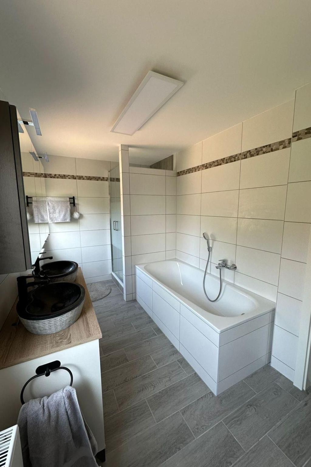 Bathroom: WC, bathtub, shower, double washbasin, illuminated mirror cabinet, 2 windows