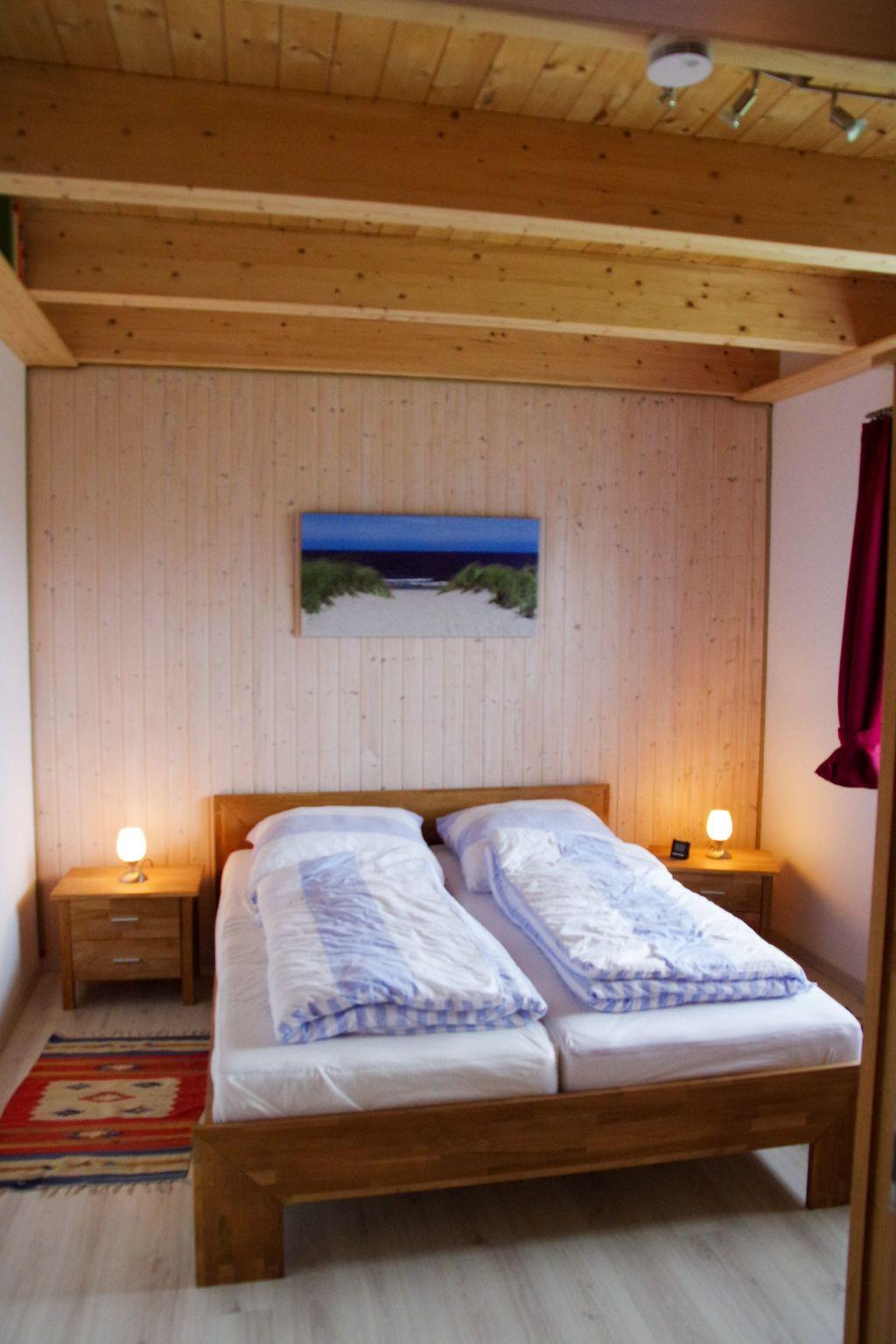 The house has four bedrooms, of which one is on the ground floor, and two shower rooms. It can accommodate eight people and is also ideal for e.g. two families. The beautiful wooden ceiling beams and the maritime décor give the house a very special character. The ground floor has a generous living and dining room with a fireplace stove and large doors opening onto the terrace with an open view over meadows and fields. The kitchen is equipped with an oven, microwave and dishwasher etc. The storage room right next to it has a washing machine and dryer. The bathroom on the ground floor is fitted with a shower, WC and bidet and also features a sauna. One of the (parents’) bedrooms with a double bed is on the ground floor and therefore also suitable for a holiday with e.g. grandparents. The upper floor comprises three further bedrooms, one with a double bed, two each with two single beds, and a further shower room.