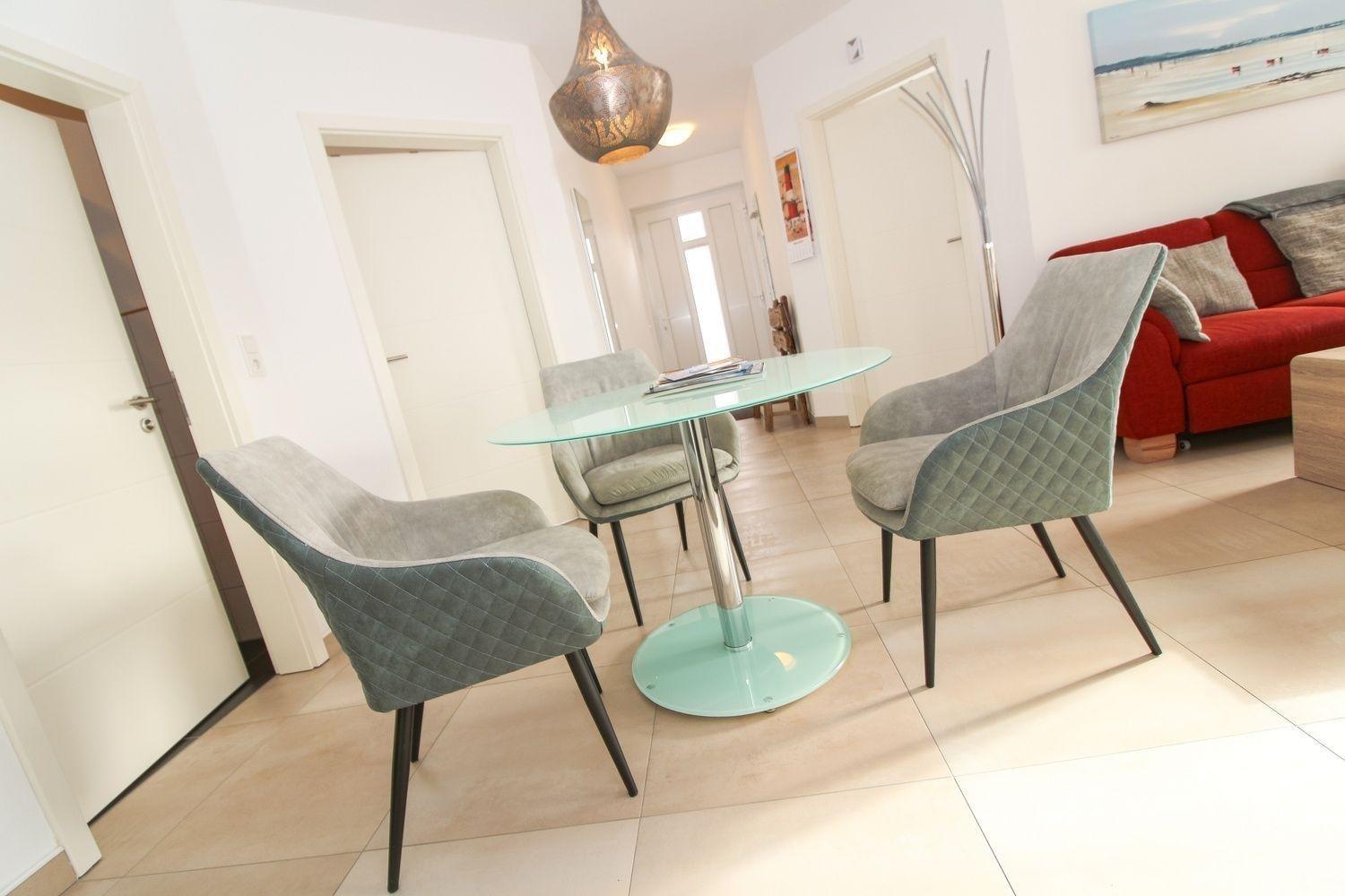 Die ebenerdige Ferienwohnung mit eigenem Hauseingang verfügt über ein sonnendurchflutetes Wohnzimmer mit einem großzügigen Essbereich und einer offenen, modernen Küche, die keine Wünsche offen lässt.