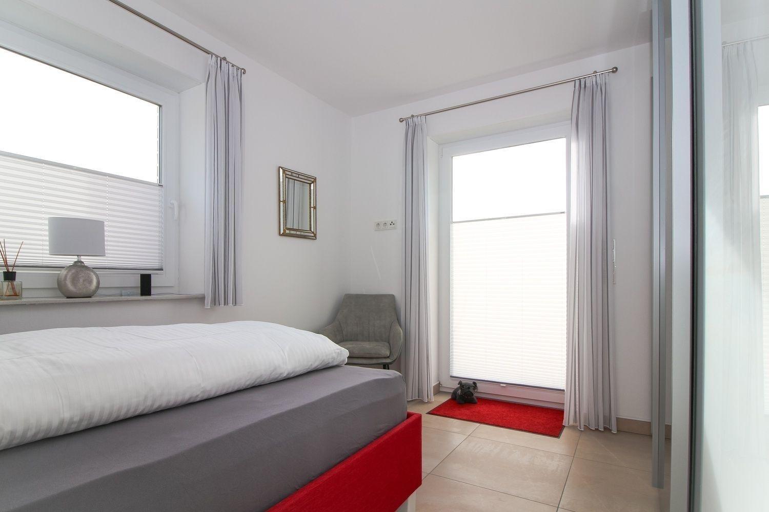 Das Schlafzimmer ist friesisch gemütlich mit einem komfortablem Doppelbett, Kleiderschrank, Kommode und Flachbildfernseher ausgestattet.