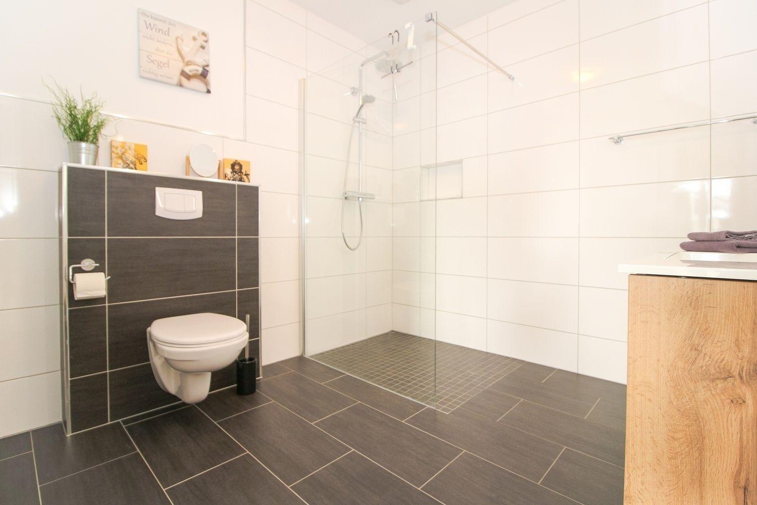 Das Badzimmer hat eine bodengleiche große Dusche und komfortable Badmöbel.