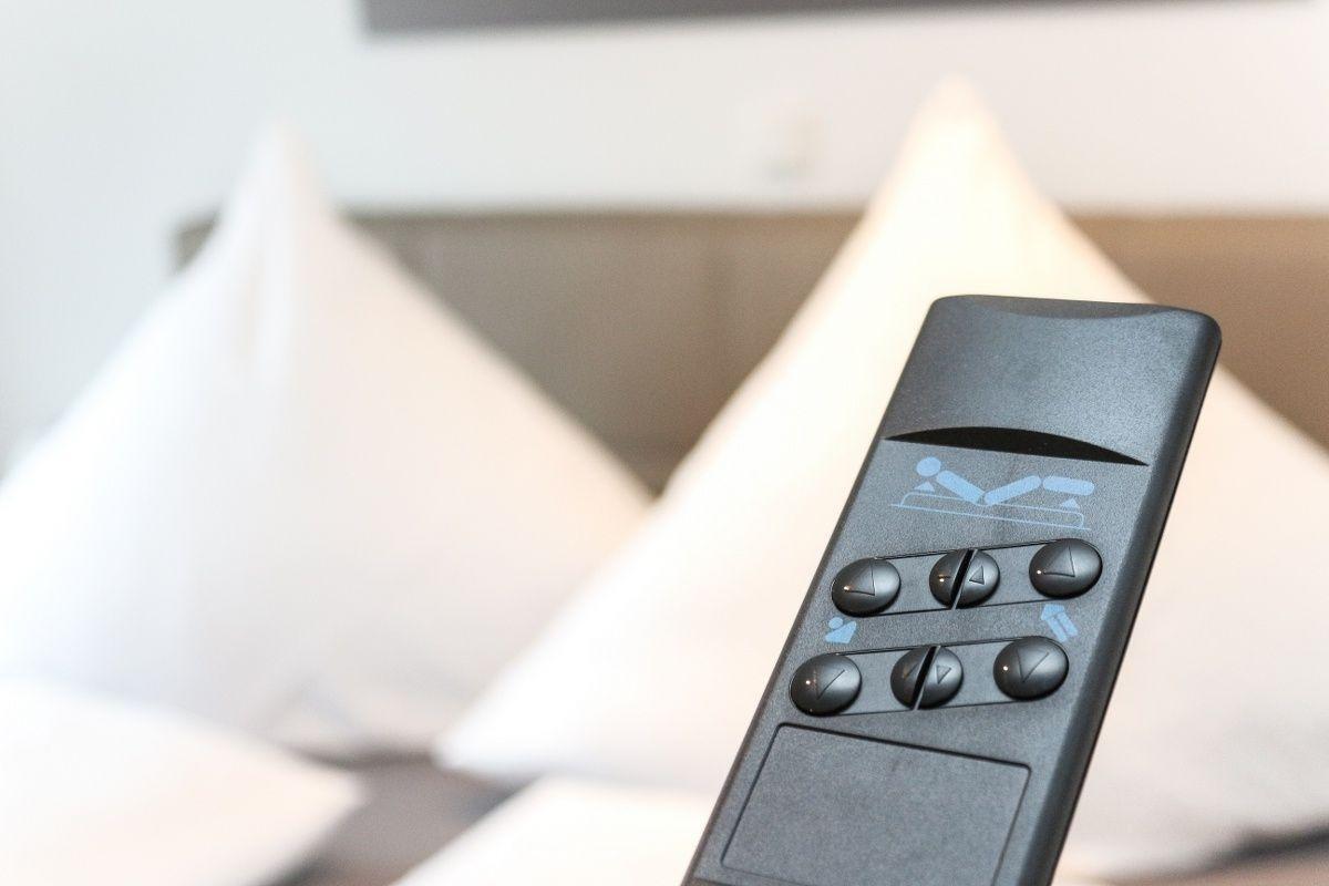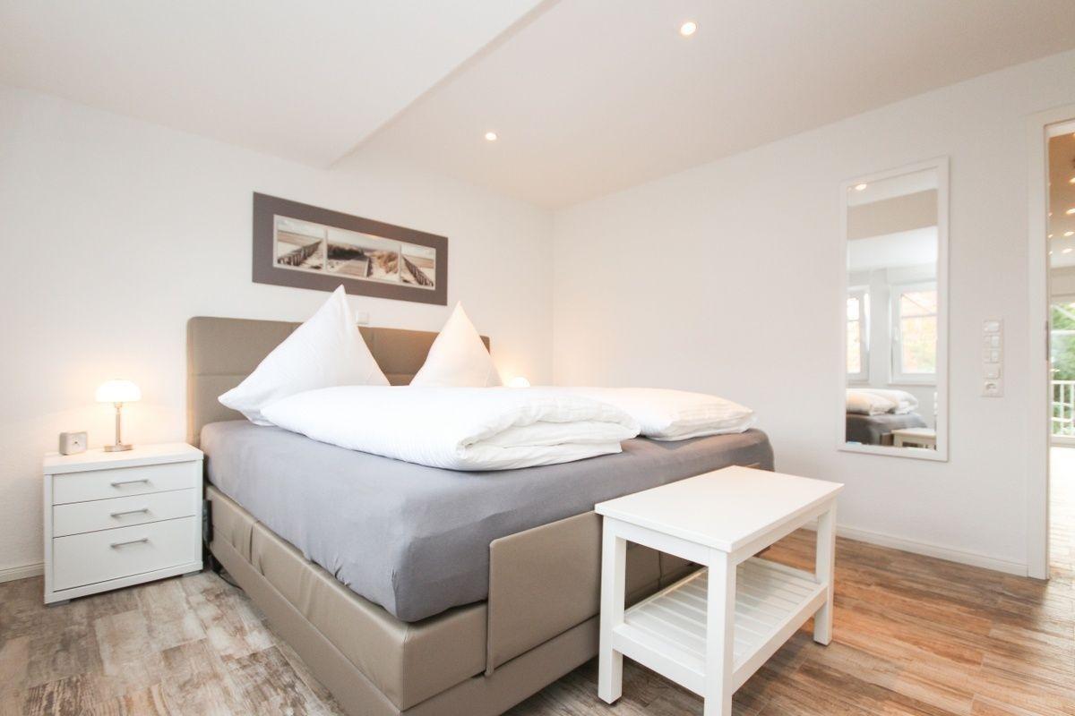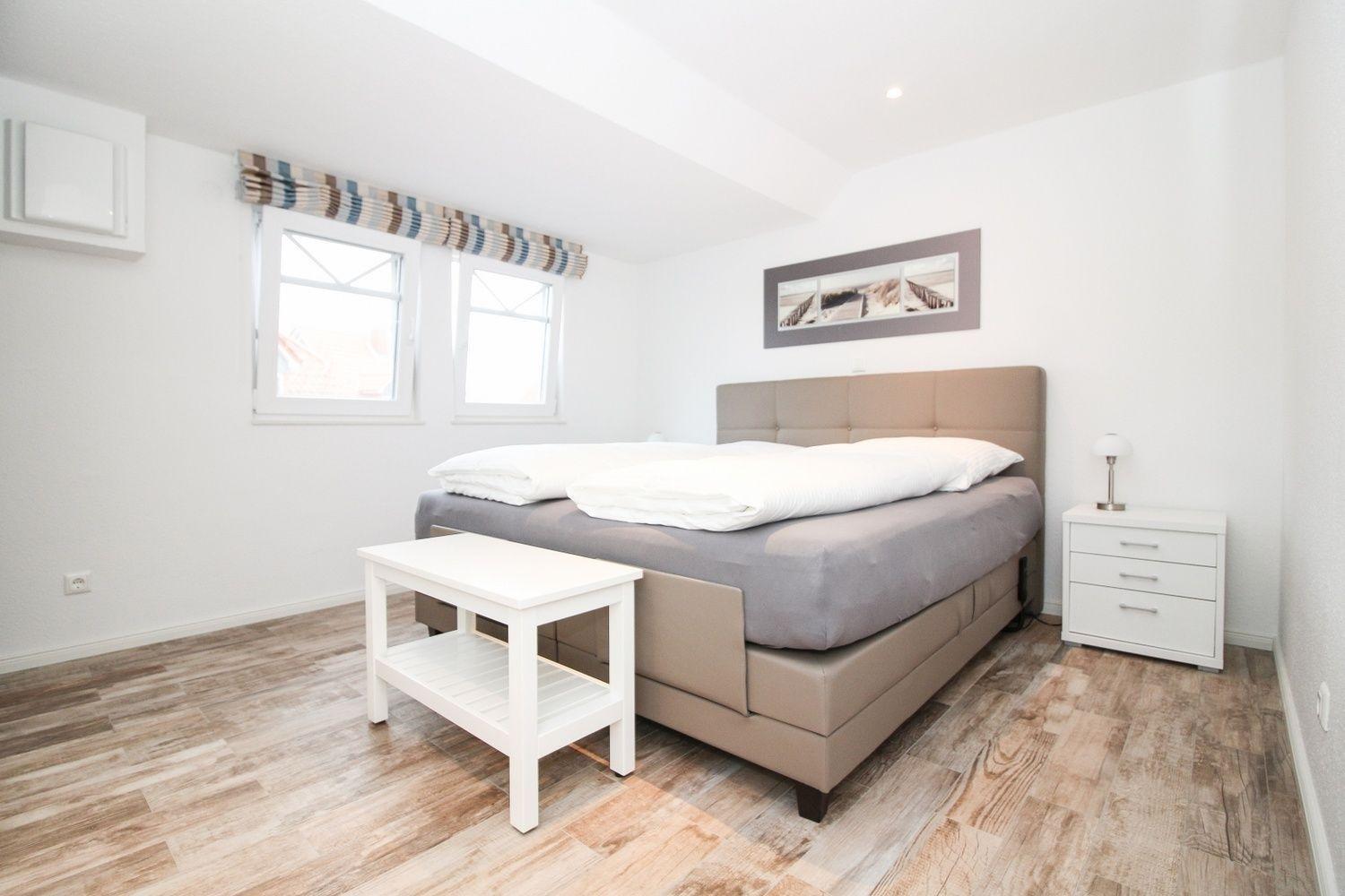 Im Wohn-/Essbereich befindet sich eine sehr gut ausgestattete Küchenzeile. Im geräumigen Schlafzimmer mit zwei Fenstern steht ein sehr komfortables Boxspringbett, bei dem die Liegefläche jeweils separat (Kopf/Fuß, links/rechts) elektrisch angehoben oder abgesenkt werden kann. Das Bett bietet eine durchgehende Matratzenauflage (180x200 cm).