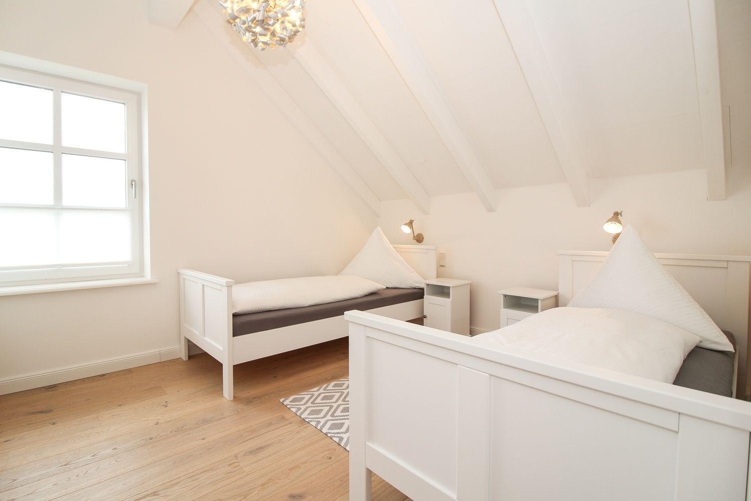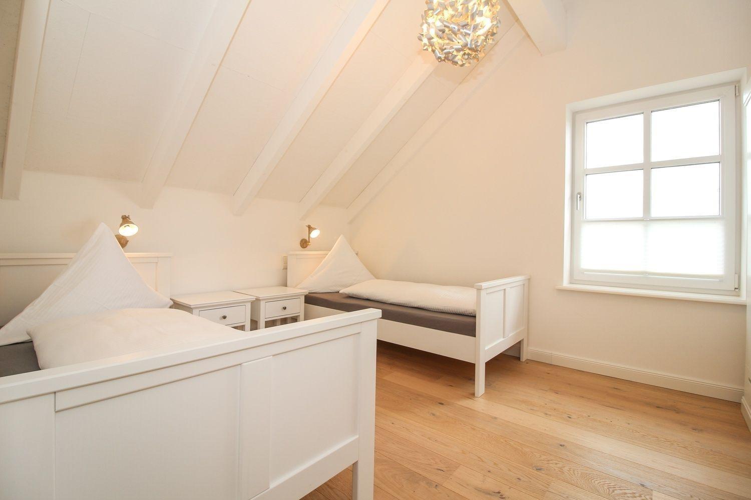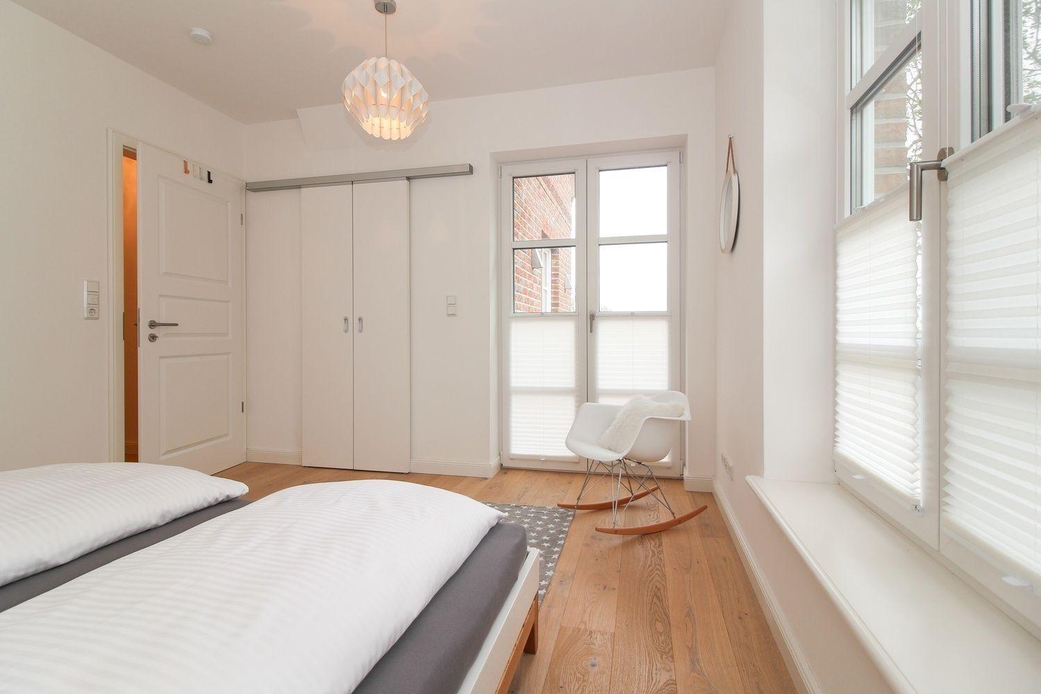 Im oberen Flur können Sie auf einem Chaiselounge unter den Dachfenstern ein Buch lesen oder in den Himmel von Greetsiel schauen. Von dort blicken Sie auch in ein kleines Butzenzimmer mit zwei gemütlichen Liegeplätzen, von wo aus Sie wiederum den Deich fest im Blick haben.