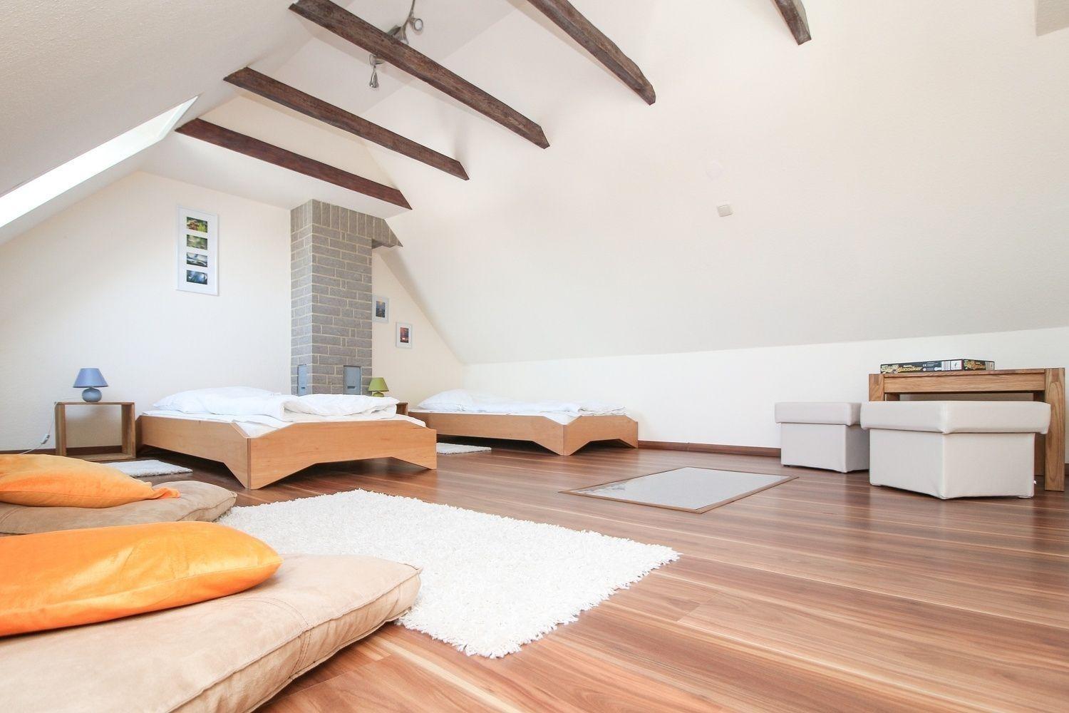 Sie besteht aus einem gemütlichen Wohn-Essbereich, einem Schlafzimmer mit Doppelbett im Obergeschoss, einem geräumigen Schlafzimmer mit zwei Einzelbetten im Dachgeschoss sowie einem Bad mit Dusche und WC und einem Aufgangsbereich zum Dachgeschoss.