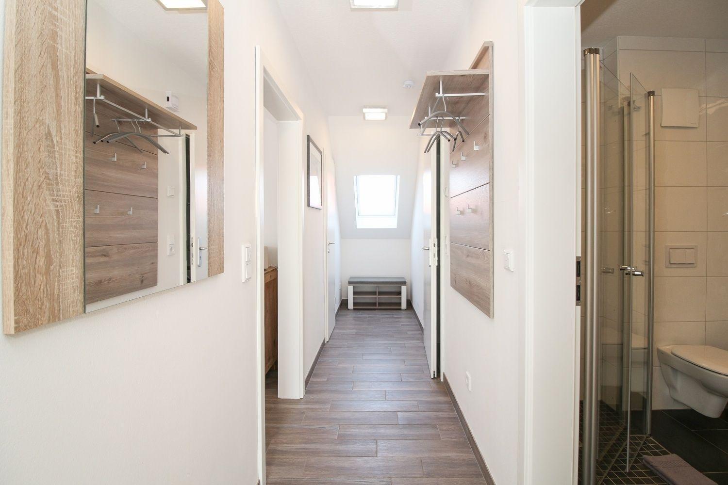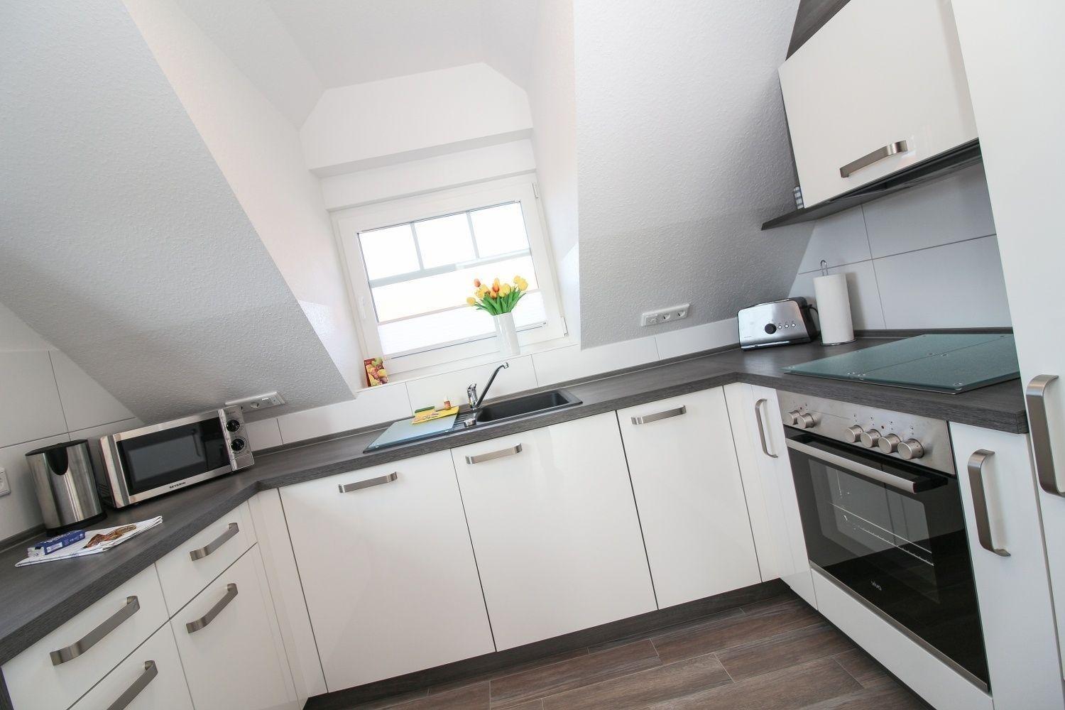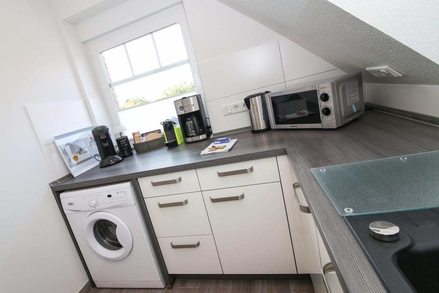 Die Wohnung verfügt über eine komplett eingerichtete, separate Küche mit sämtlichen Elektrogeräten (Spülmaschine, Waschmaschine, Nespresso-/Kaffeepad-/Filterkaffee-Maschine etc.), einem Wohn-/Essbereich, einem Schlafzimmer mit Doppelbett und einem Bad mit ebenerdiger Dusche. Im Dachgeschoss befindet sich ein weiteres Schlafzimmer mit zwei Einzelbetten (je 100x200cm). Außerdem ist ein zweites WC im Dachgeschoss vorhanden.