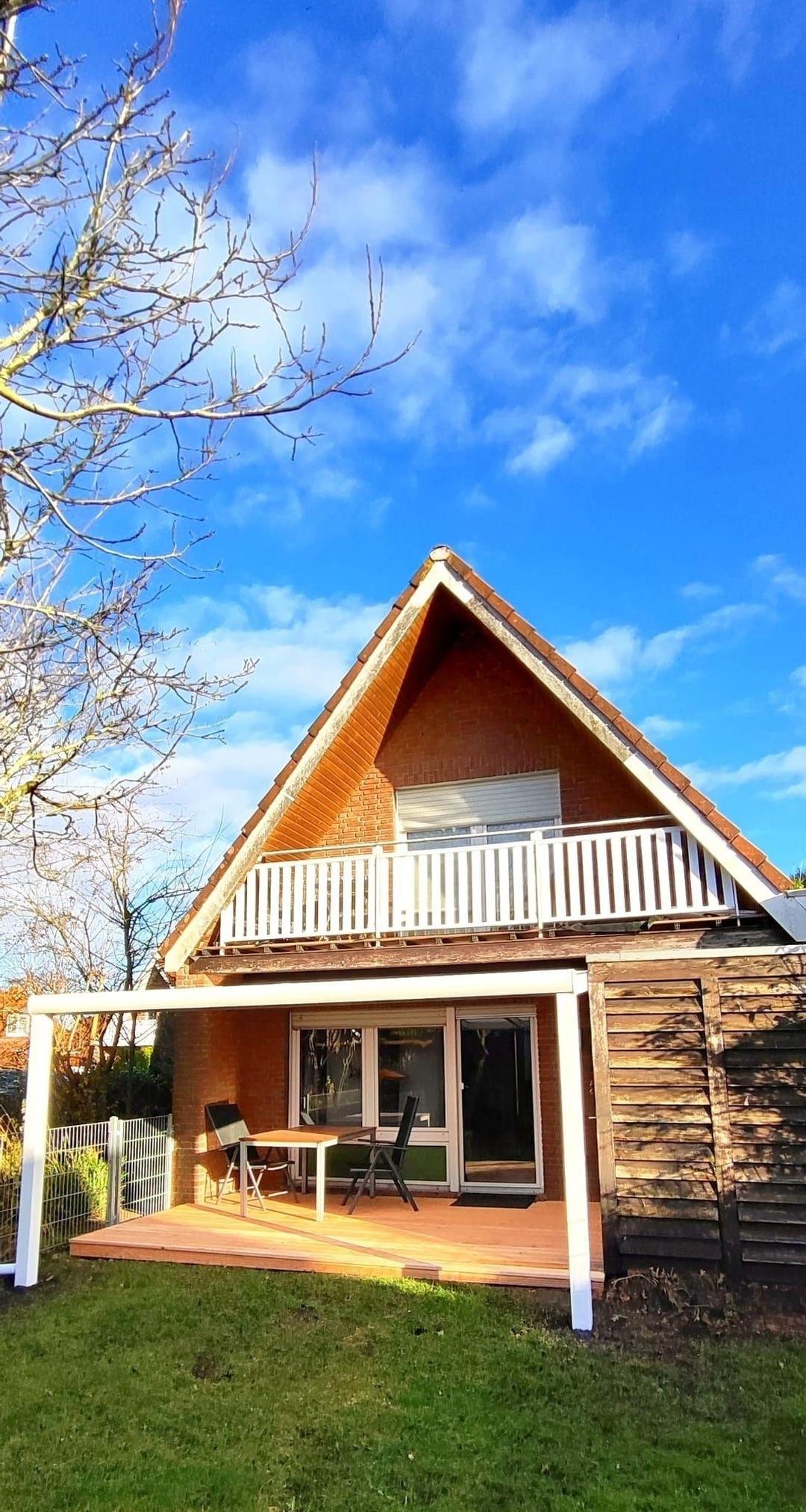 Die Ferienwohnung ist in zwei Etagen eingeteilt. Im Erdgeschoss befindet sich das Wohnzimmer, die Küche mit Essplatz, das Badezimmer mit Dusche und die überdachte Terrasse. Der Garten ist komplett eingezäunt.