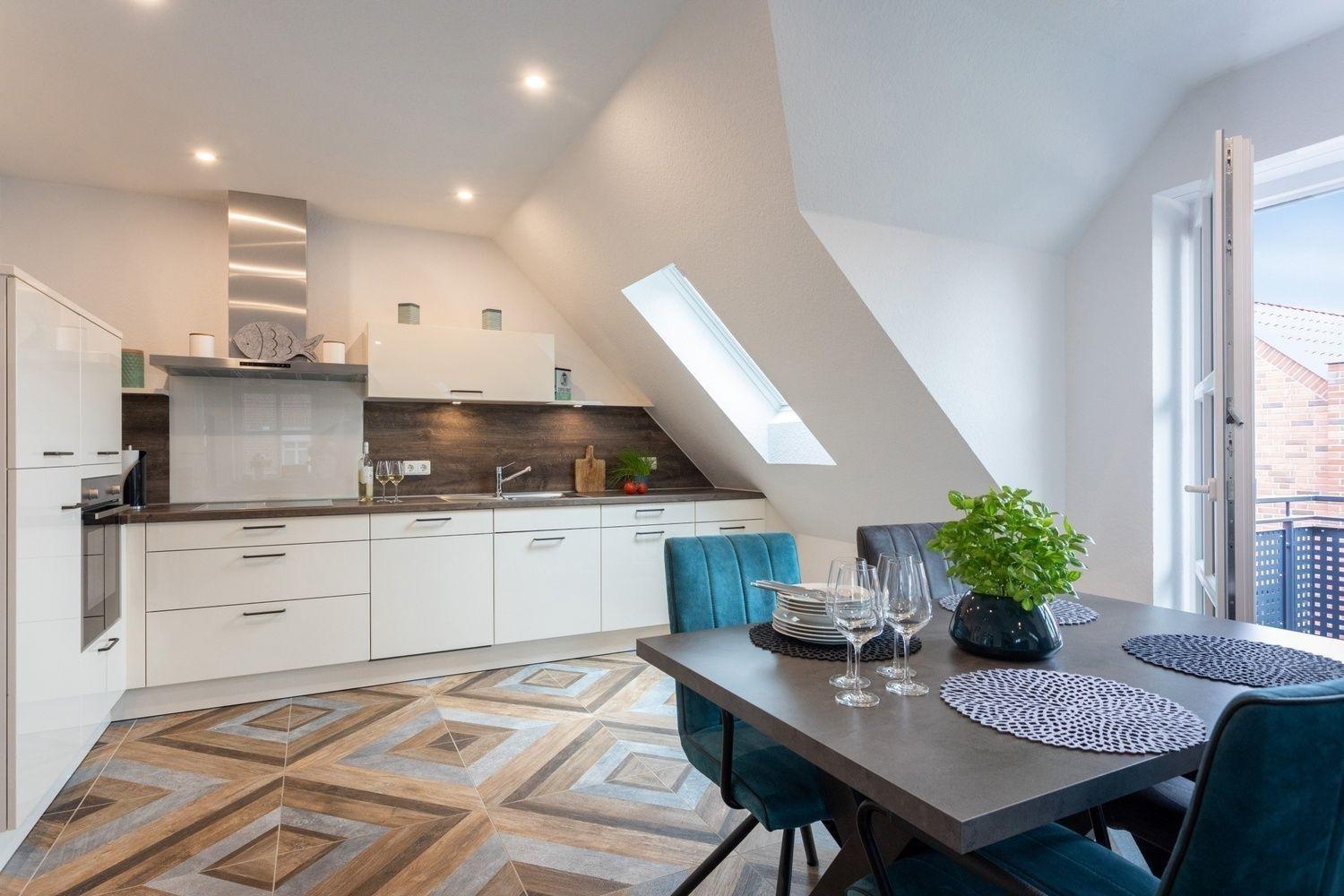 Ein stilvoll abgestimmter offener Wohn- und Essbereich mit voll ausgestatteter, hochwertiger Küche bildet den Mittelpunkt Ihres Domizils. Von hier aus geht es bei schönem Wetter raus auf den Süd-West-Balkon.