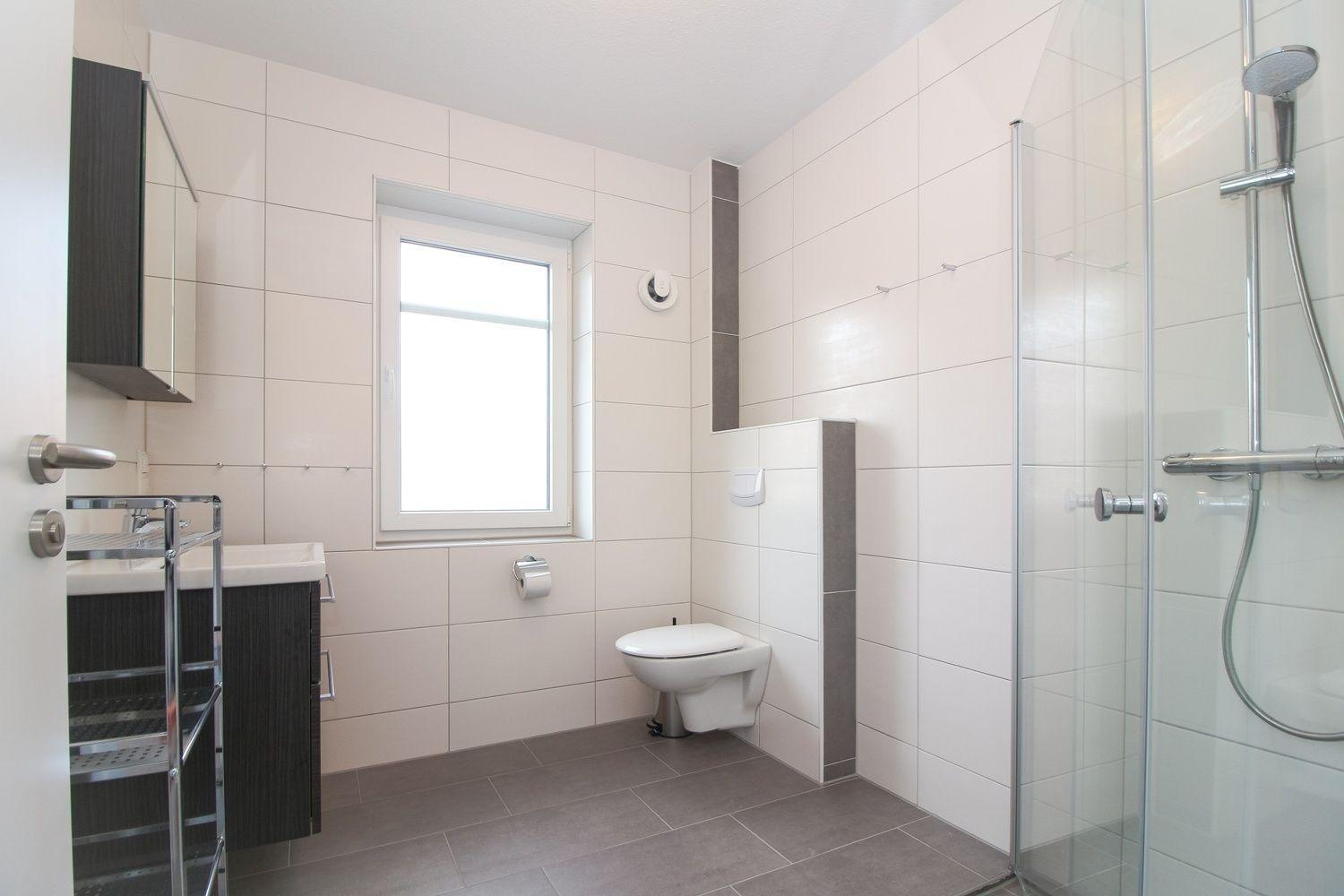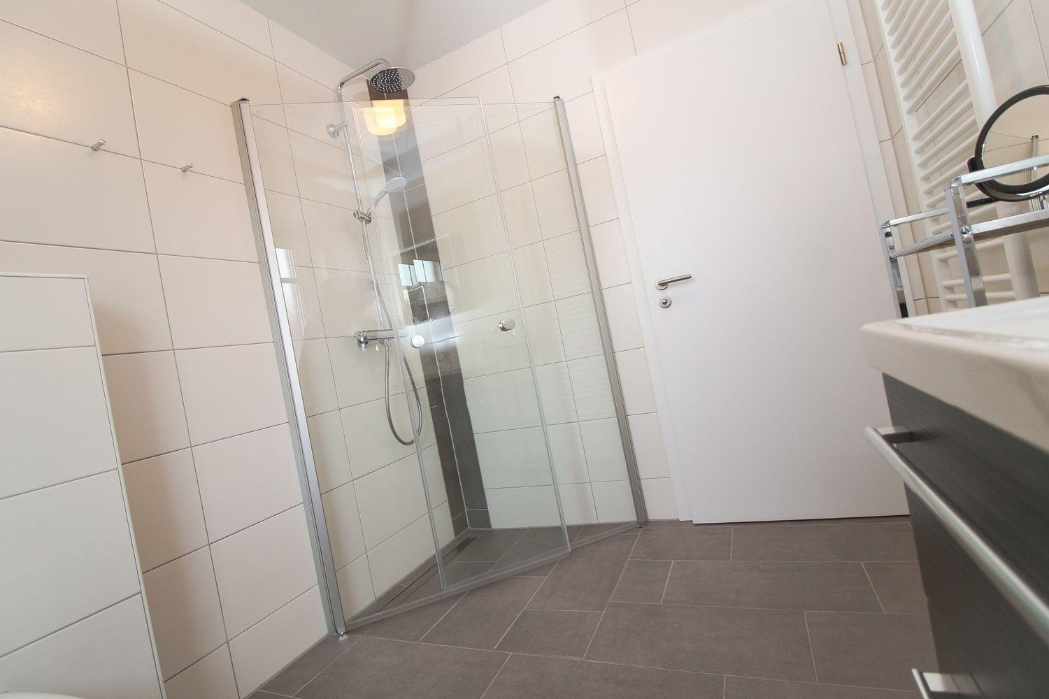 Das Bad ist mit einer großen, bodentiefen Dusche mit Regenbrause, einem Waschtisch mit Spiegel- und Unterschrank sowie einem Handtuchwärmer ausgestattet.