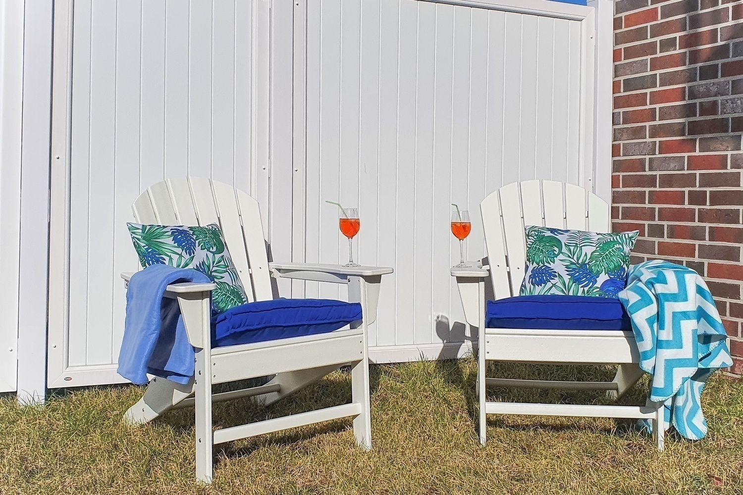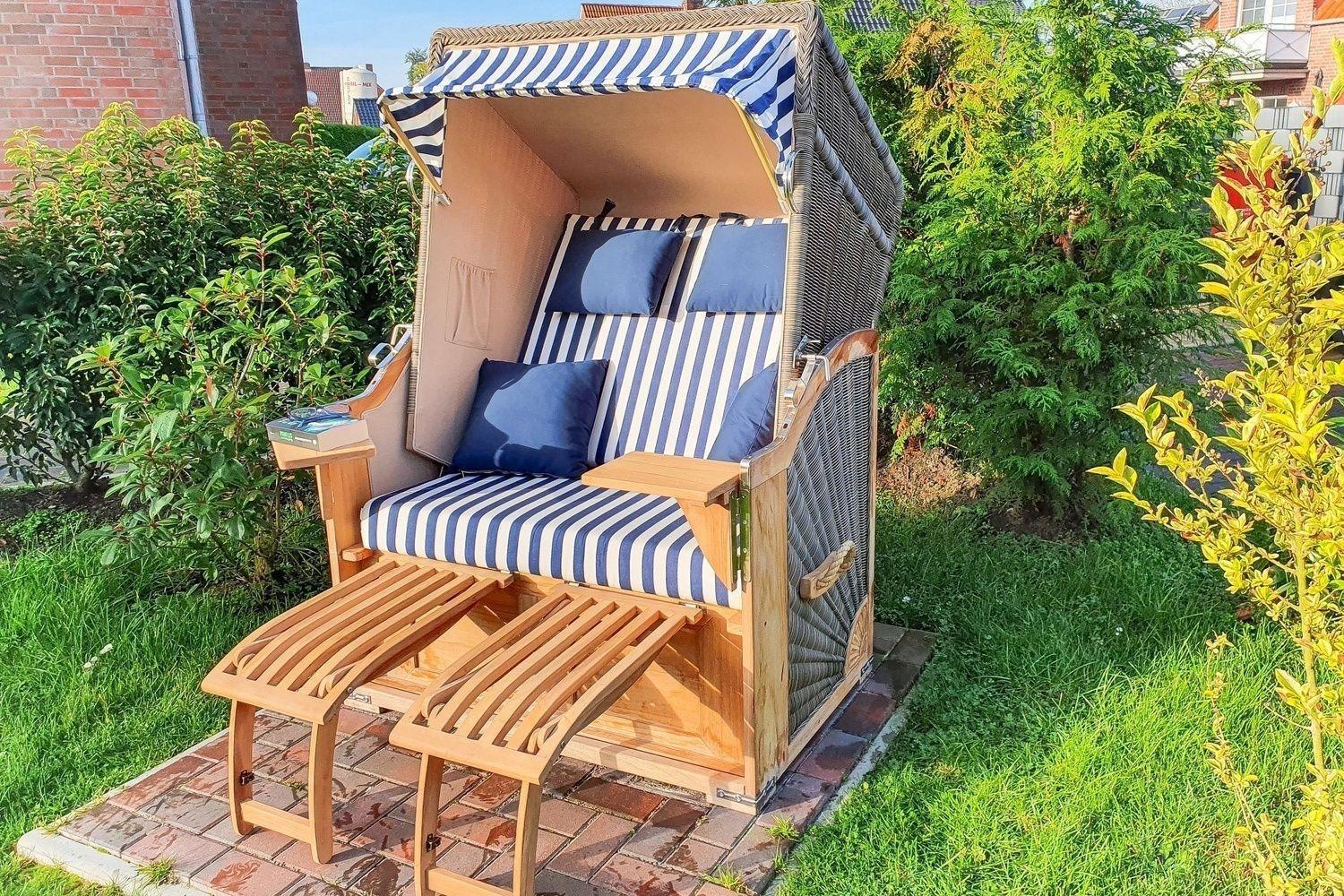 Die Terrasse am Haus sowie der Garten mit Rasenfläche bieten Ihnen vielfältige Gelegenheiten, Sonne und Nordseeluft zu genießen, sei es beim Ausruhen auf einem der beiden Adirondack-Chairs oder der Lektüre eines Buches im Strandkorb.