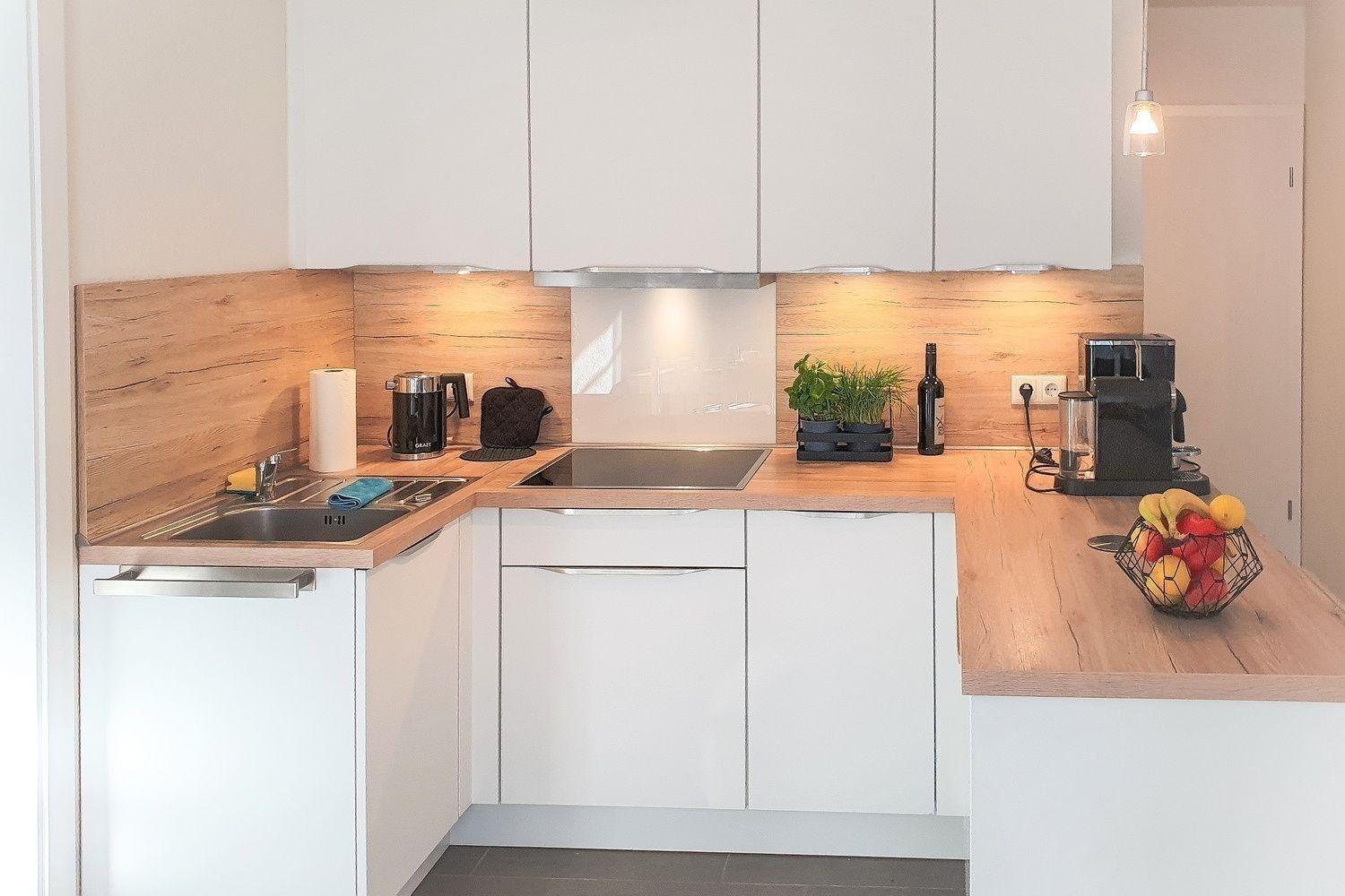 Angrenzend an den hellen Wohn-/Essbereich mit einer gemütlichen Eckcouch und einem Esstisch für 4 Personen befindet sich die modern und hochwertig ausgestattete offene Küche u.a. mit Induktionskochfeld, Backofen und Mikrowelle. Geschirr und Besteck sind auch bei Maximalbelegung ausreichend vorhanden.