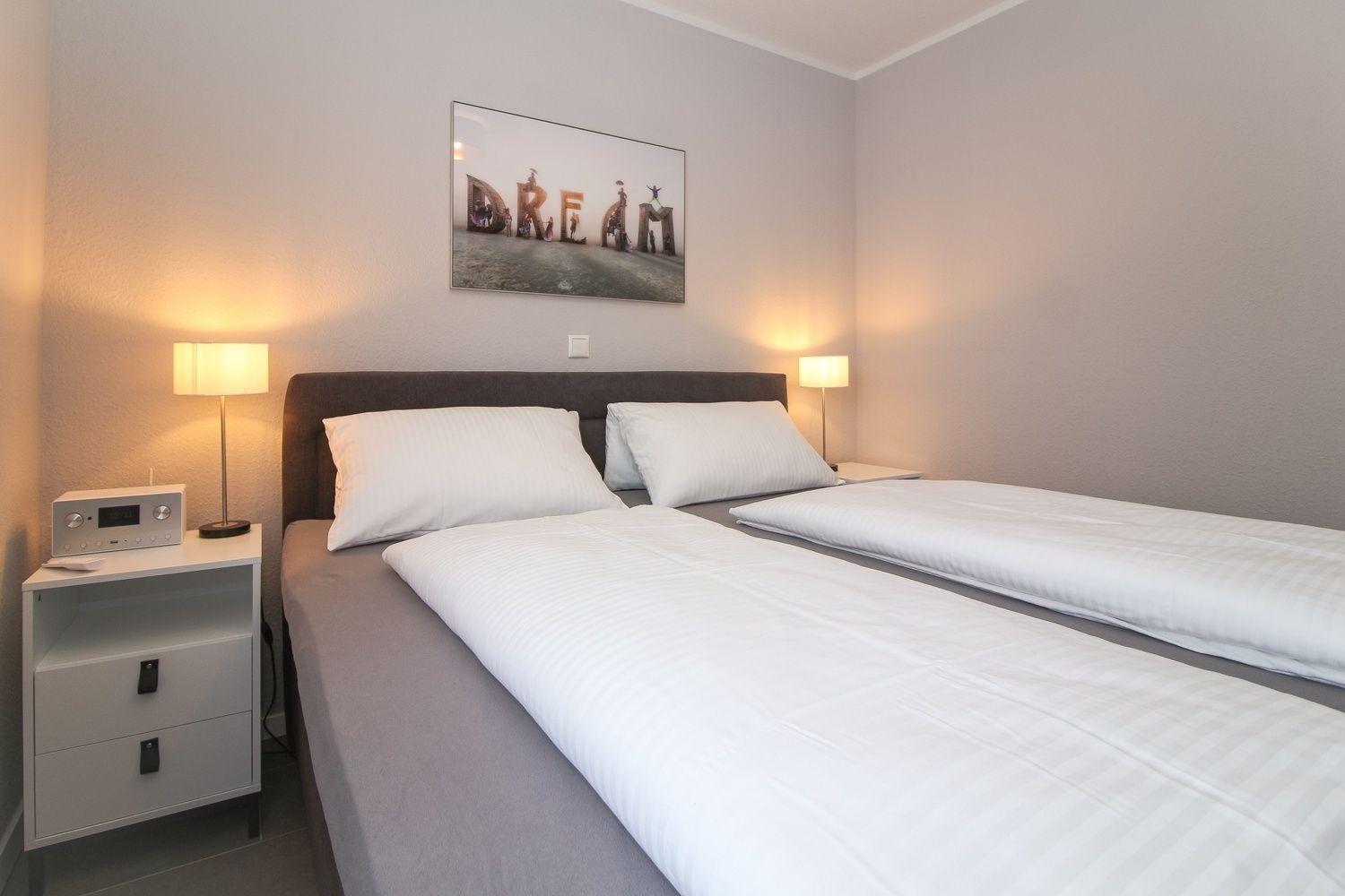 Die Wohnung verfügt über zwei Schlafzimmer, eines mit einem bequemen Boxpringbett, das andere mit zwei separaten Betten.