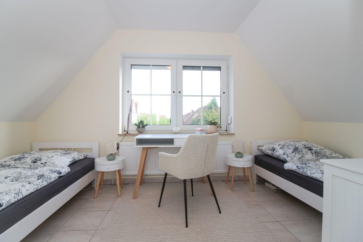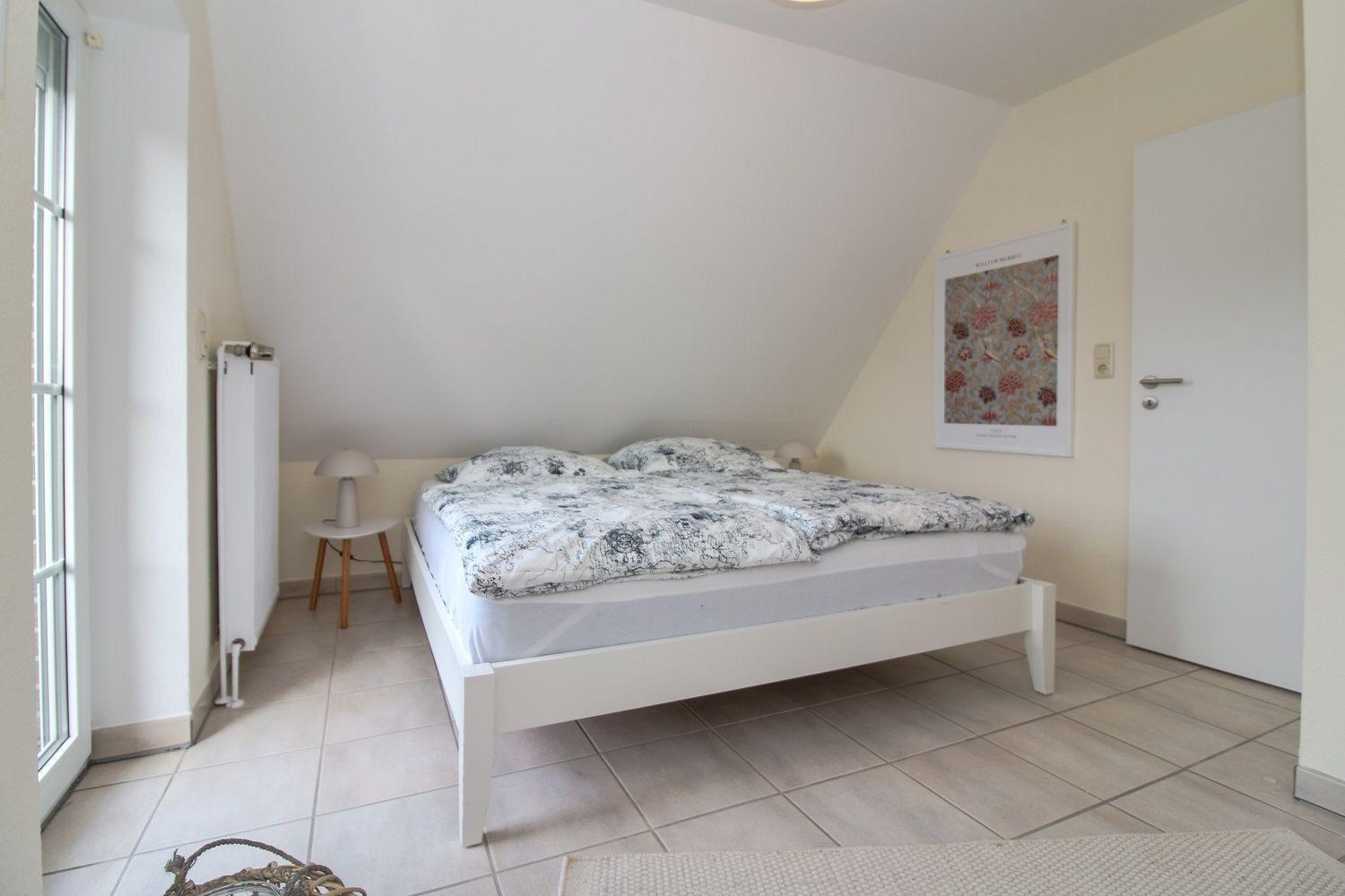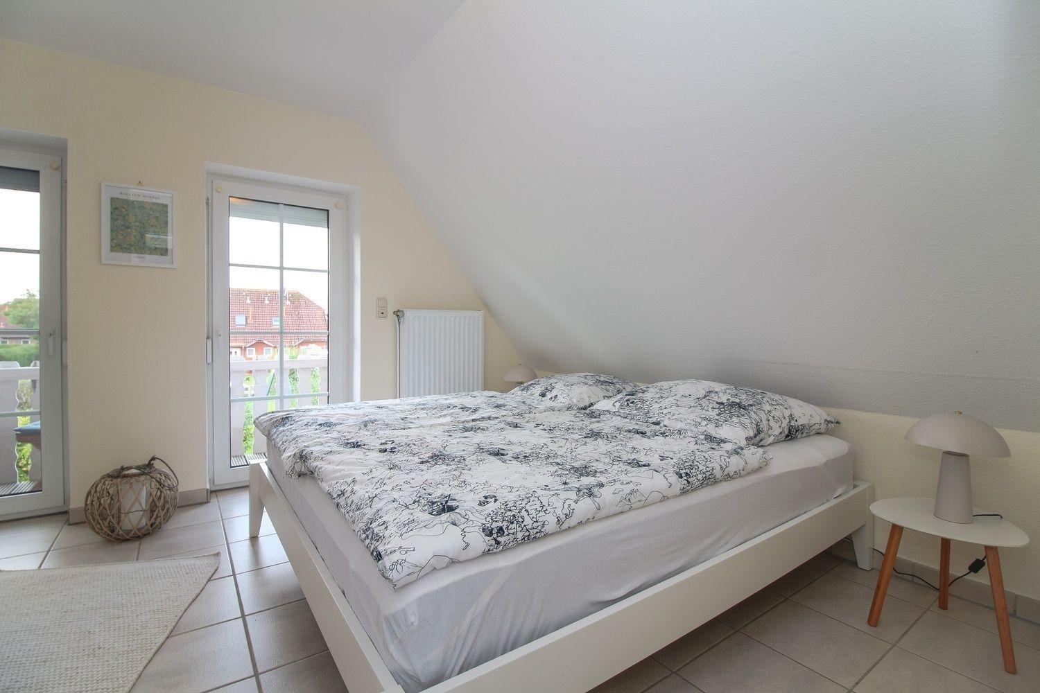 Über eine normale, gut begehbare halb gewendelte Treppe gelangst du zu den beiden gemütlichen Schlafzimmern. Eines der Schlafzimmer verfügt über einen Balkon, ausgestattet mit einem kleinen Tisch und zwei Stühlen. Das komfortable Doppelbett misst 180x200 cm. Im zweiten Schlafzimmer stehen dir zwei Einzelbetten (je 90x200 cm) zur Verfügung. Zwischen den Schlafzimmern befindet sich ein schönes Badezimmer mit Dusche.