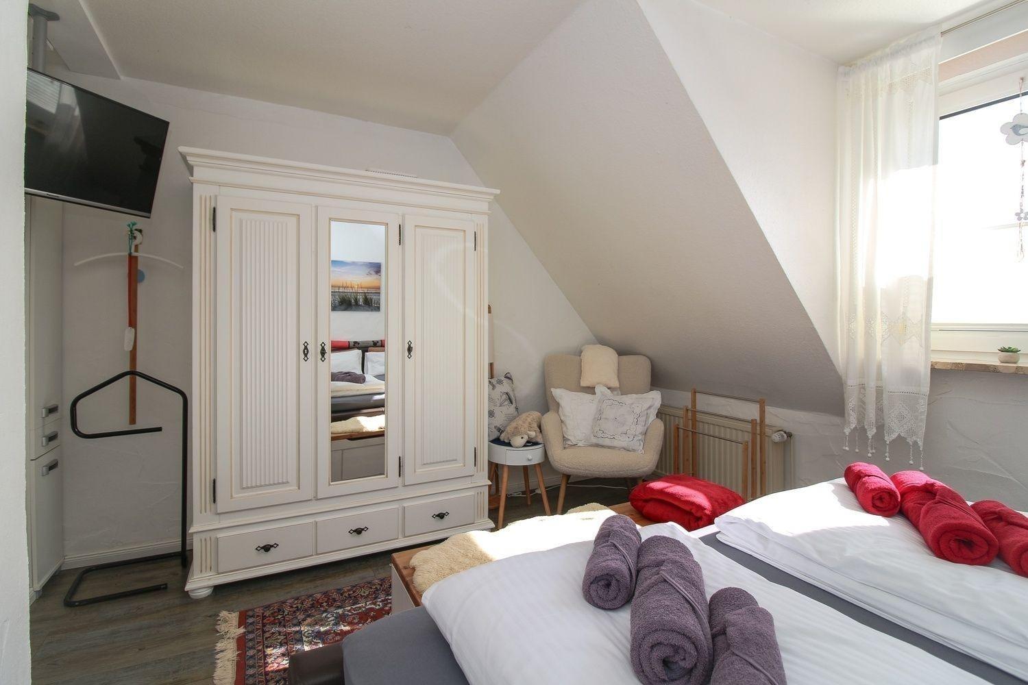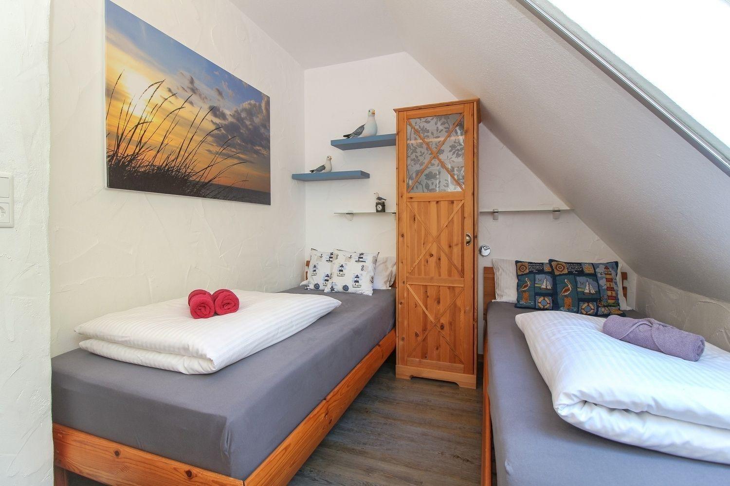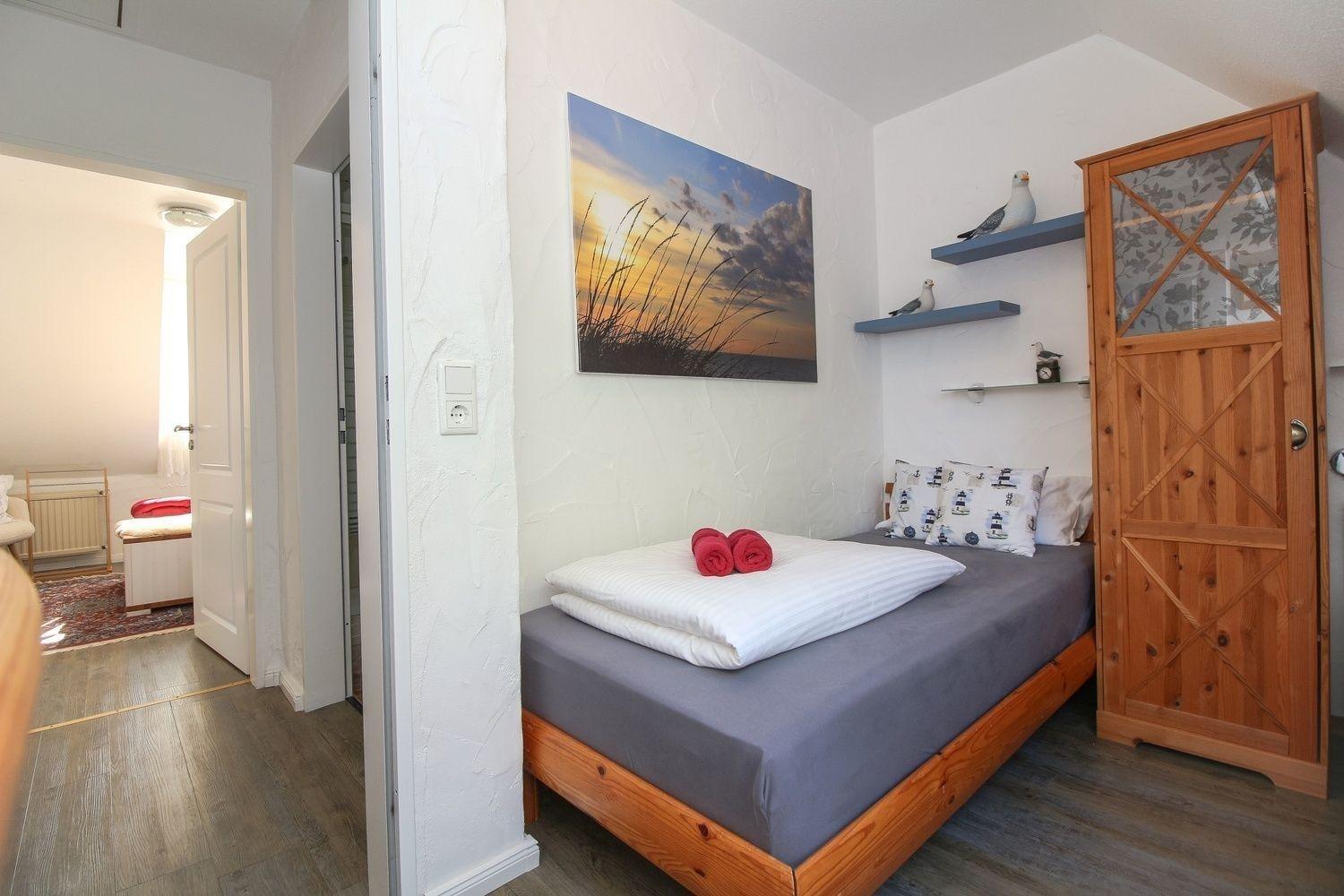 Mit zwei Schlafzimmern ist bei uns genug Platz. Das große Schlafzimmer ist zusätzlich mit einem TV und einer Leseecke ausgestattet. Der große Kleiderschrank bietet Ihnen ausreichend Platz. Das kleine Schlafzimmer verfügt über 2 Einzelbetten, Kleiderschrank und Kommode.