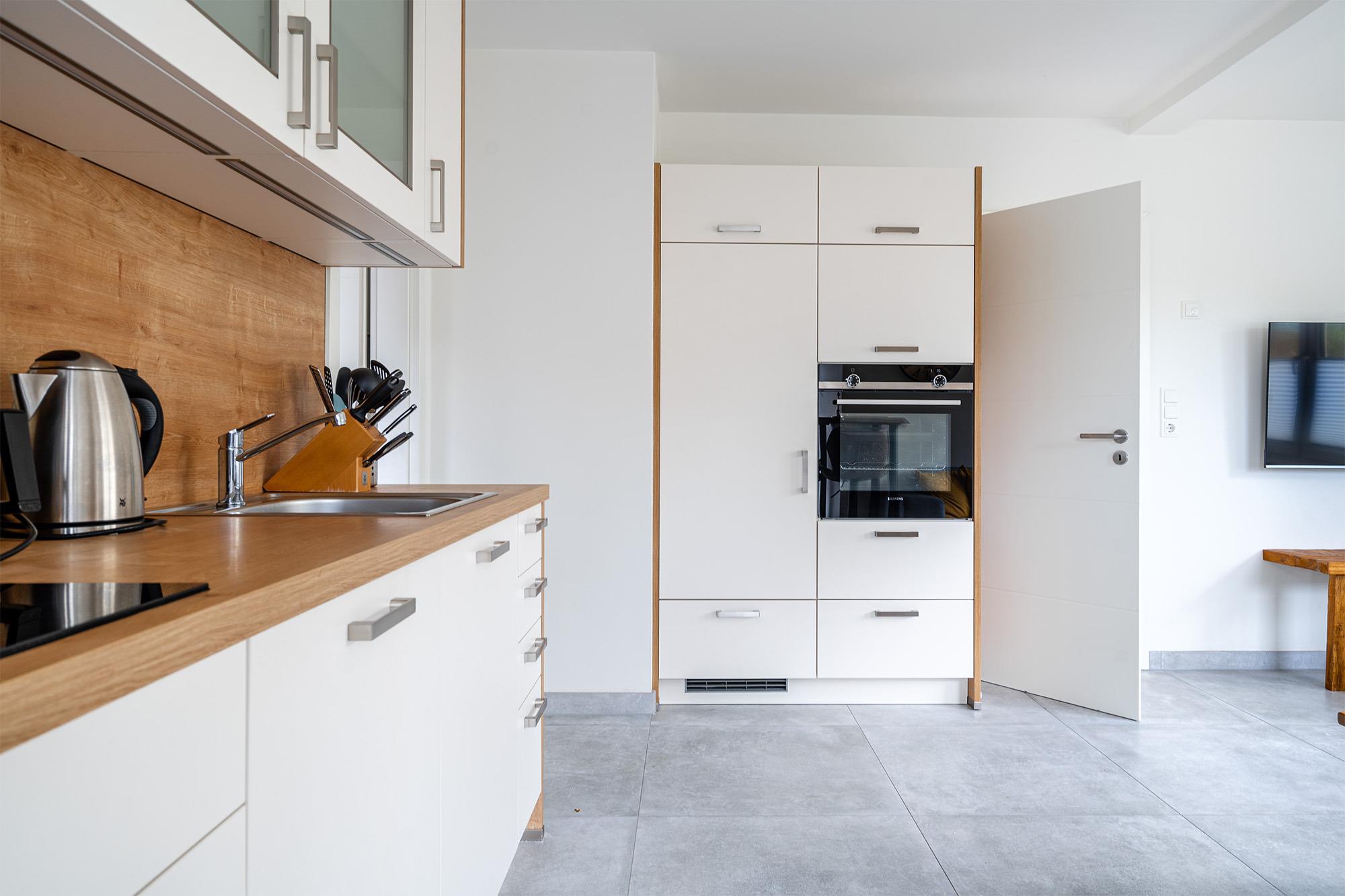 Unsere Wohnung "Die Zimmerei 2" bietet sich mit ihren etwa 70qm als perfektes Urlaubsdomizil an. Sehr zentral und dennoch ruhig in einer durchfahrtsbeschränkten Straße gelegen bietet sie einen hellen und modernen Wohn-Ess-Bereich mit einer großzügigen und voll ausgestatteten Küchenzeile, sowie einen Esstisch (Hochtisch). Sie finden außerdem zwei Schlafzimmer mit bequemen und hochwertigen Boxpspringbetten sowie ein geräumiges Tageslichtbad. Auch ein Abstellraum mit einem Waschtrockner ist vorhanden. Trotz der Lage im Obergeschoss bietet die Wohnung außerdem eine Sonnenterrasse, die sie über den Hauseingang und eine Treppe im Garten erreichen. Selbstverständlich steht Ihnen ein eigener Parkplatz am Haus zur Verfügung. Sollten Sie mit einem E-Auto anreisen, verfügt das Objekt auch über eine Ladesäule, die Sie hinzu buchen können.