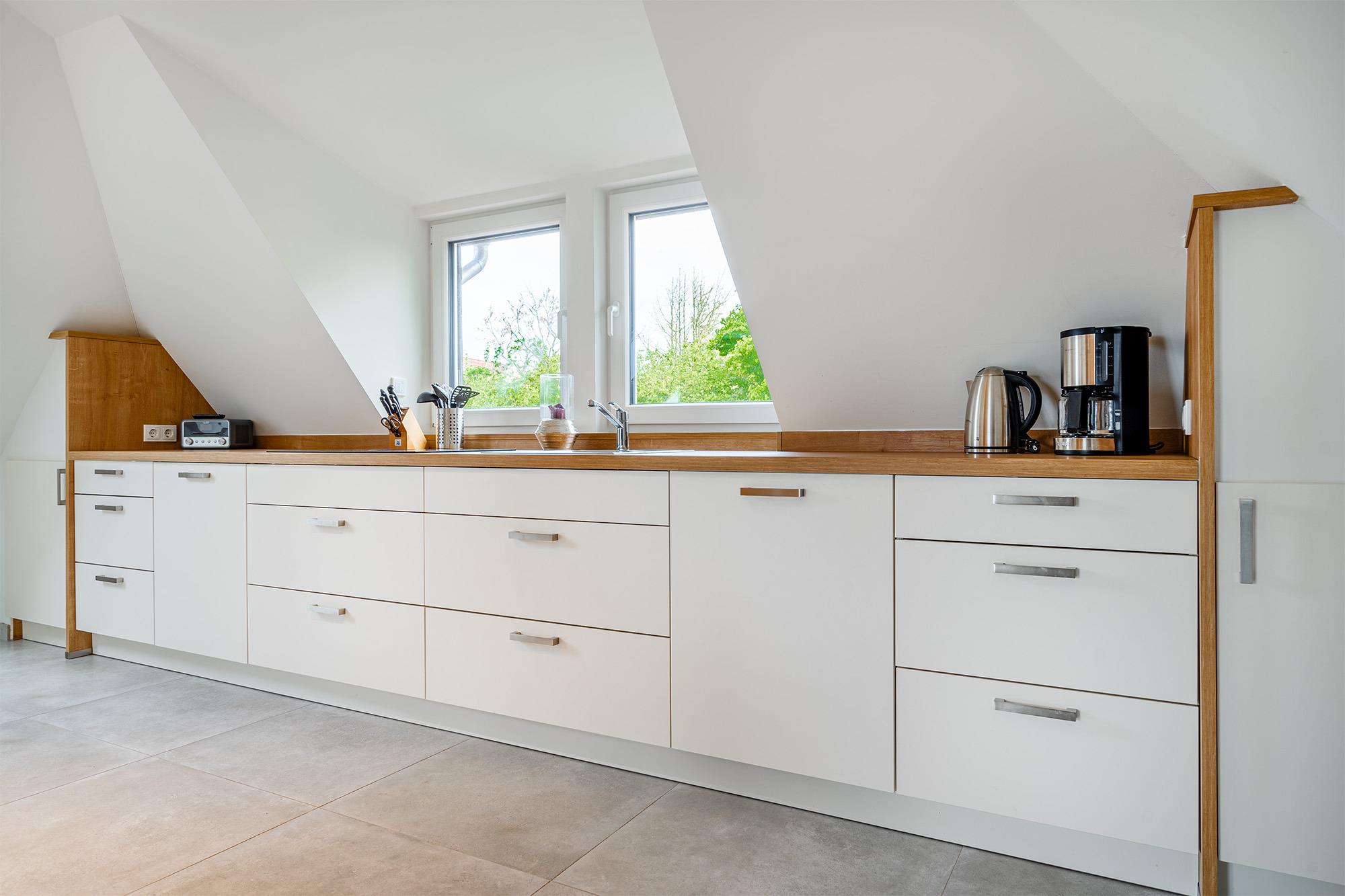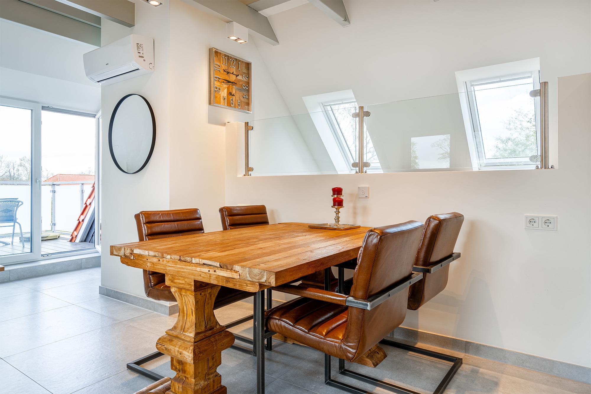 "Klein aber fein" - das beschreibt unsere Ferienwohnung "Die Zimmerei 3" am Besten. Diese erreichen Sie über einen separaten Eingang. Zentral aber dennoch ruhig gelegen, befindet sich die Wohnung im Dachgeschoss eines Hauses mit insgesamt fünf Wohneinheiten. Schon beim Hereintreten in diese gemütlich ausgestattete Wohnung kann man sich nur wohlfühlen! Im etwa 35qm großen und lichtdurchfluteten Wohnraum, der mit einem offenen Schlaf- und Wohnbereich im Loftstil gestaltet wurde finden Sie eine vollausgestattete Küche, einen Esstisch und ein bequemes Boxspringbett. Das Tageslichtbad ist praktisch geschnitten und bietet eine bodengleiche Dusche, sowie eine Waschmaschine. Vom Wohnbereich aus gelangen Sie auf die Dachterrasse mit Blick über Greetsiel- Platz zum Frühstücken, zum Sonnen und zum frische Nordluft tanken. Selbstverständlich steht Ihnen ein eigener Parkplatz am Haus zur Verfügung. Sollten Sie mit einem E-Auto anreisen, verfügt das Objekt auch über eine Ladesäule, die Sie hinzu buchen können.