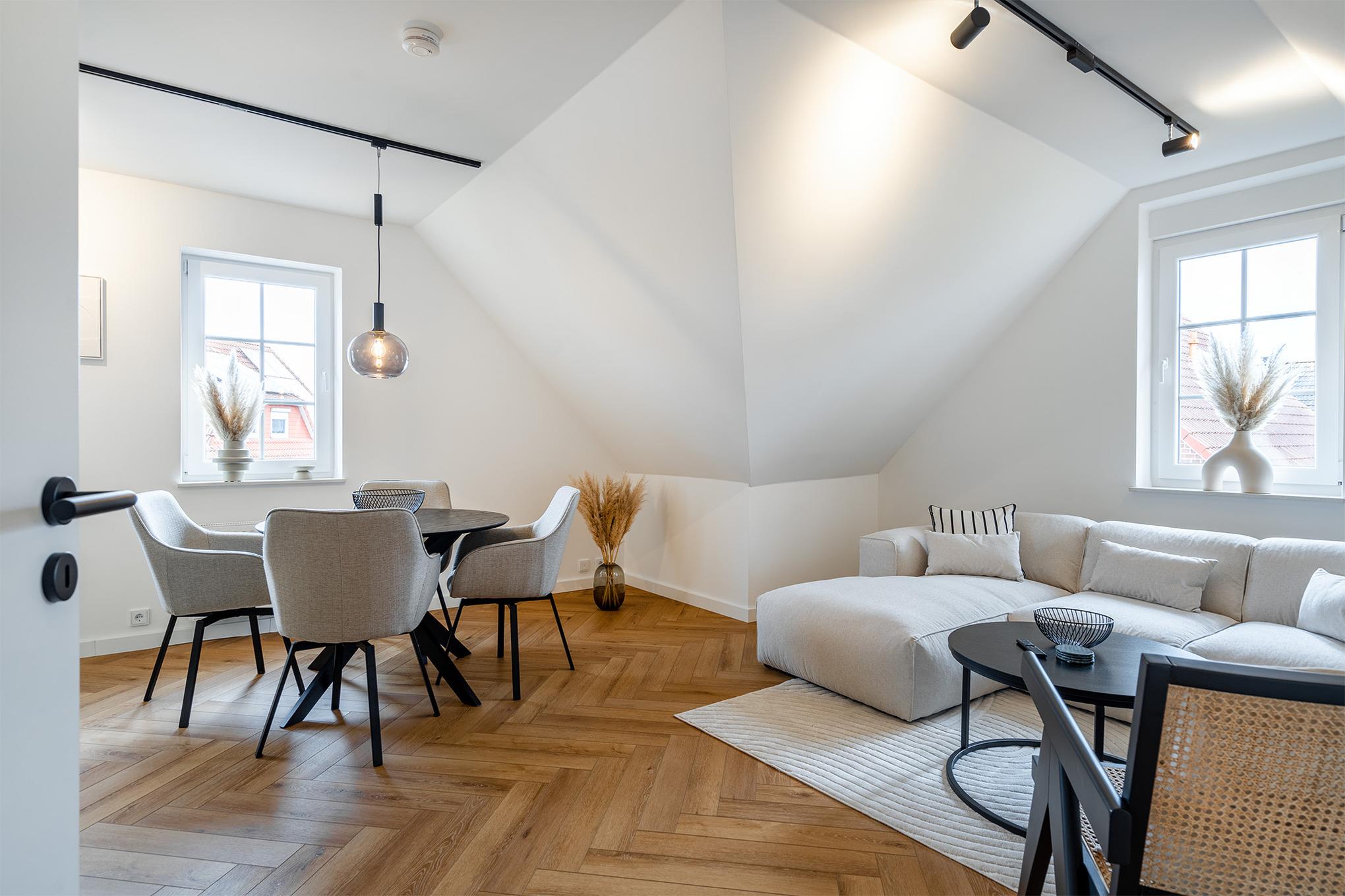 In ruhiger Lage, in der idyllischen Peter-Barfs-Straße, erwartet Sie unsere Obergeschoss Wohnung "FriesenHUUSKE". Vor wenigen Jahren wurde diese komplett saniert und mit viel Liebe zum Detail gestaltet und ausgestattet. Auf rund 60qm bietet das "FriesenHUUSKE" genügend Platz für Paare, kleine Familien oder Freunde, die einen entspannten Urlaub an der Nordsee verbringen möchten. Die Wohnung verfügt über zwei gemütliche Schlafzimmer mit hochwertigen Doppelbetten, ein helles Tageslichtbad mit ebenerdiger Dusche sowie einen offenen Wohn- und Essbereich. Hier finden Sie eine gemütliche Wohnlandschaft sowie eine voll ausgestattete und hochwertige Küchenzeile.[nbsp] Helle Räume, geschmackvolle Einrichtung und eine hochwertige Ausstattung sorgen dafür, dass Sie sich von Anfang an wohlfühlen. Die Wohnung bietet eine Terrasse, die über den Hauseingang erreichbar ist und entspannte Stunden bei frischer Luft ermöglichen (nicht direkt an die Wohnung angeschlossen). Ihren PKW parken Sie auf dem eigenen Parkplatz vor Ort und Ihre Fahrräder finden Platz im Abstellraum direkt am Haus.