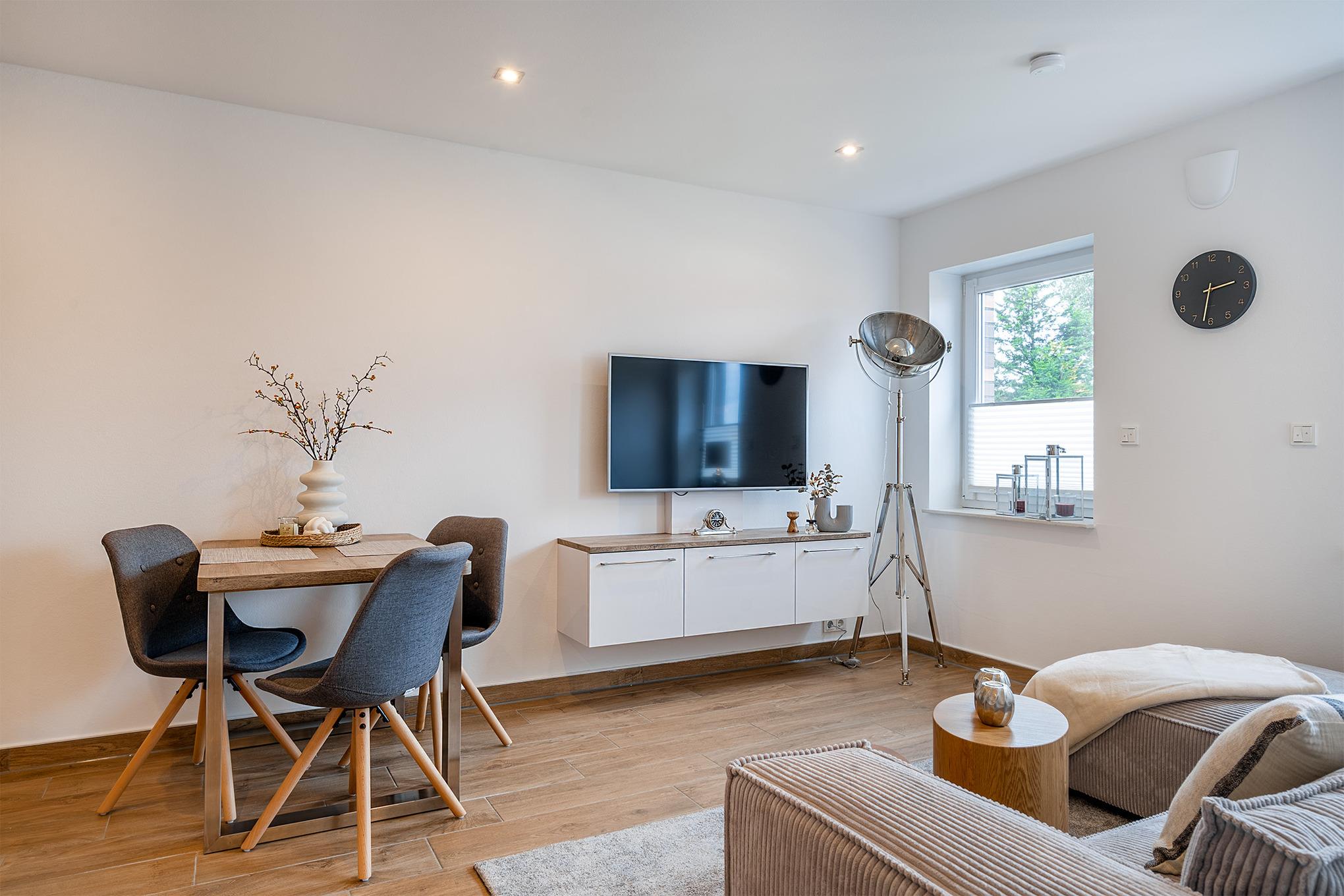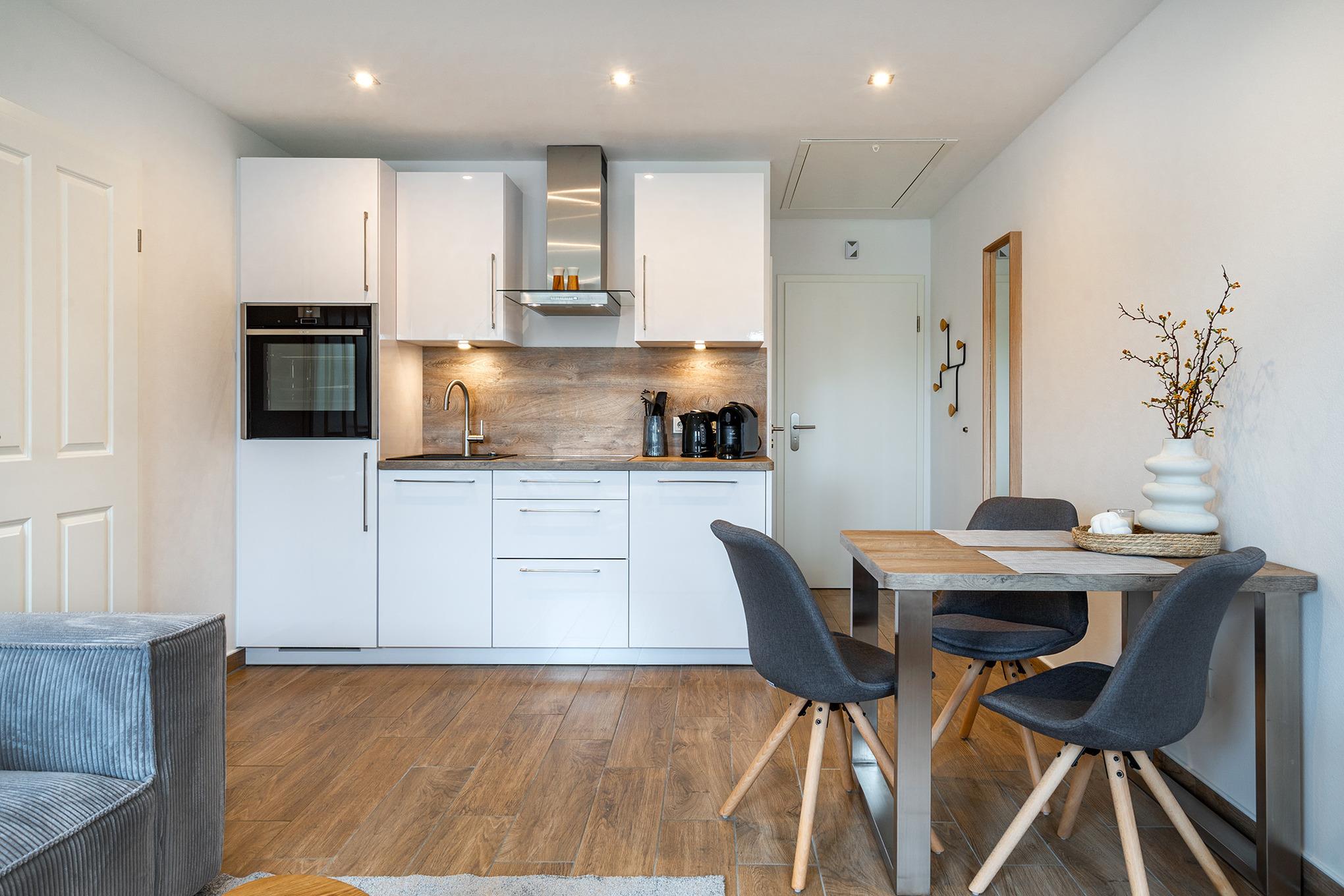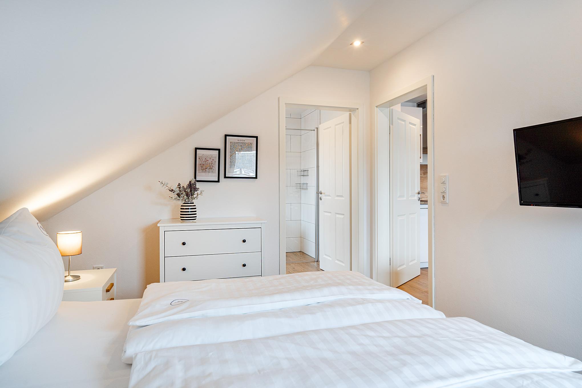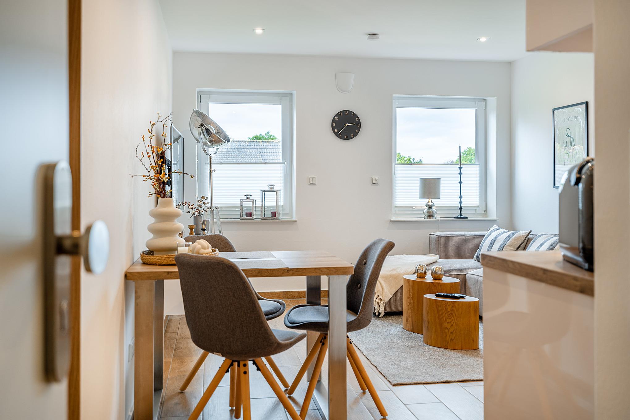 "Klein aber fein" - das beschreibt unsere Ferienwohnung "Friesenstuuv" am Besten (ehemals "Paul"). Ruhig in der Boomstroat gelegen, befindet sich die Wohnung im Obergeschoss eines Hauses mit insgesamt sechs Wohneinheiten. Schon beim Hereintreten in diese gemütlich ausgestattete Wohnung kann man sich nur wohlfühlen! Im Wohn-Ess-Bereich finden Sie eine voll ausgestattete Küche, einen Esstisch und ein bequemes Sofa. Das Tageslichtbad ist großzügig geschnitten und bietet eine bodengleiche Dusche. Neben dem Schlafzimmer finden Sie in der Wohnung außerdem einen sehr geräumigen Abstellraum. Selbstverständlich verfügt die Wohnung auch über einen eigenen PKW-Stellplatz im Hof, sowie ein Gartenhaus mit Abstellmöglichkeiten für Fahrräder.