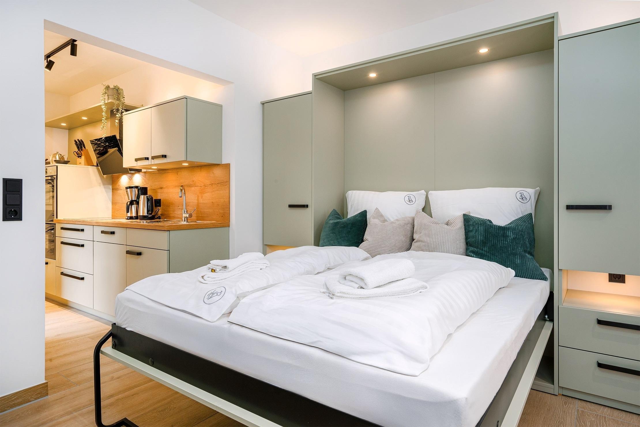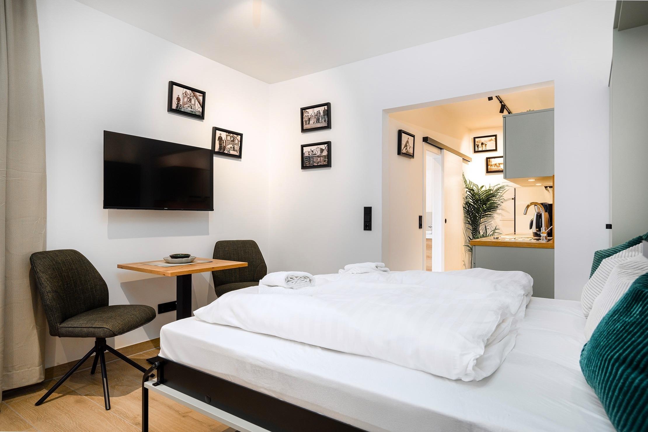 Das geschickt geschnittene Apartment "In't Dörp 3" liegt in der Mühlenstraße, direkt im Herzen des idyllischen Fischerdorfes. Auf etwa 25qm bietet es eine clevere Raumaufteilung, die modernes Design mit Gemütlichkeit vereint. Der Wohn-Schlafraum ist komfortabel gestaltet und verfügt über eine einladende Sitzecke mit Sesseln sowie einen Esstisch. Ein besonderes Highlight ist das praktische Schrankbett, das tagsüber dezent verschwindet und so für noch mehr Platz und Komfort sorgt. Neben der hochwertigen, großzügig angelegten Einbauküche bietet das Apartment ein Tageslichtbad mit einer ebenerdigen Dusche. Ein weiteres Plus ist zum Einen die private Terrasse vor dem Haus und zum Anderen der eigene Parkplatz, der Ihnen trotz der zentralen Lage hinter dem Haus zur Verfügung steht. Auch ein Abstellraum für Fahrräder gehört zu den Annehmlichkeiten. Die Lage ermöglicht es Ihnen, die malerischen Gassen Greetsiels, den Hafen und alle wichtigen Anlaufpunkte in nur wenigen Minuten zu Fuß zu erreichen – ideal für Gäste, die gerne mittendrin wohnen!