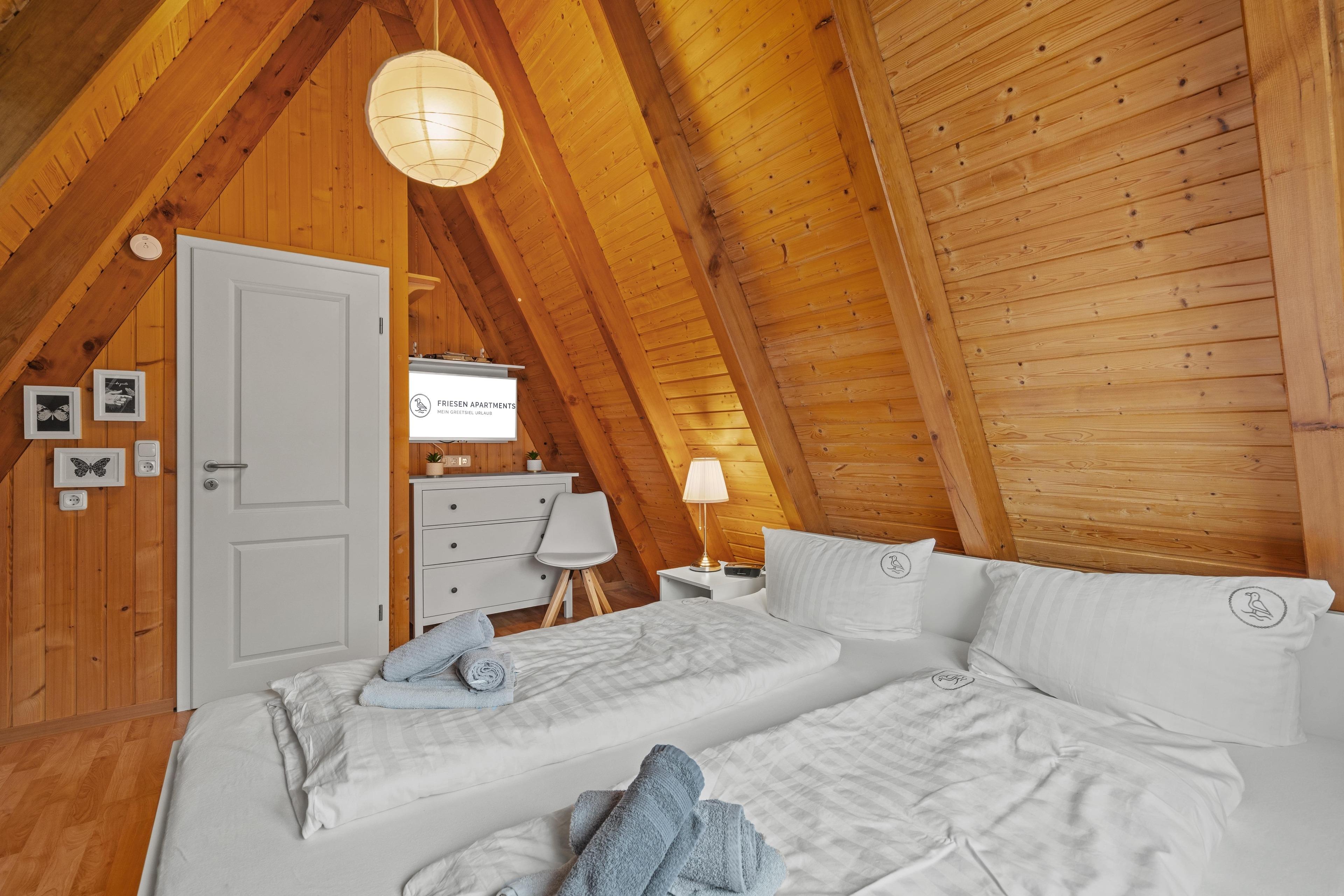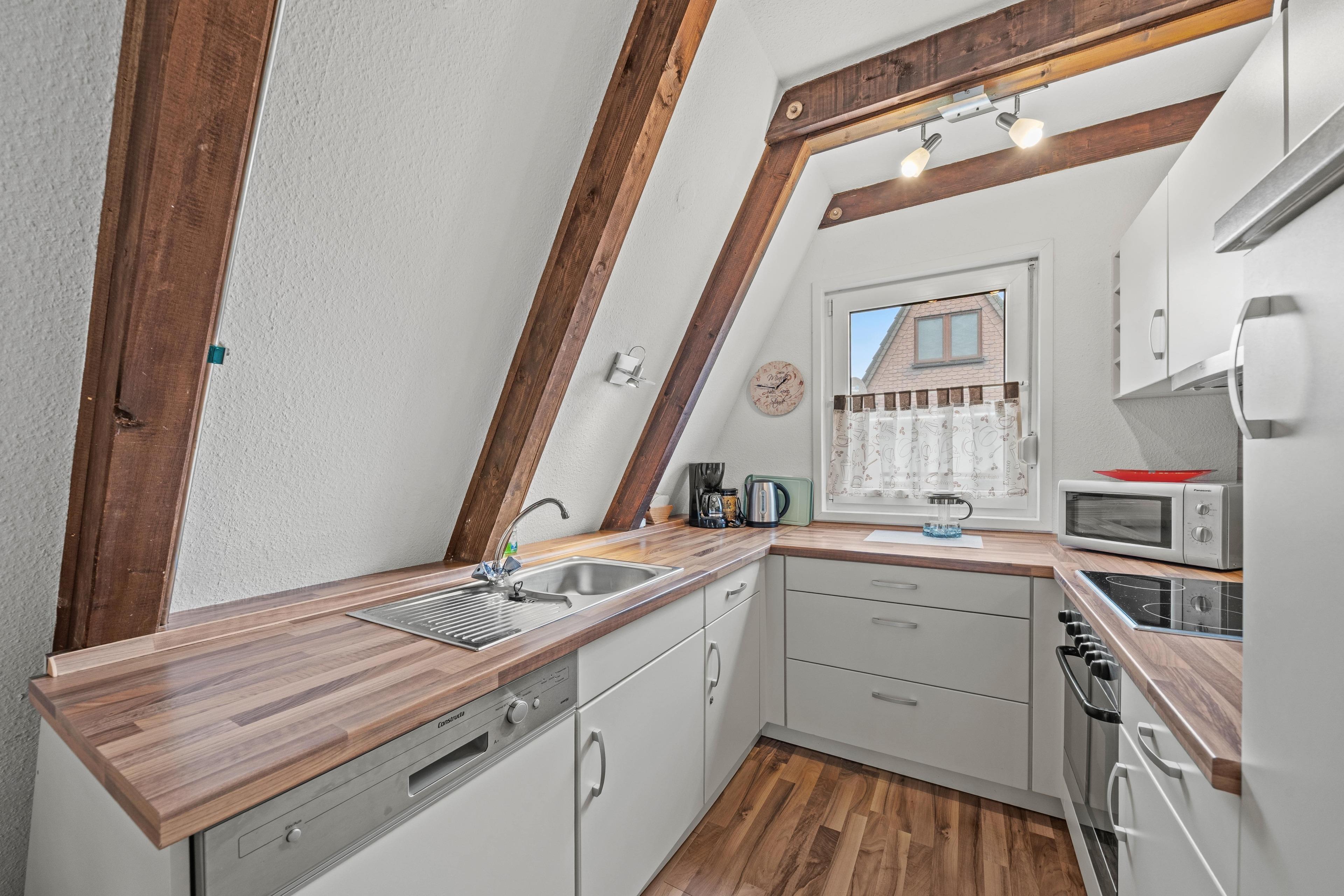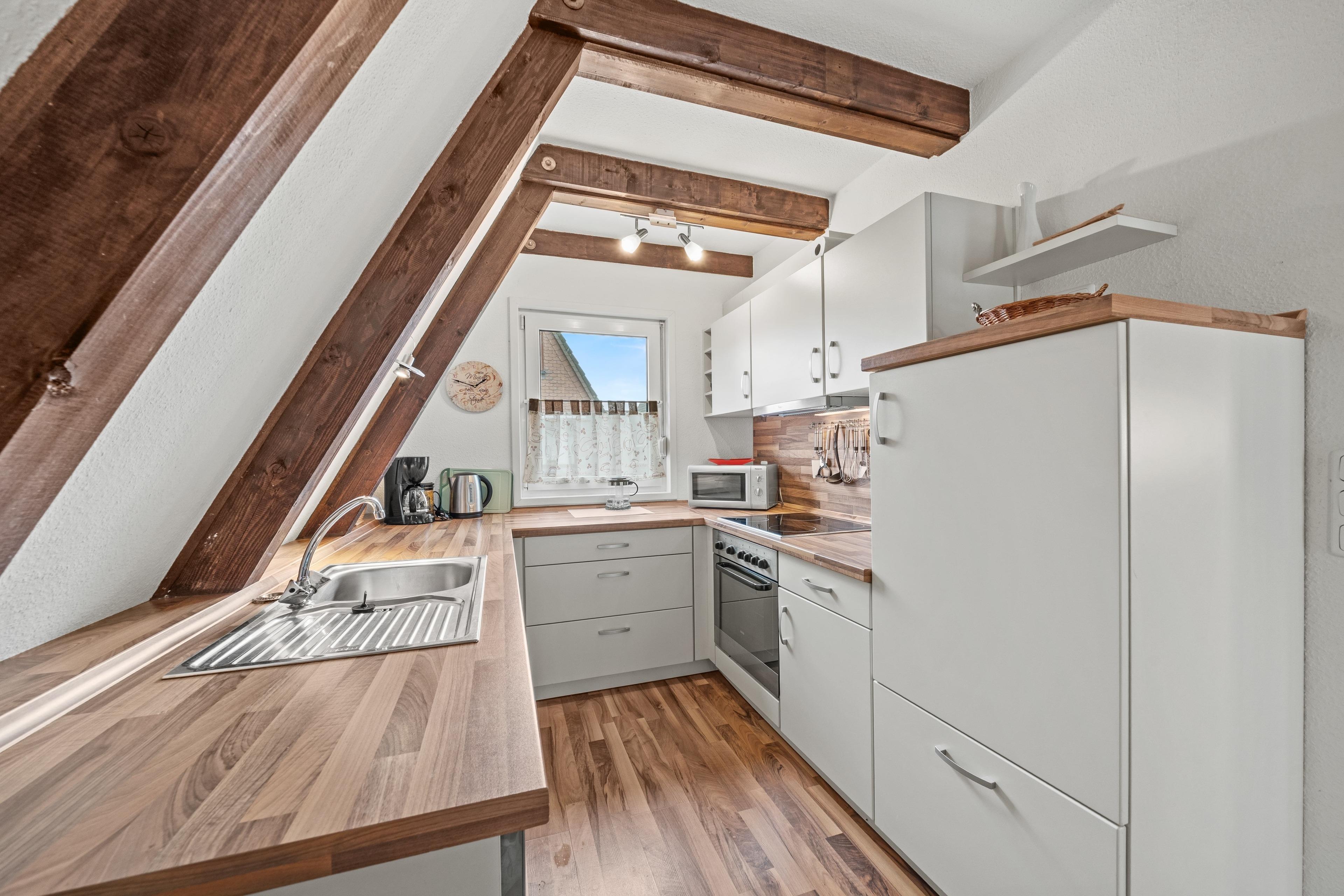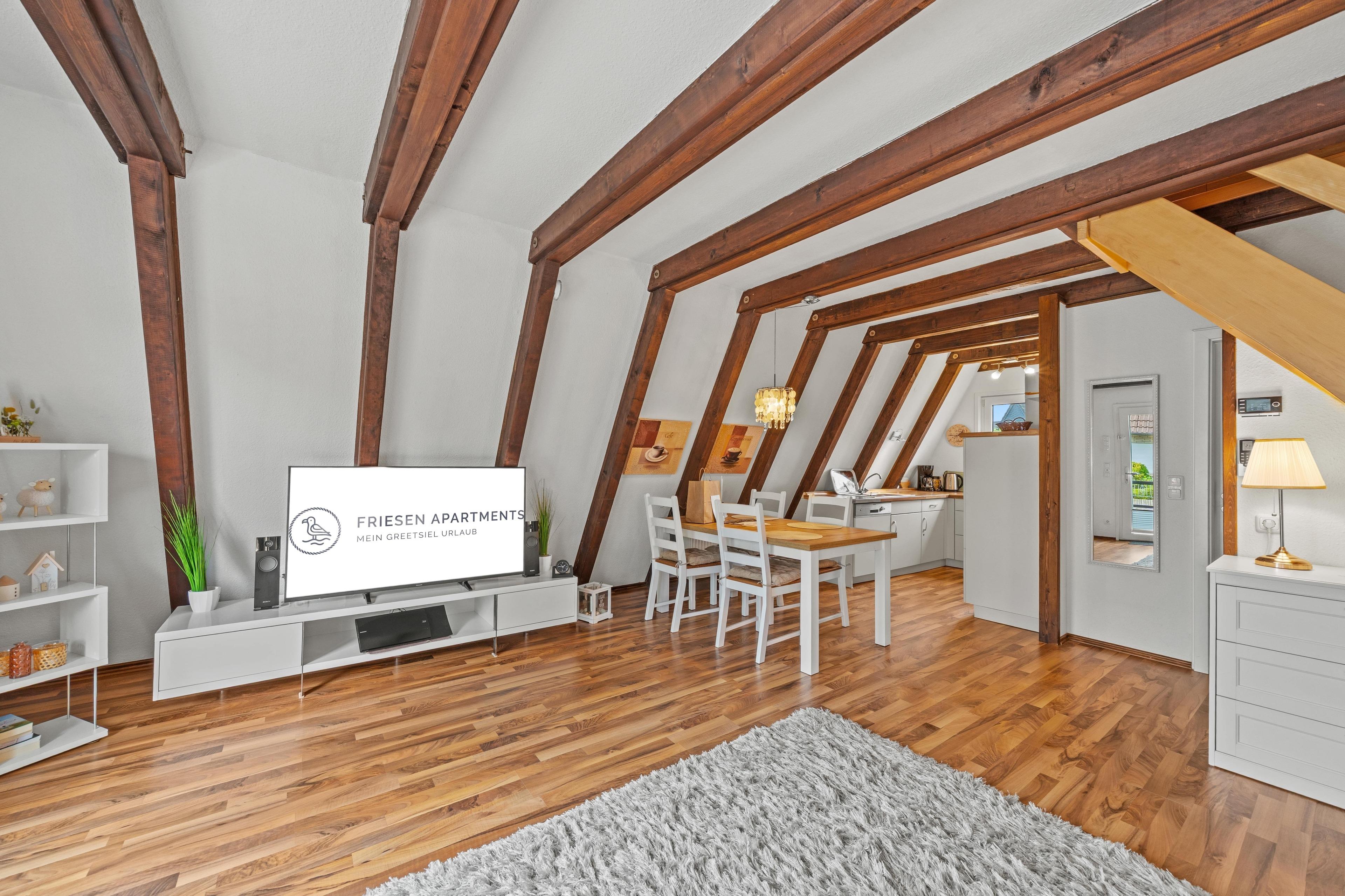 Nur einen Katzensprung vom Deich entfernt, heißt Sie unser Ferienhaus "Johanns Huus" in Greetsiel herzlich willkommen. Unser charmantes Nurdachhaus im typischen ostfriesischen Stil bietet auf zwei Etagen alles, was Sie für einen entspannten Nordseeurlaub brauchen. Im Erdgeschoss erwartet Sie ein lichtdurchfluteter Wohn- und Essbereich mit Sofalandschaft, Essbereich und einer voll ausgestatteten Küchenzeile. Die freigelegten Holzbalken verleihen dem Haus einen warmen, gemütlichen Charme und schaffen eine behagliche Atmosphäre. Vom Wohnraum aus gelangen Sie direkt auf die Terrasse, die Zugang zum Garten bietet. Außerdem befindet sich im Erdgeschoss das großzügige Tageslichtbad mit Badewanne und Dusche. Im Obergeschoss finden Sie zwei helle Schlafzimmer mit Doppelbetten, die durch die charakteristische Holzdecke ebenfalls eine wohnliches Gefühl bieten. Neben einem reservierten Parkplatz verfügt das Haus ebenfalls über einen Abstellraum im Garten. Dank der guten Lage wohnen Sie hier ruhig aber dennoch nah zum Deich, sodass der Hafen nach einem kurzen Spaziergang schnell erreicht ist.