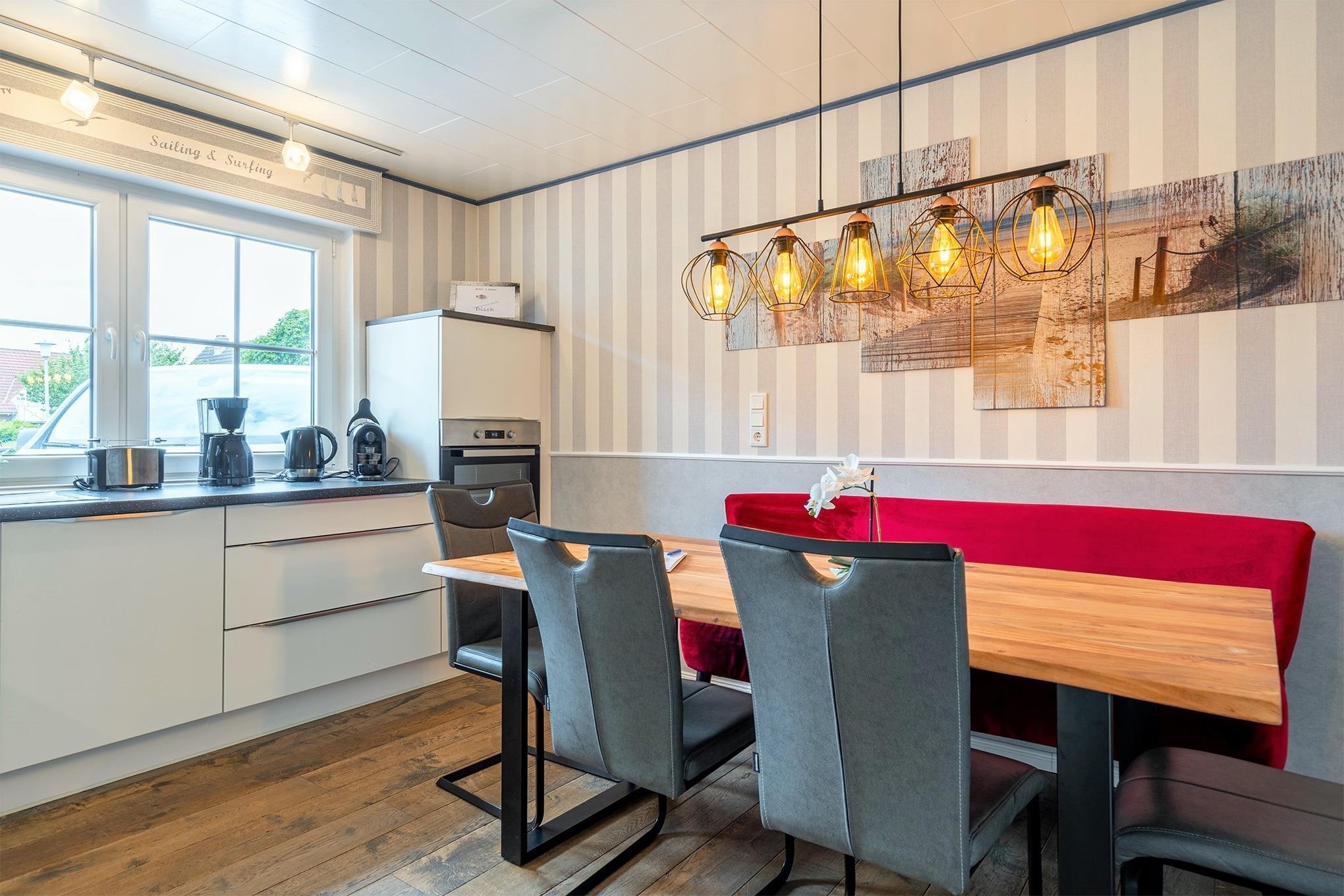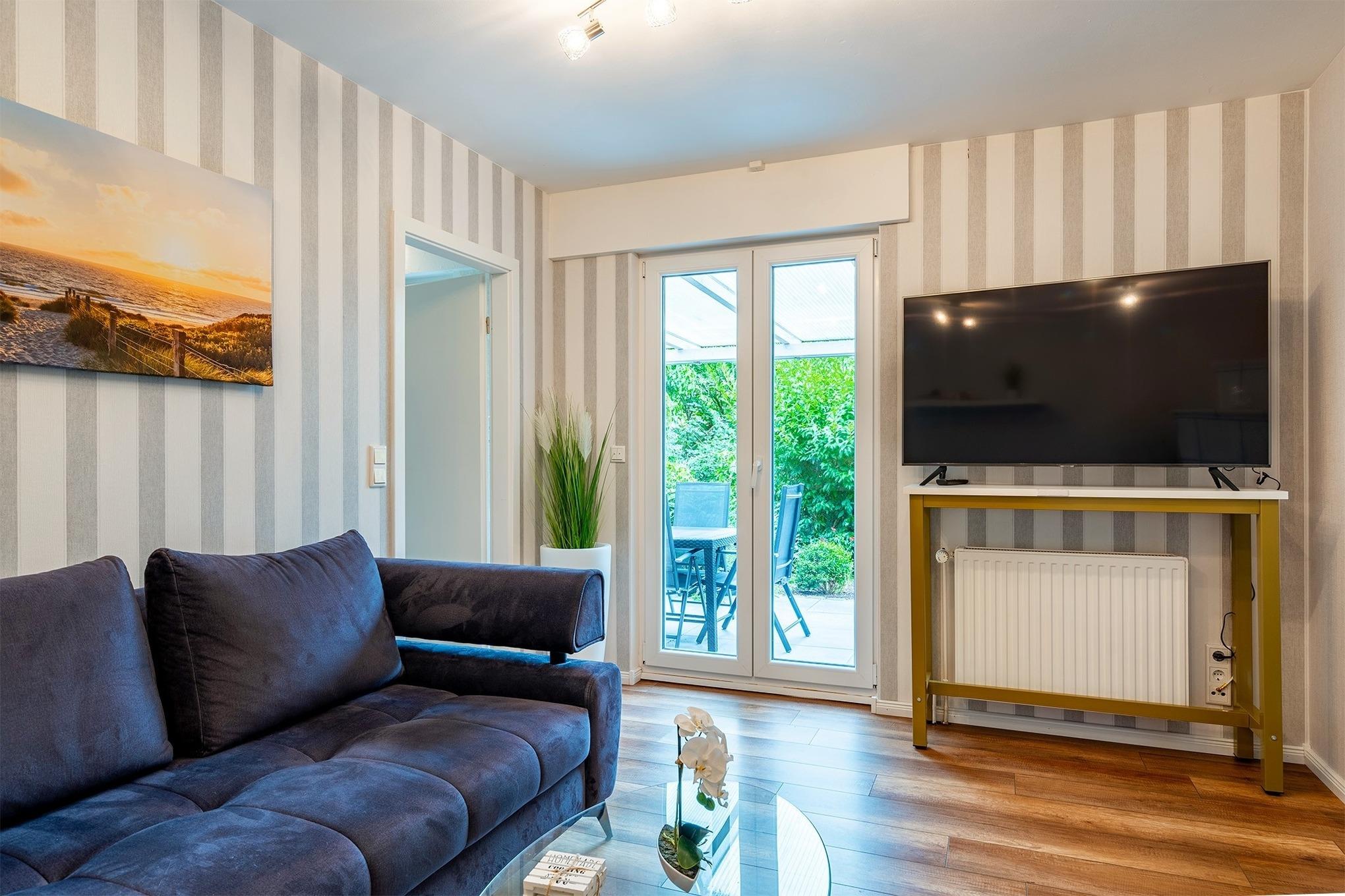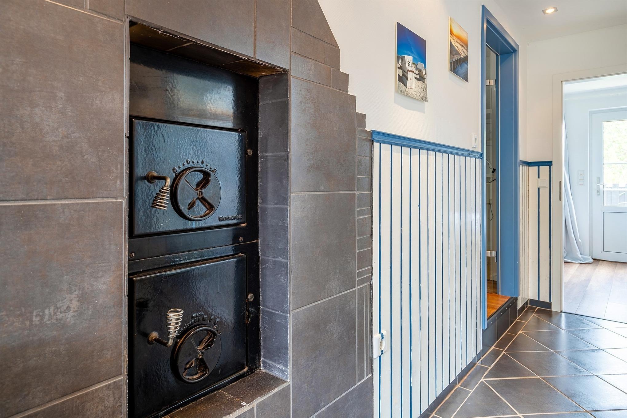 Das „Kamin Apartment“ bietet Ihnen auf rund 75qm eine stilvolle Kombination aus traditionellem Charme und modernem Komfort. Die im Erdgeschoss gelegene Ferienwohnung wurde mit viel Liebe zum Detail renoviert – besondere Akzente wie der originale Friesen-Kachelofen sorgen für eine behagliche Atmosphäre und laden nach einem erlebnisreichen Tag zum Entspannen ein. Die Wohnung verfügt über einen hellen Wohnbereich mit großem Sofa, eine voll ausgestattete separate Küche mit großzügiger Sitzecke sowie zwei gemütliche Schlafzimmer, wovon eines ein normal großes Doppelbett und das zweite ein 1,40m breites Bett bietet. Ein besonderes Highlight: Von einem der Schlafzimmer genießen Sie einen direkten Blick auf die berühmte „grüne Mühle“ der Region. Zwei Terrassen erweitern den Wohnraum ins Freie – eine davon ist überdacht und mit einer komfortablen Sitzgruppe ausgestattet, die andere bietet Sonnenliegen und einen freien Blick auf die Mühle – perfekt für entspannte Stunden im Freien. Auch Hunde sind im „Kamin Apartment“ herzlich willkommen. Für Ihren Komfort stehen Ihnen ein eigener PKW-Stellplatz sowie eine überdachte Abstellmöglichkeit für Fahrräder zur Verfügung. Die Wohnung verfügt über zwei Fernseher, einer befindet sich im Wohnzimmer, der andere in dem Schlafzimmer mit dem 1,4m großen Bett.