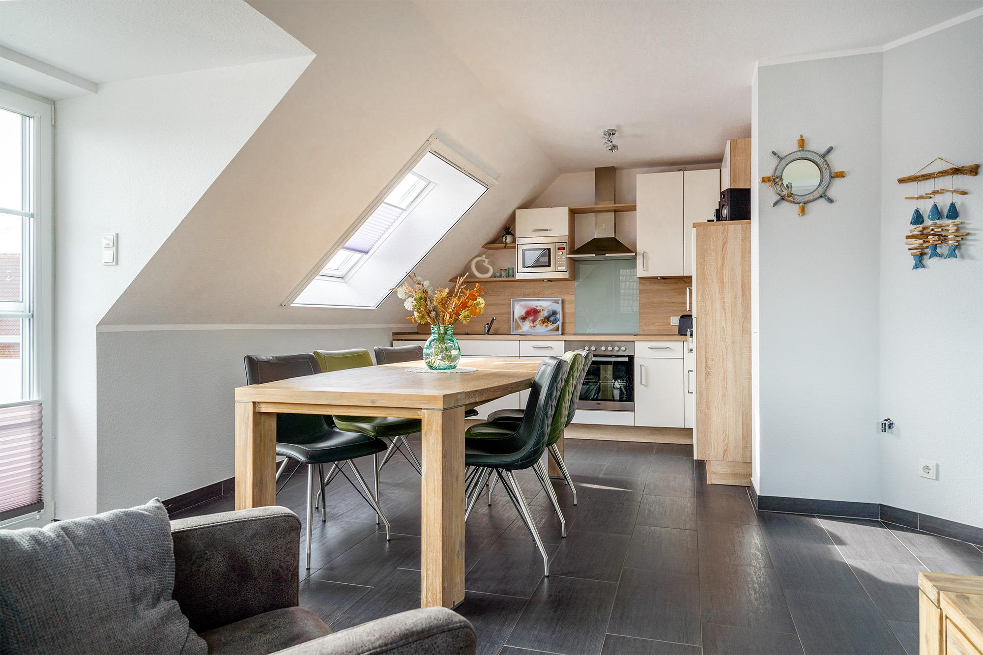 Herzlich willkommen in unserer Ferienwohnung "Küstenzeit". Zur modernen und hochwertigen Einrichtung dieser Wohnung im Obergeschoss gehören zwei Schlafzimmer, ein Tageslichtbad, Fußbodenheizung sowie eine voll ausgestattete Küche. Der lichtdurchflutete und gemütliche Wohnraum bietet mit seinem großen Esstisch viel Platz zum gemeinsamen Verweilen, sowie Zugang zum möbilierten Balkon, von dem aus Sie die bekannten Greetsieler Zwillingsmühlen sehen und die Sonnenstunden genießen können. Das Hauptschlafzimmer bietet Ihnen ein gemütliches Doppelbett und einen geräumigen Kleiderschrank. Das zweite Schlafzimmer befindet sich im ausgebauten Spitzboden (Galerie) und verfügt über zwei Einzelbetten und eine Sitzecke. Selbstverständlich stehen Ihnen ein eigener Parkplatz, sowie eine Abstellraum für Ihre Fahrräder zur Verfügung.