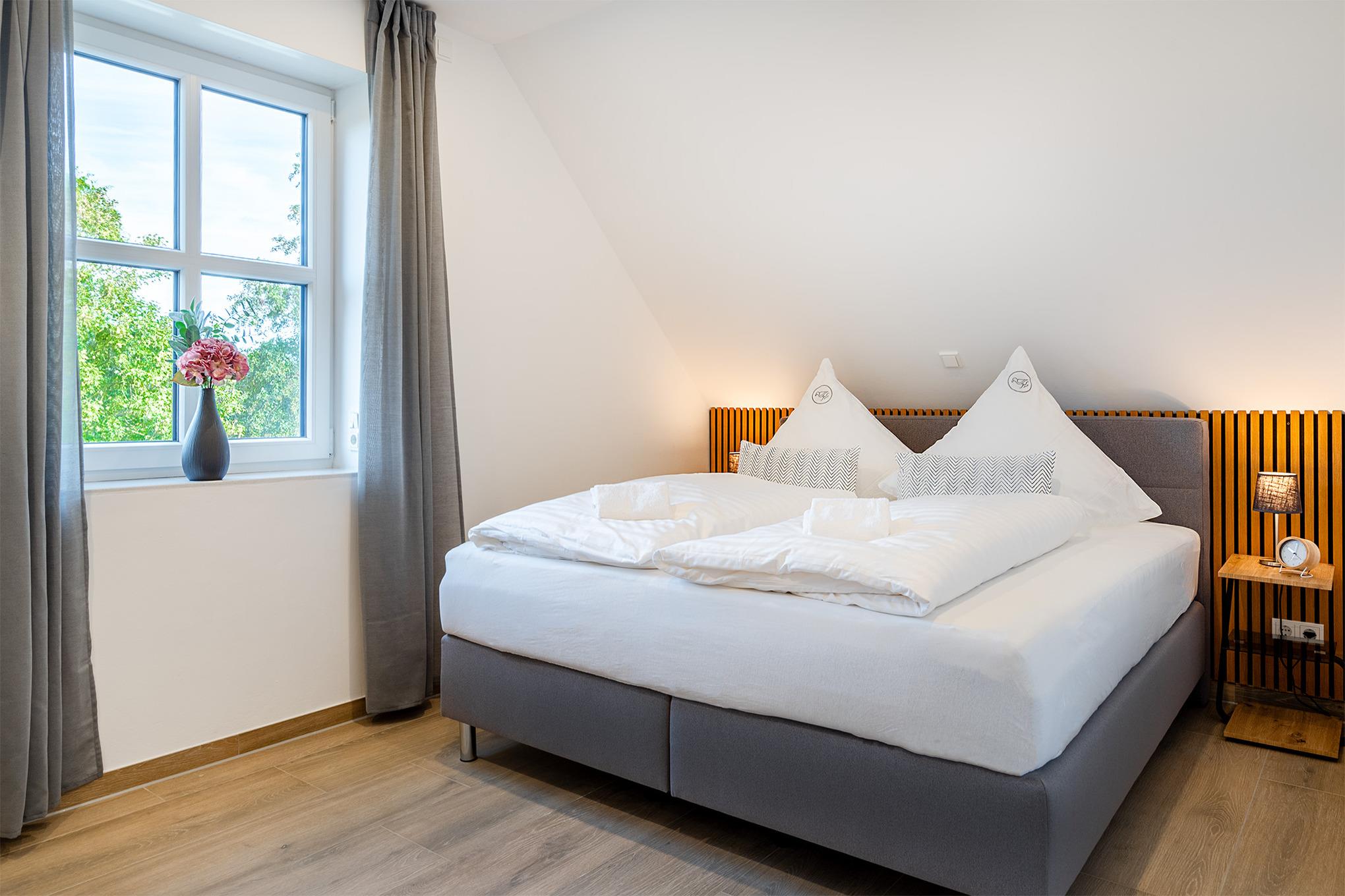 Unsere neue Ferienwohnung "Vista 3" steht Ihnen seit Herbst 2023 zur Verfügung. Sie verfügt über ein großzügiges Schlafzimmer mit qualitativem Boxspringbett und einen ausgebauten Spitzboden (Gallerie) mit zwei weiteren Betten, die man auch zusammenstellen kann. Hier entspannt es sich im Lesesessel besonders gut mit Blick auf die bekannten Zwillingsmühlen. Ein großes Tageslicht Bad mit ebenerdiger Dusche, ein kleines Gästebad mit weiterer Dusche, eine voll ausgestattete Küche und ein geräumiger und heller Wohnraum machen die Vista 3 besonders komfortabel. Auf dem Balkon mit bequemen Möbeln verbringen Sie Ihre Auszeit in äußerst ruhiger Lage. Selbstverständlich stehen Ihnen ein eigener Parkplatz, sowie eine Abstellmöglichkeit für Ihre Fahrräder zur Verfügung.
