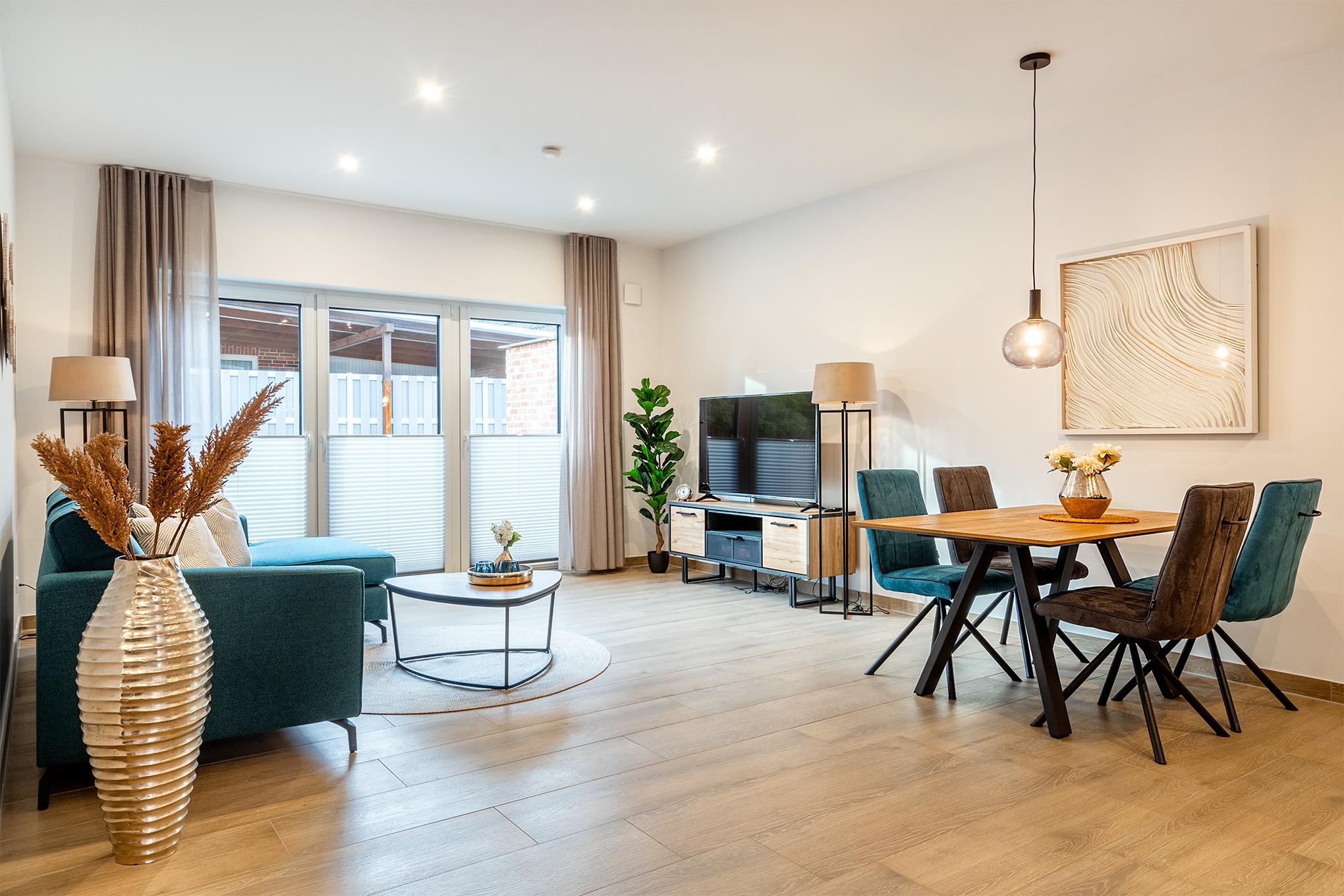 "Vista 7", unser neu erbautes Ferienhaus befindet sich in ruhiger und zentraler Lage im Emsweg. Von hier sind es nur wenige hundert Meter bis zu den Geschäften, Restaurants oder dem bekannten Greetsieler Hafen. Ihre Unterkunft verfügt über einen lichtdurchfluteten und geräumigen Wohn-Ess-Bereich, eine voll ausgestattete Küche, zwei Schlafzimmer mit bequemen Boxspringbetten, zwei Tageslichtbäder sowie einen Abstellraum. Die Sonnenstunden verbringen Sie am Besten im großzügigen Außenbereich, der über eine Terrasse und einen eingezäuntem Garten verfügt. Natürlich ist Ihr Hund hier herzlich Willkommen! Außen finden Sie weiterhin einen PKW-Stellplatz, sowie einen Abstellraum für Fahrräder. Für den gemeinsamen Urlaub mit Freunden oder der Familie bietet sich unser Ferienhaus "Vista 8" an, das direkt an "Vista 7" grenzt.