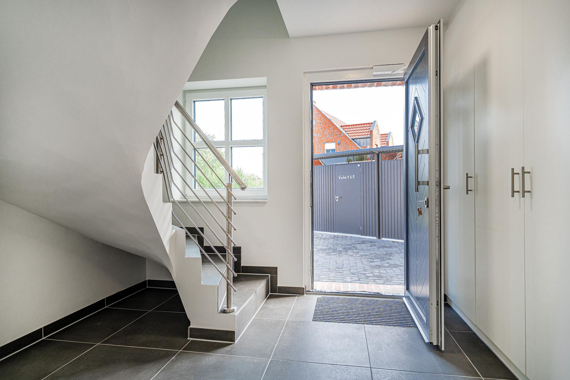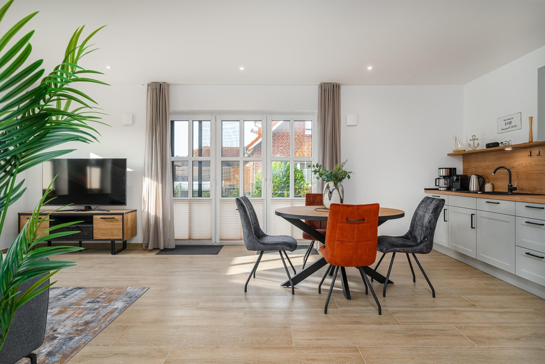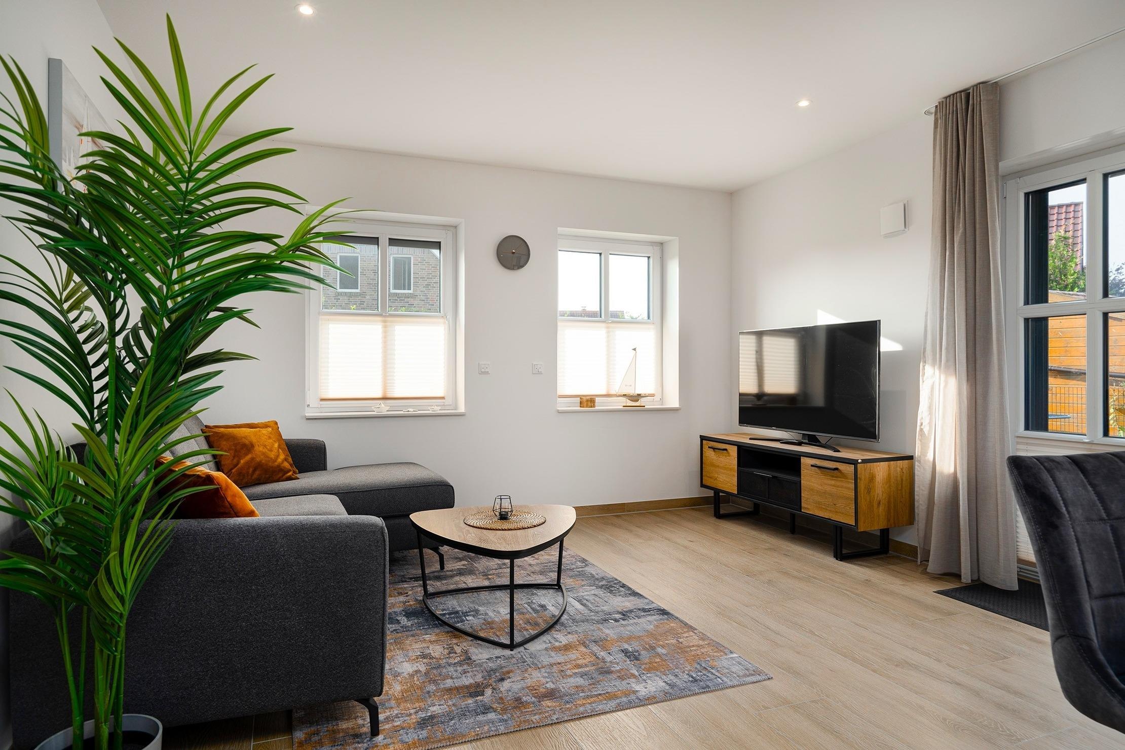 Diese gemütliche 60qm große Wohnung "Vista 9" im Erdgeschoss bietet alles, was Sie für einen erholsamen Urlaub benötigen. Sie verfügt über ein einladendes Schlafzimmer mit einem komfortablen Boxspringbett, das für erholsamen Schlaf sorgt und ein helles Tageslichtbad mit ebenerdiger Dusche. Im offenen und großzügig gestalteten Wohn-Ess-Bereich finden Sie eine hochwertig ausgestattete Einbauküche sowie eine gemütliche Sofaecke zum Entspannen. Der große, voll eingezäunte Garten bietet viel Platz zum Entspannen und Spielen – ideal für Gäste, die mit Hund anreisen. Auf der Terrasse, die mit Gartenmöbeln und bequemen Sonnenliegen ausgestattet ist, können Sie sonnige Stunden im Freien genießen. Selbstverständlich verfügt die Wohnung über einen reservierten Parkplatz sowie einen Abstellraum für Fahrräder.