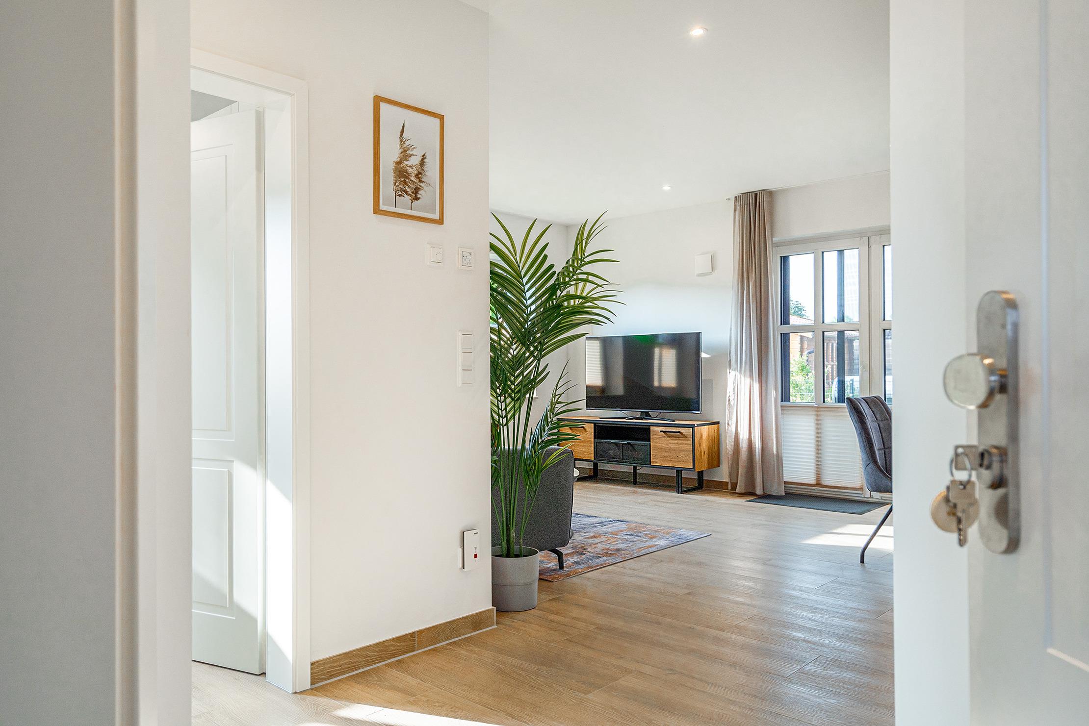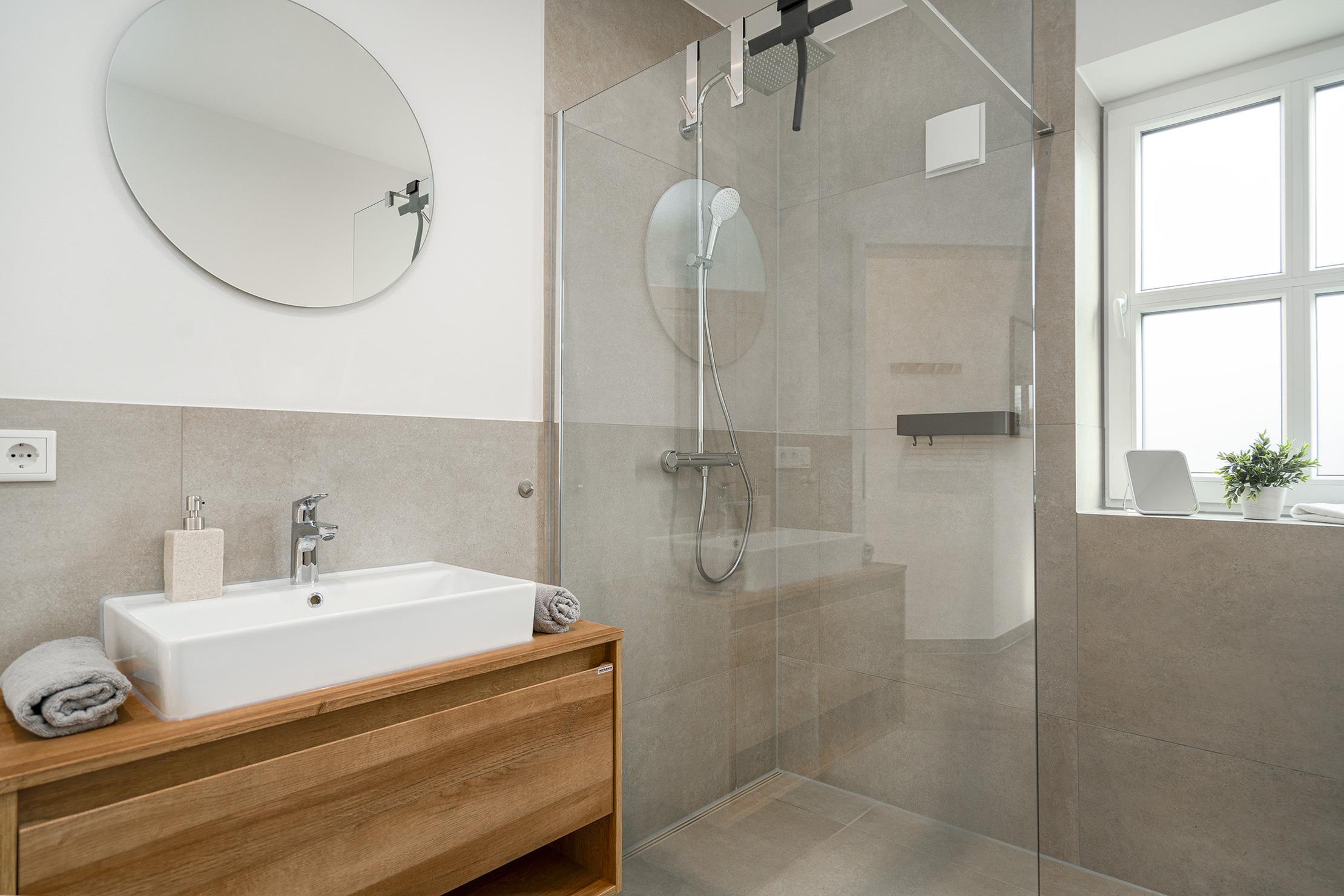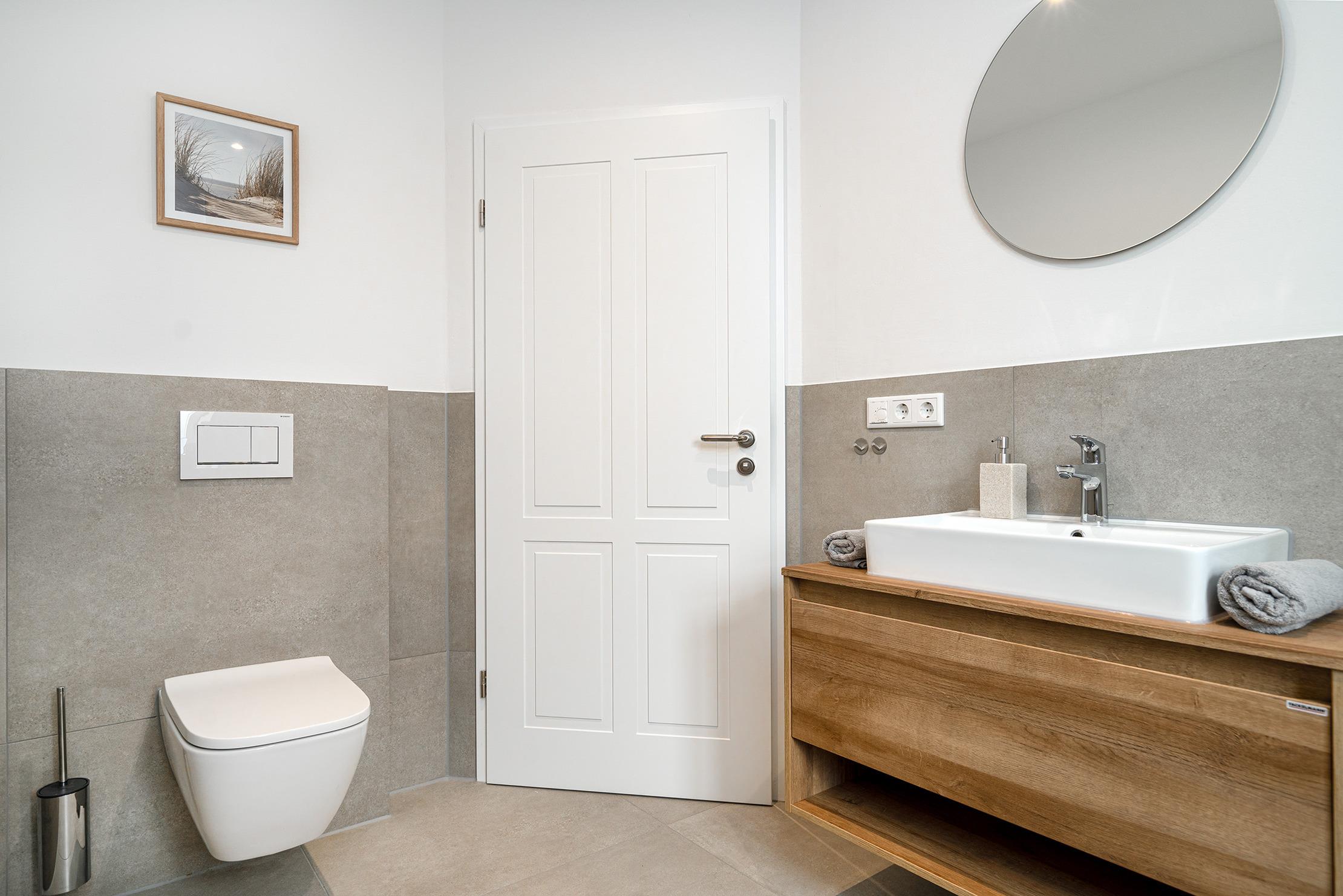 Diese gemütliche 60qm große Wohnung "Vista 9" im Erdgeschoss bietet alles, was Sie für einen erholsamen Urlaub benötigen. Sie verfügt über ein einladendes Schlafzimmer mit einem komfortablen Boxspringbett, das für erholsamen Schlaf sorgt und ein helles Tageslichtbad mit ebenerdiger Dusche. Im offenen und großzügig gestalteten Wohn-Ess-Bereich finden Sie eine hochwertig ausgestattete Einbauküche sowie eine gemütliche Sofaecke zum Entspannen. Der große, voll eingezäunte Garten bietet viel Platz zum Entspannen und Spielen – ideal für Gäste, die mit Hund anreisen. Auf der Terrasse, die mit Gartenmöbeln und bequemen Sonnenliegen ausgestattet ist, können Sie sonnige Stunden im Freien genießen. Selbstverständlich verfügt die Wohnung über einen reservierten Parkplatz sowie einen Abstellraum für Fahrräder.