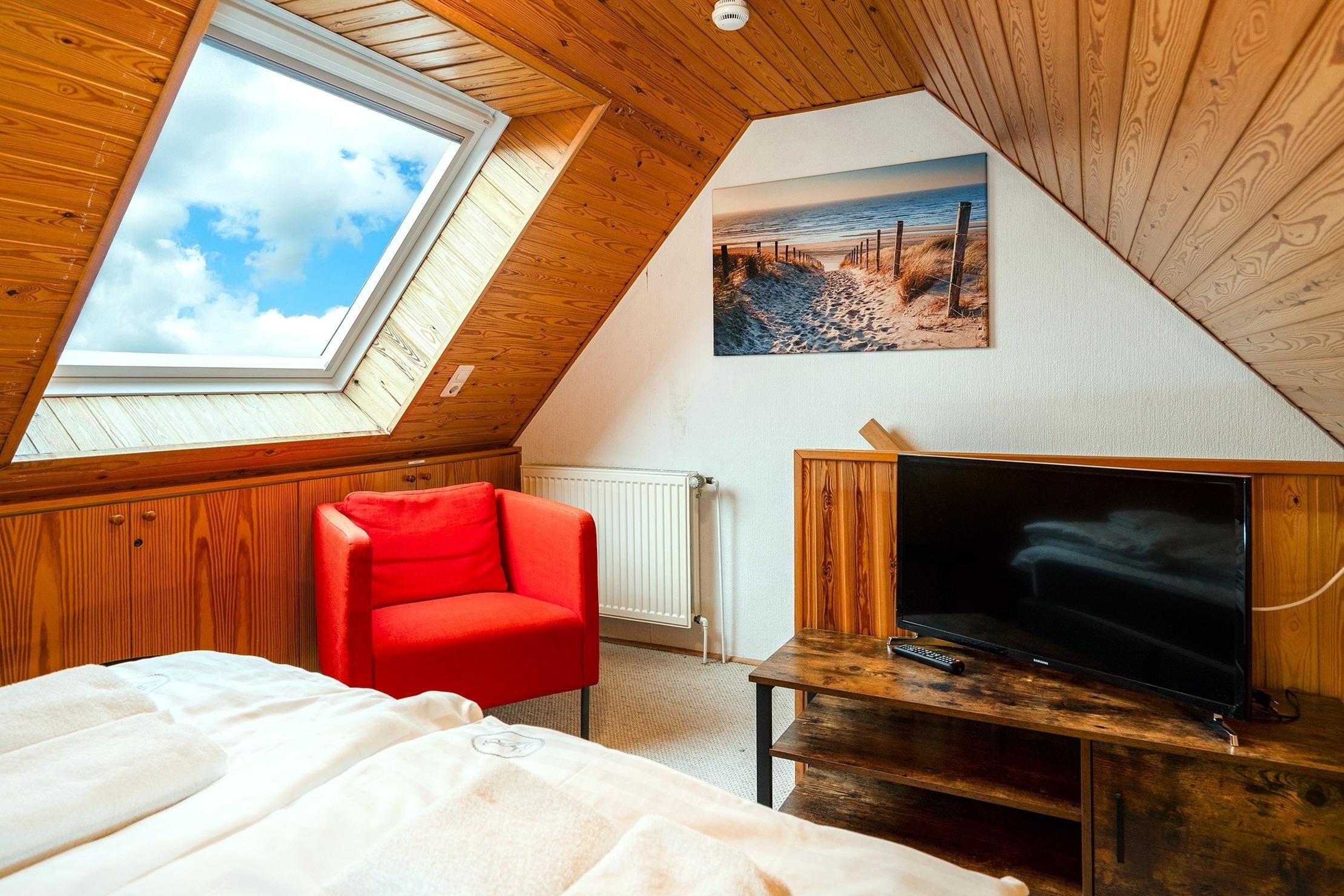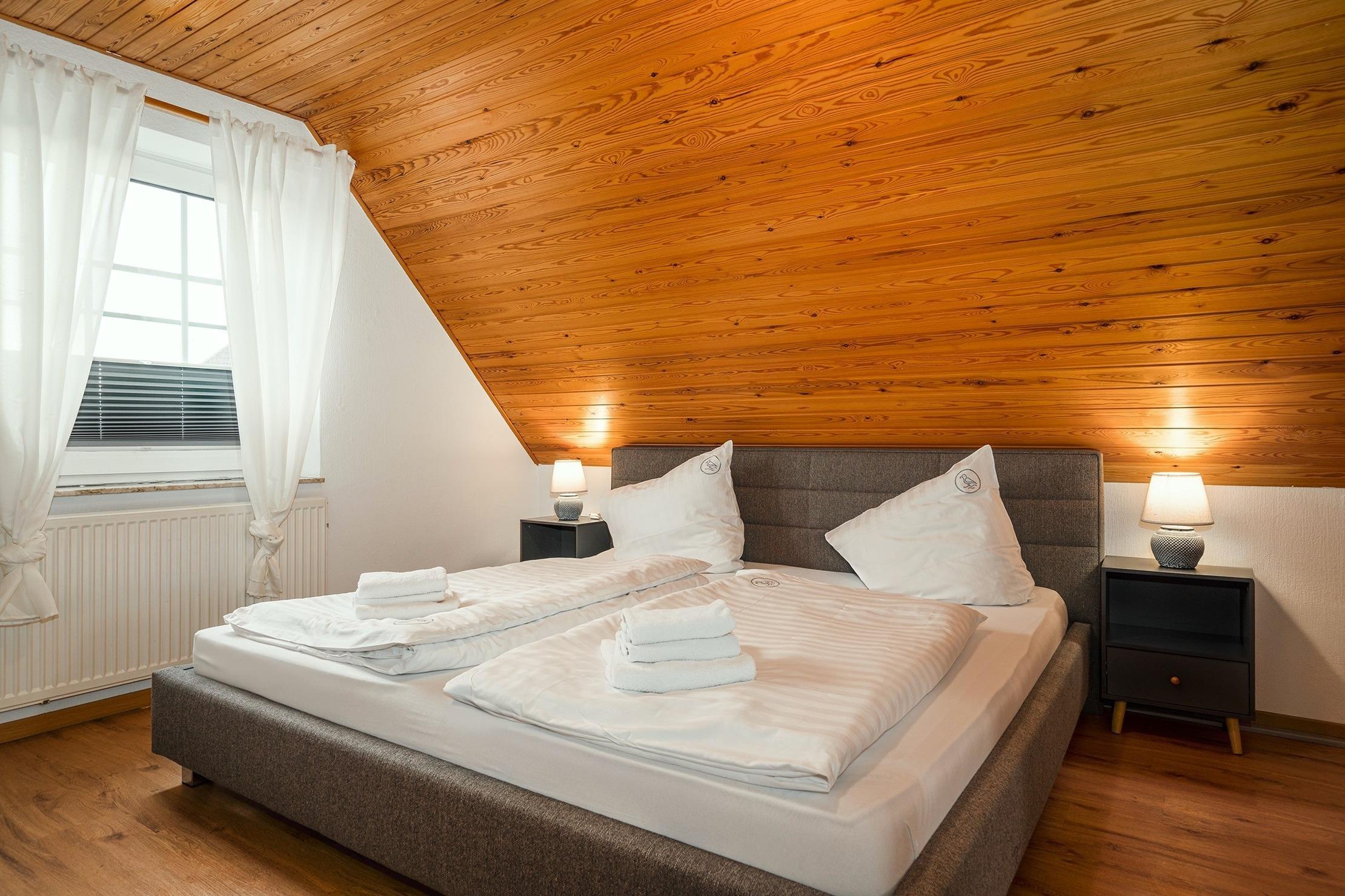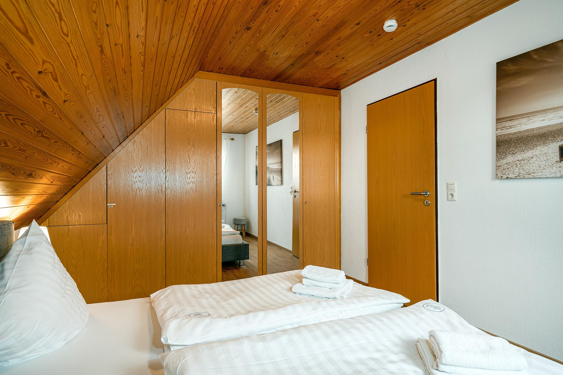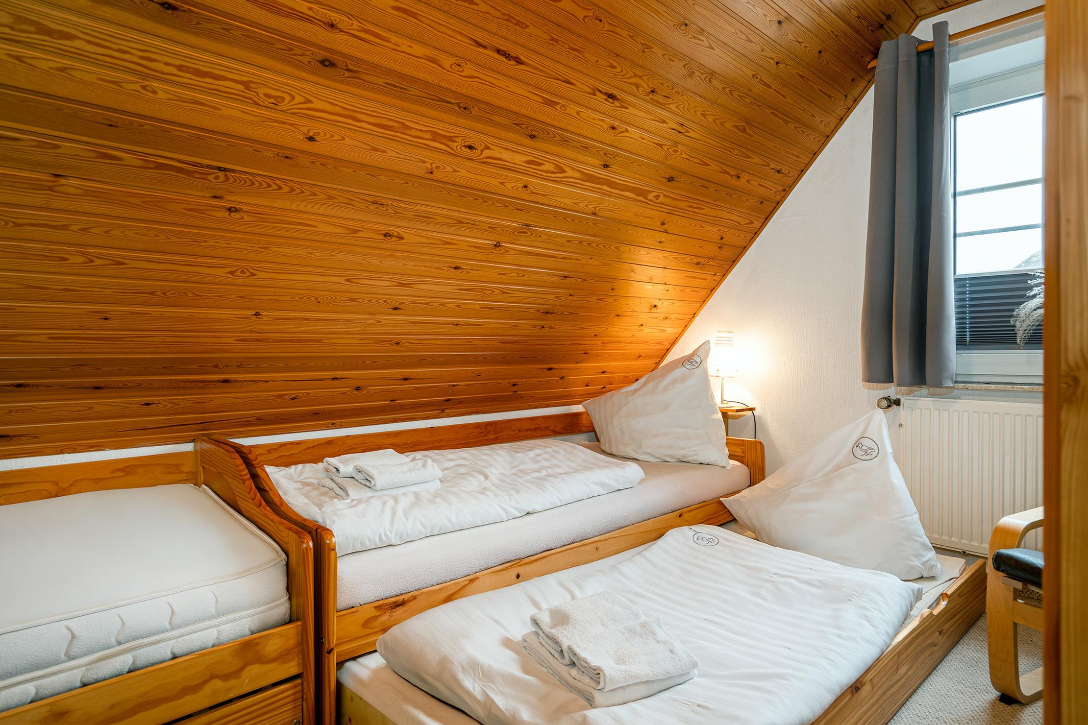 * bitte beachten Sie, dass das Schlafzimmer mit Einzelbetten auch als Durchgangszimmer zum Dachgeschoss dient. Weiterhin kann eines der Einzelbetten als Tandembett ausgezogen werden, sodass auf Anfrage auch insgesamt sieben Personen dort untergebracht werden können.*