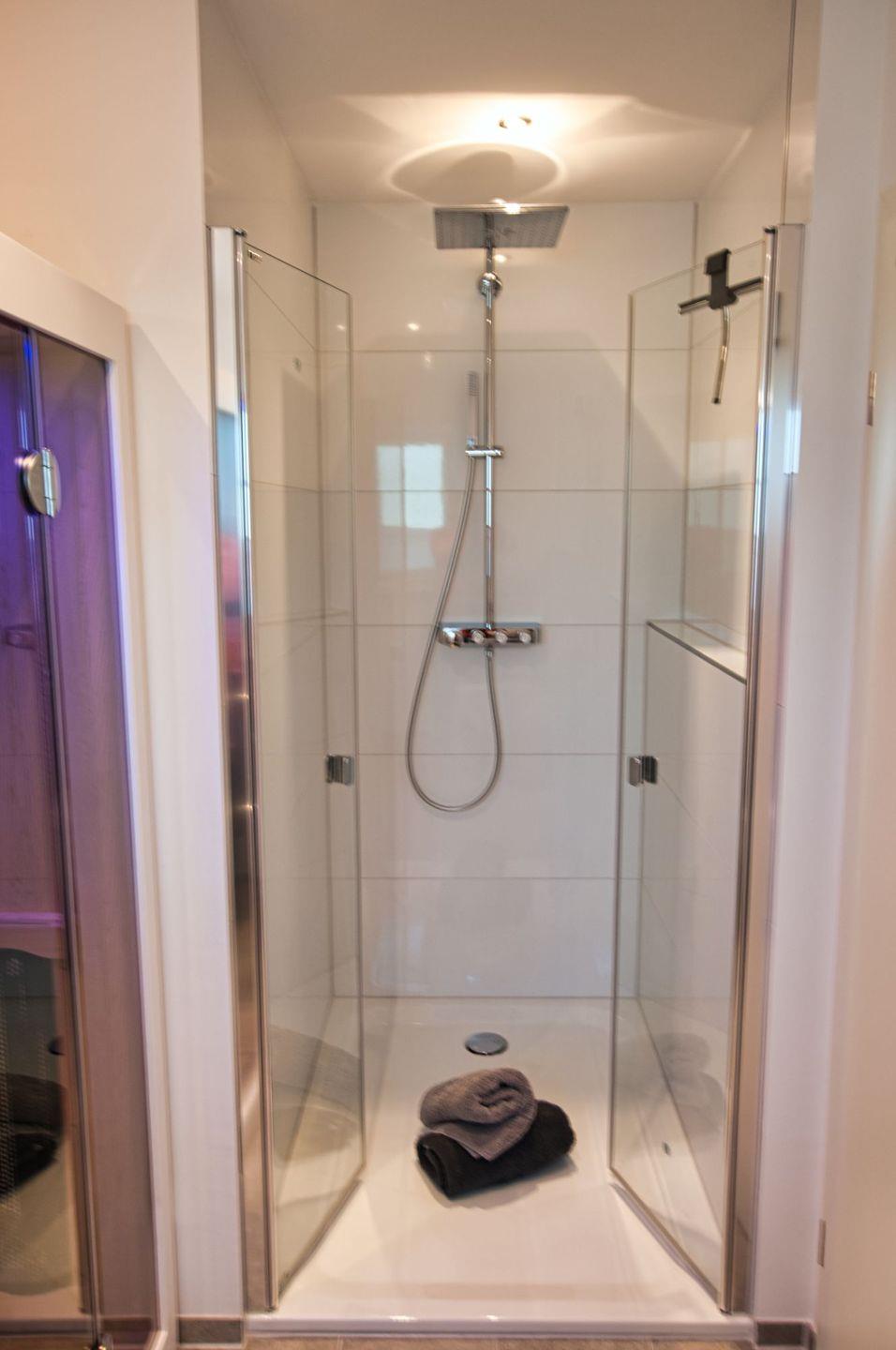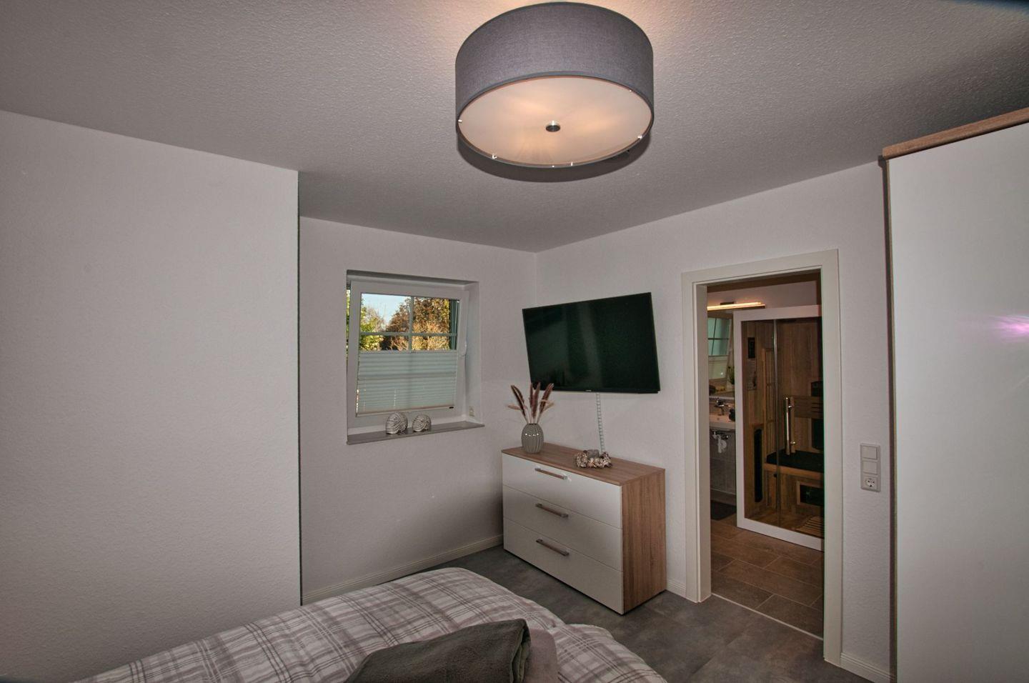 Im EG befindet sich ein Schlafzimmer mit Doppelbett 1,80m x 2,00m, Kleiderschrank und Kommode, sowie ein großes Wellness-Badezimmer mit ebenerdiger Rainshower-Dusche (1,00m x 1,30m) und einer Infrarotsauna für zwei Personen.