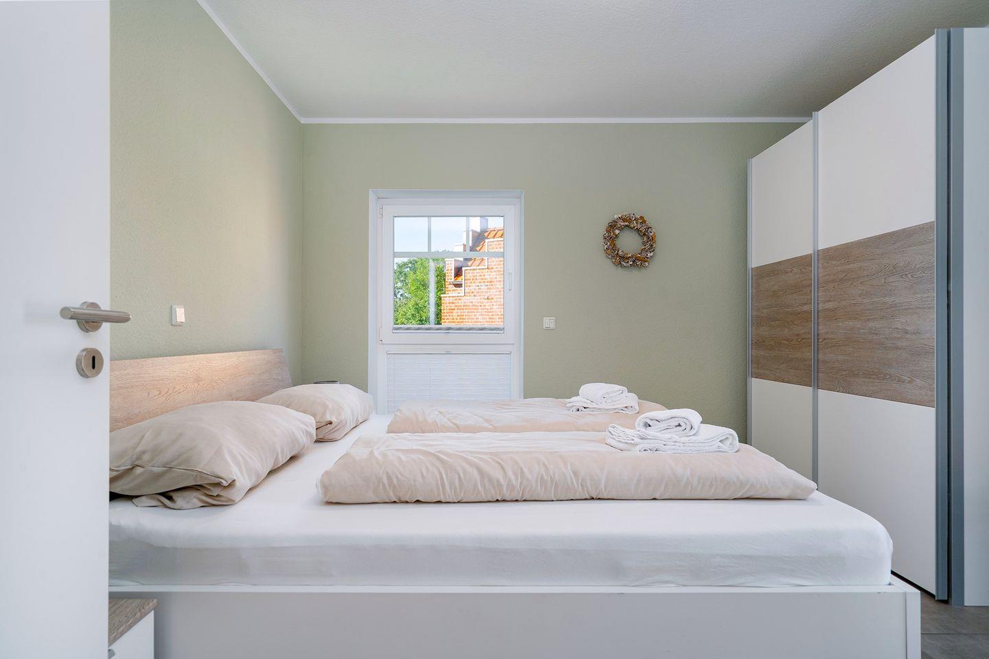 Auf gleicher Ebene befindet sich ein Schlafzimmer mit Doppelbett, Kleiderschrank und TV, ein modernes Duschbad mit Föhn und ein Abstellraum mit Waschtrockner, Bügeleisen, Bügelbrett und Wäscheständer.