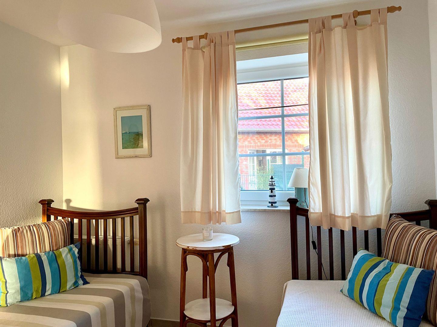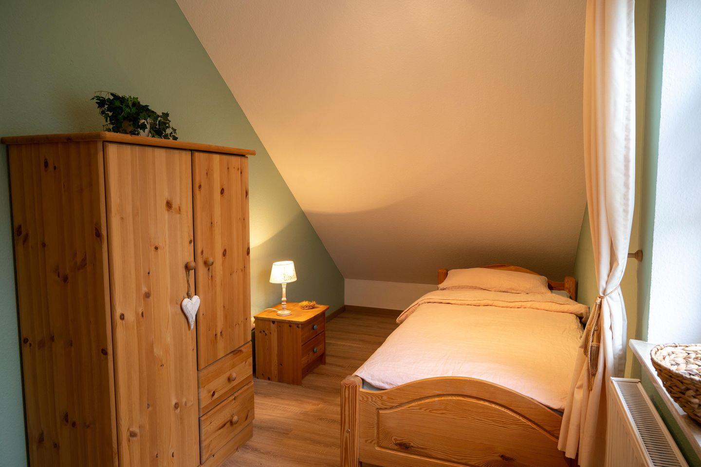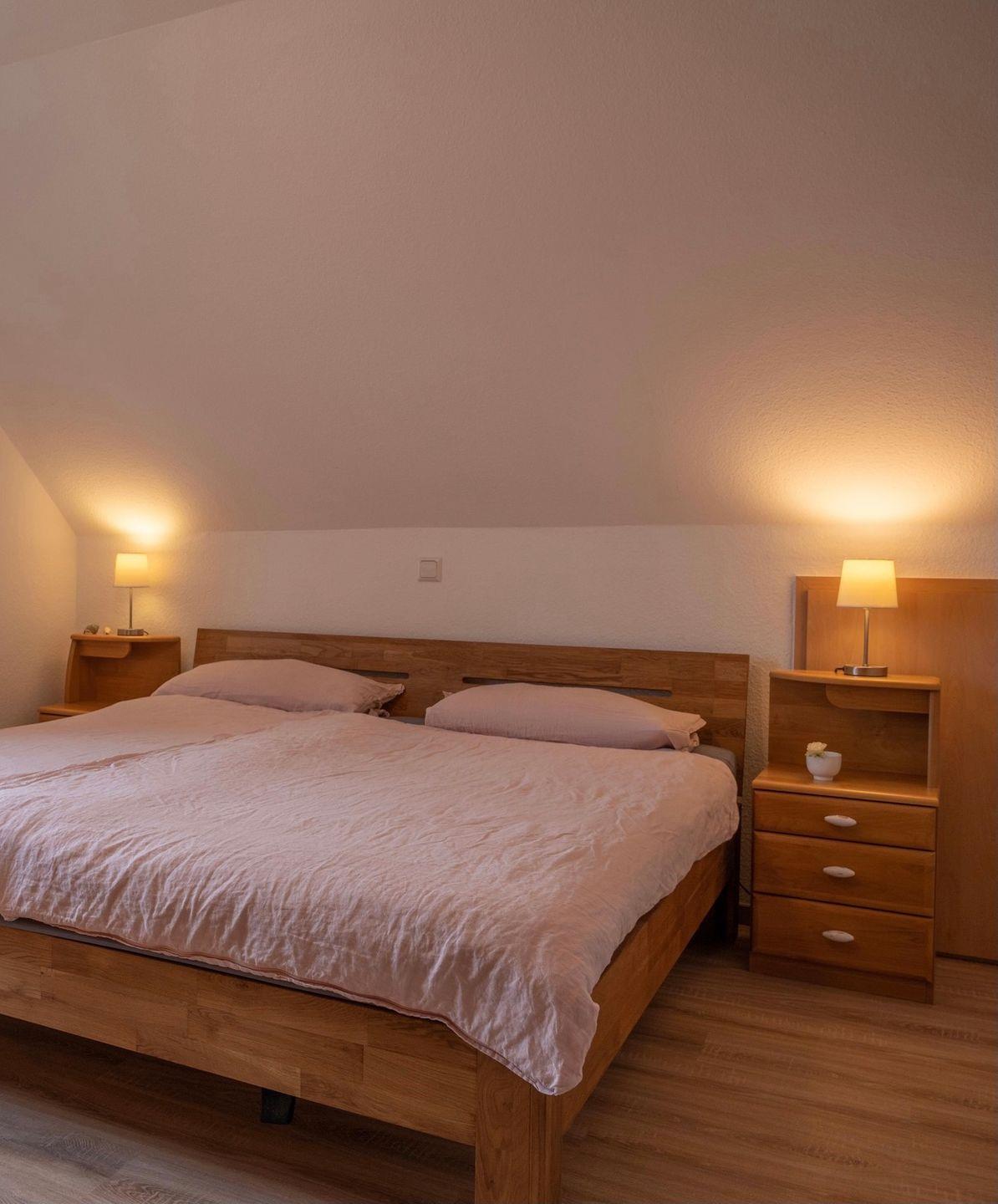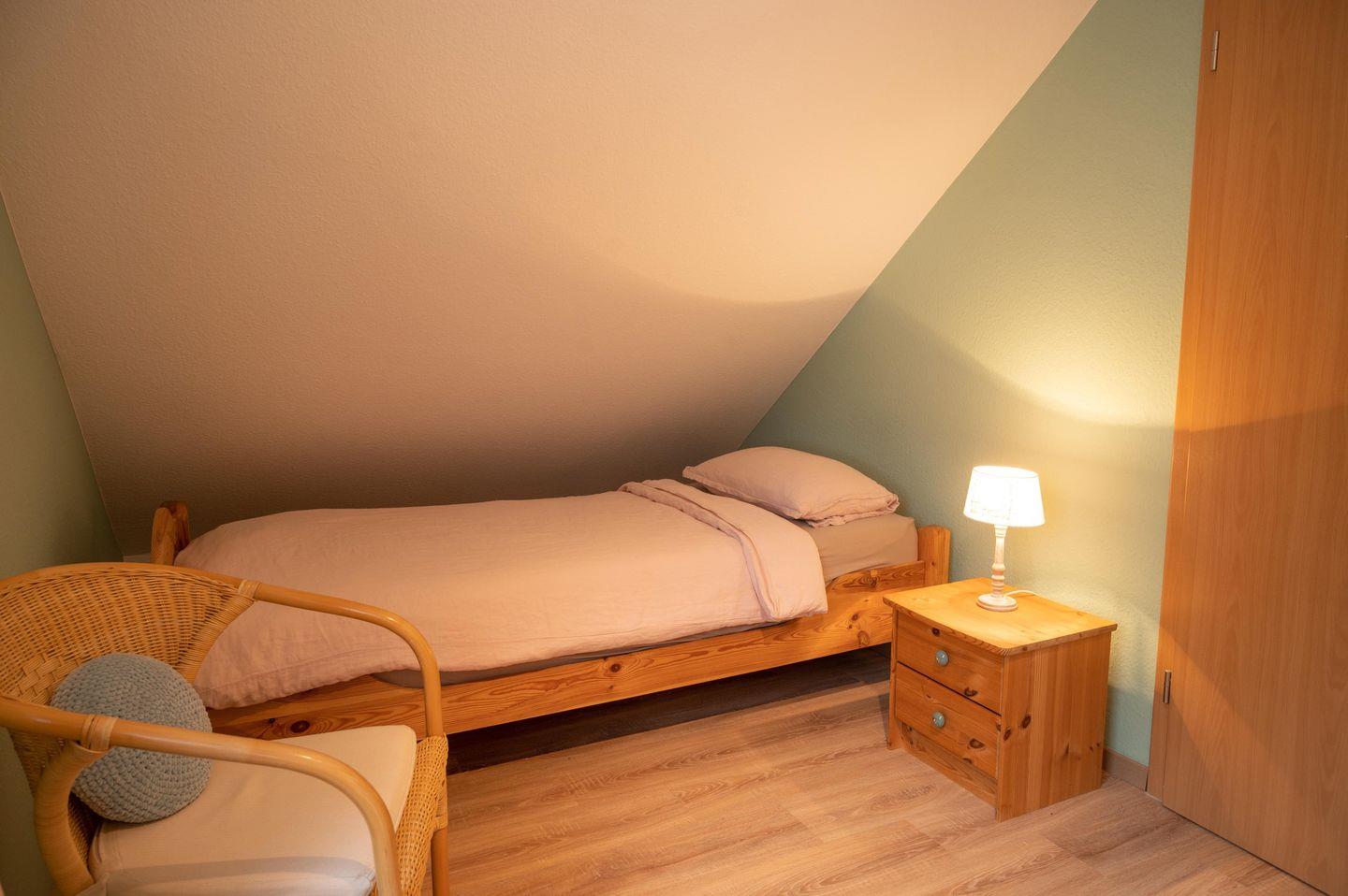 Das Haus verfügt über 3 Schlafräume (1xEG, 2xOG). Die Schlafräume im OG sind mit Laminat ausgelegt. Ein Schlafzimmer im Obergeschoss hat ein Doppelbett (1,80m x 2,00m). Im zweiten Schlafzimmer im OG befinden sich zwei Einzelbetten (1m x 2,00m). Im EG ist das Schlafzimmer mit zwei Einzelbetten ausgestattet.