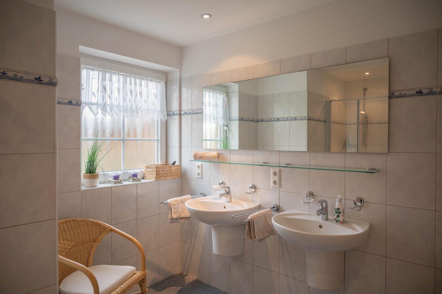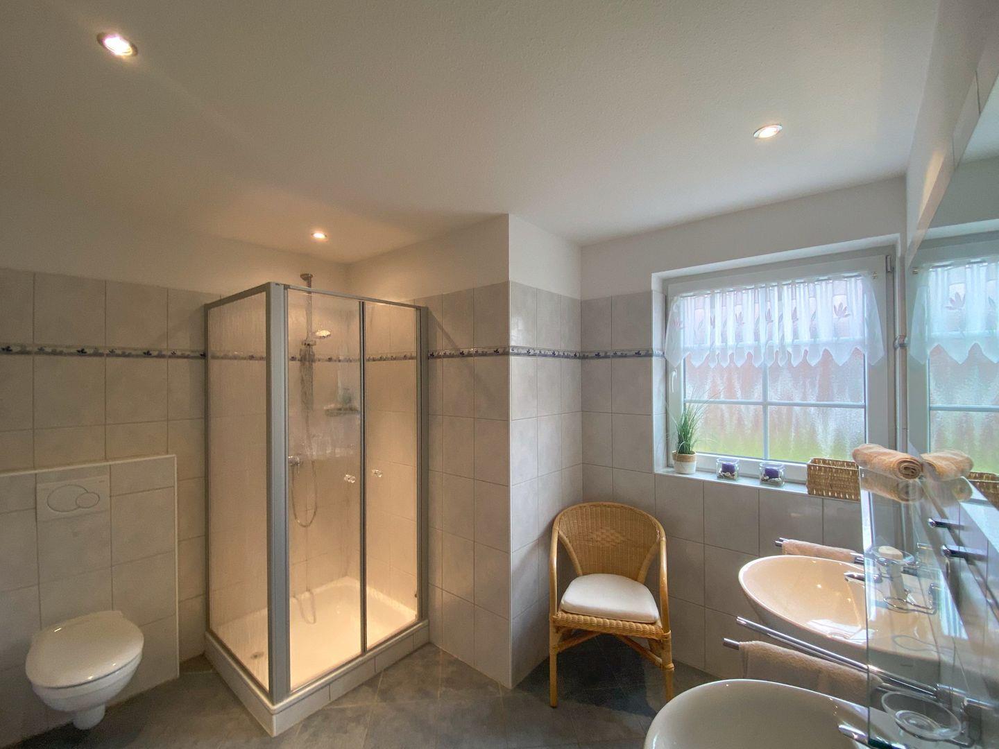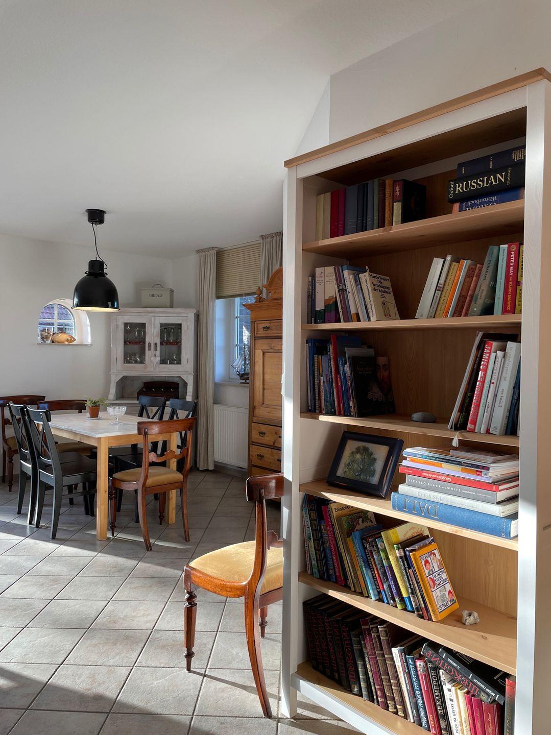 Das Schlafzimmer im Erdgeschoss ist vom Wohnbereich und der Küche komplett abgetrennt und, wie der gesamte EG, mit hochwertigen Fliesen versehen und mit Fußbodenerwärmung ausgestattet. Eine Bibliothek mit Kinder- und Erwachsenenbücher ist ebenso vorhanden, so dass Sie genug Lesestoff für Ihren Aufenthalt haben! Im Erdgeschoss befindet sich der helle Wohn/Essbereich mit Fußbodenerwärmung und sehr bequemen Sofas, die hochwertig ausgestattete, räumlich abgetrennte Küche mit Markengeräten, ein großzügiges Duschbad mit zwei Waschbecken.