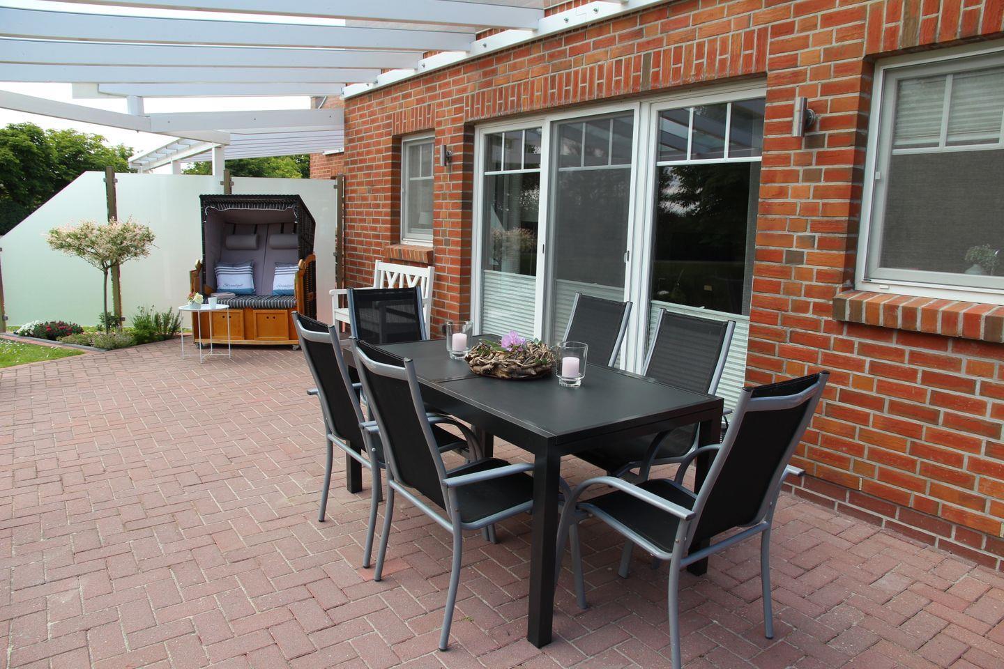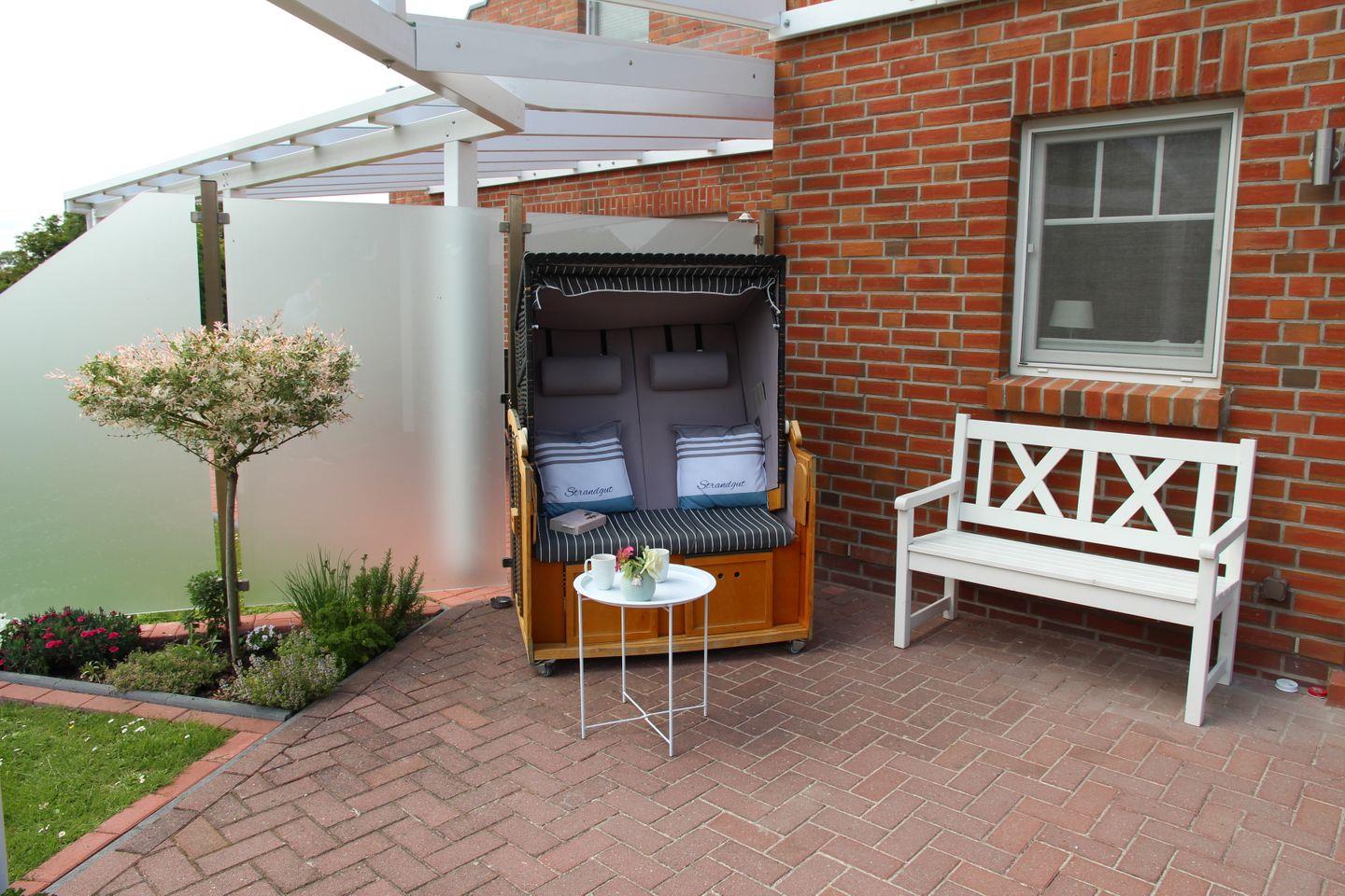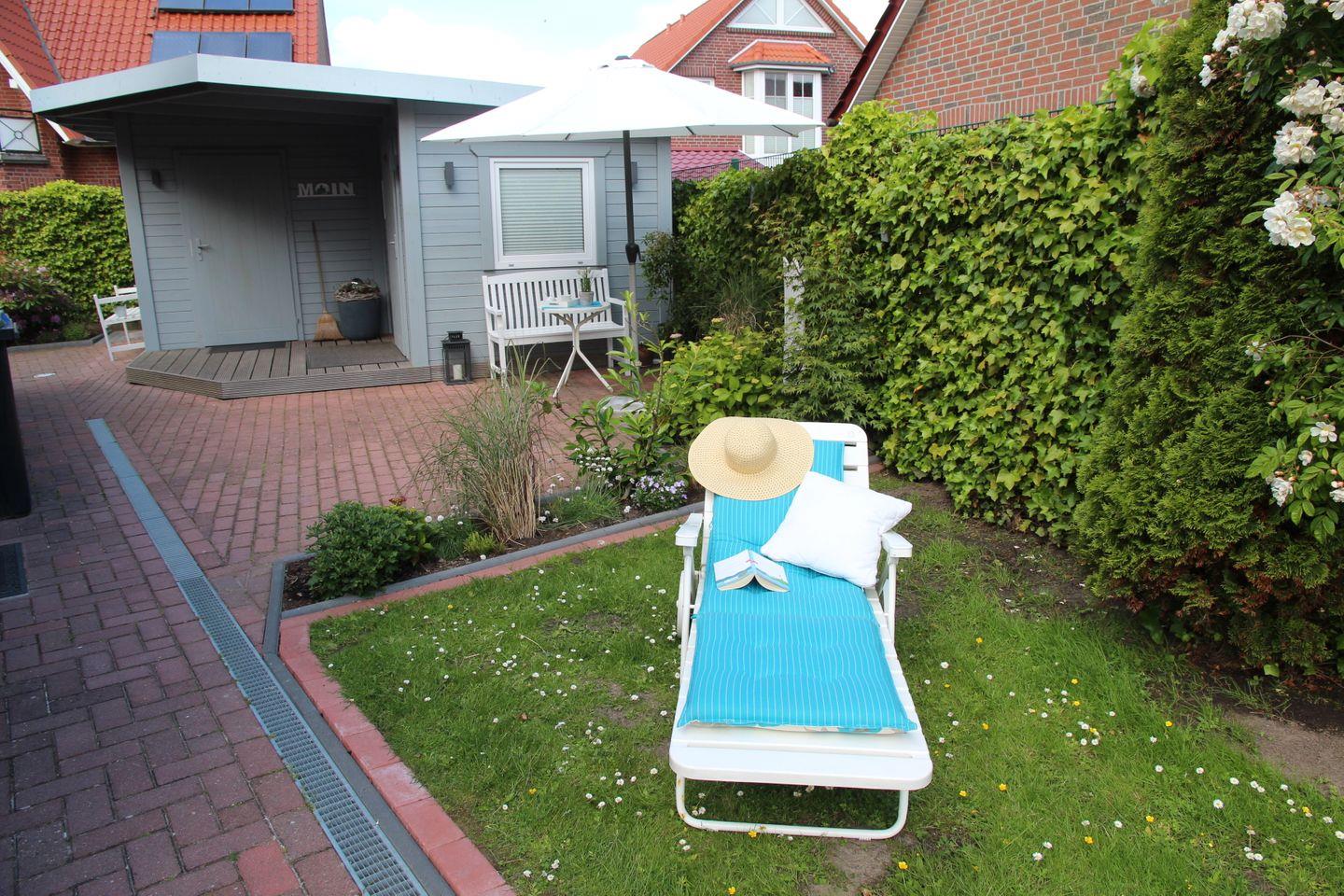 Ein Abstellhaus für Fahrräder ist ebenso vorhanden wie Gartenmöbel für 7 Personen, 2 Sonnenschirme, 2 Liegestühle, 1 Gartenliege, Bollerwagen, einen Weber Holzkohlegrill und einen Feuerkorb. Es befinden sich 2 Terrassen am Haus, die Sie je nach Sonnenlage nutzen können. Auch der zum Haus gehörende Strandkorb trägt zum Wohlfühlurlaub bei. Seit Sommer 2022 sind nun auch für das Terrassenglasdach zwei separat zu bedienende Markisen zur individuellen Beschattung hinzugekommen. Ebenfalls ist ein mobiler Ventilator vorhanden. Im Gartenhaus sind drei Kinderschwimmwesten in unterschiedlichen Größen vorhanden.