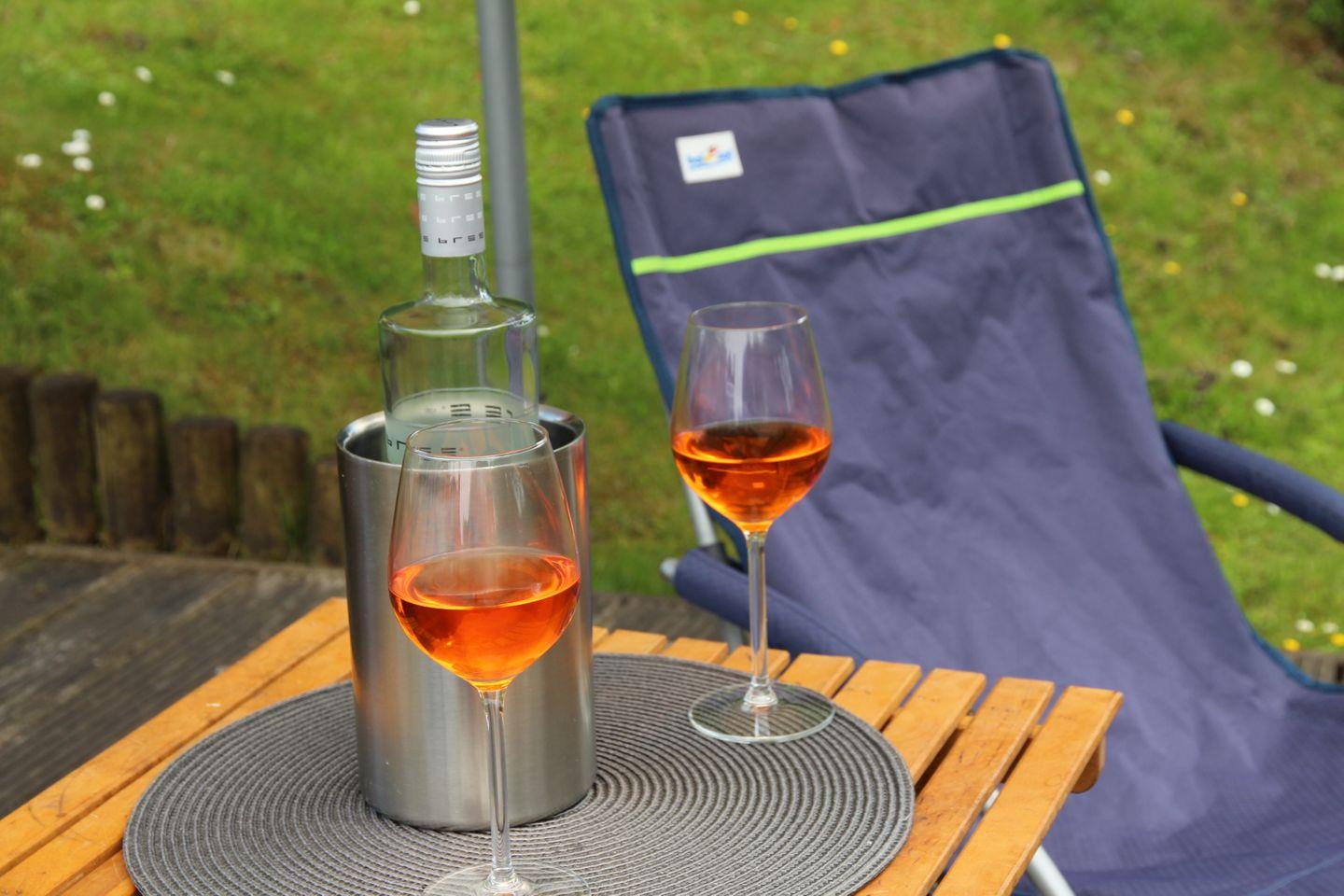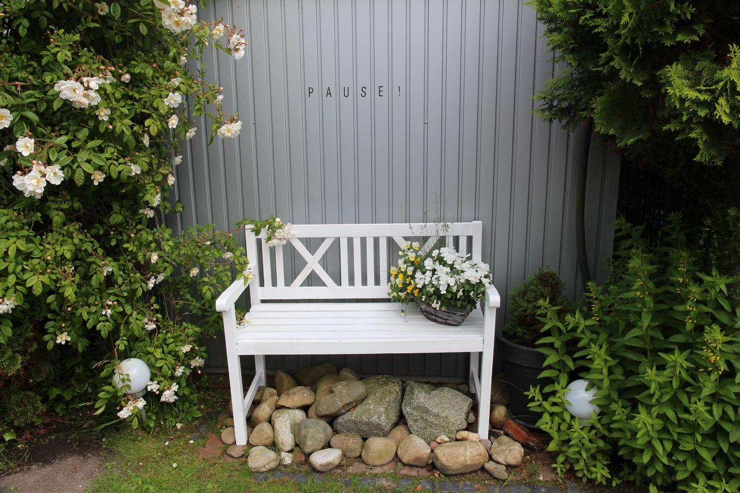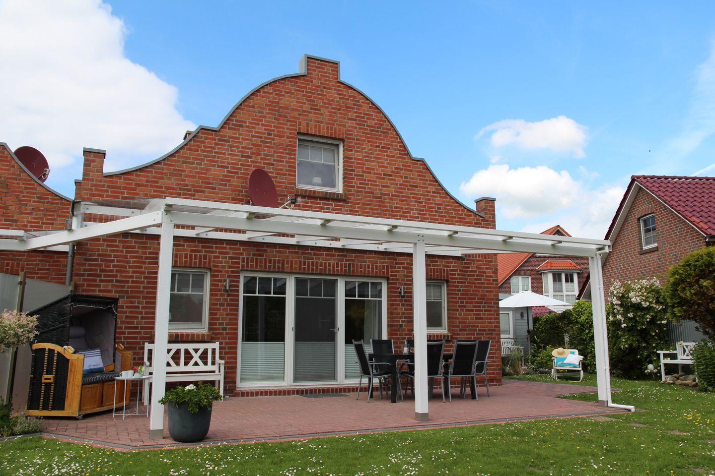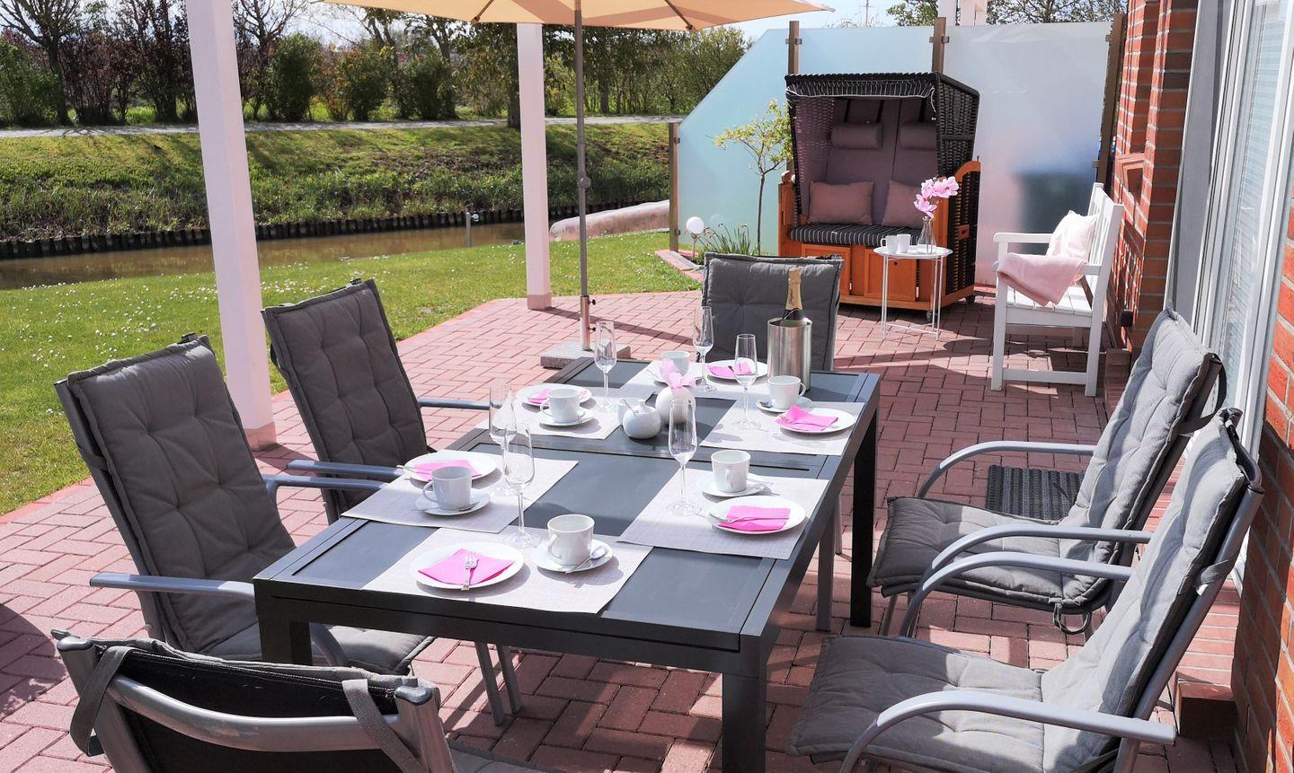 Ein Abstellhaus für Fahrräder ist ebenso vorhanden wie Gartenmöbel für 7 Personen, 2 Sonnenschirme, 2 Liegestühle, 1 Gartenliege, Bollerwagen, einen Weber Holzkohlegrill und einen Feuerkorb. Es befinden sich 2 Terrassen am Haus, die Sie je nach Sonnenlage nutzen können. Auch der zum Haus gehörende Strandkorb trägt zum Wohlfühlurlaub bei. Seit Sommer 2022 sind nun auch für das Terrassenglasdach zwei separat zu bedienende Markisen zur individuellen Beschattung hinzugekommen. Ebenfalls ist ein mobiler Ventilator vorhanden. Im Gartenhaus sind drei Kinderschwimmwesten in unterschiedlichen Größen vorhanden.