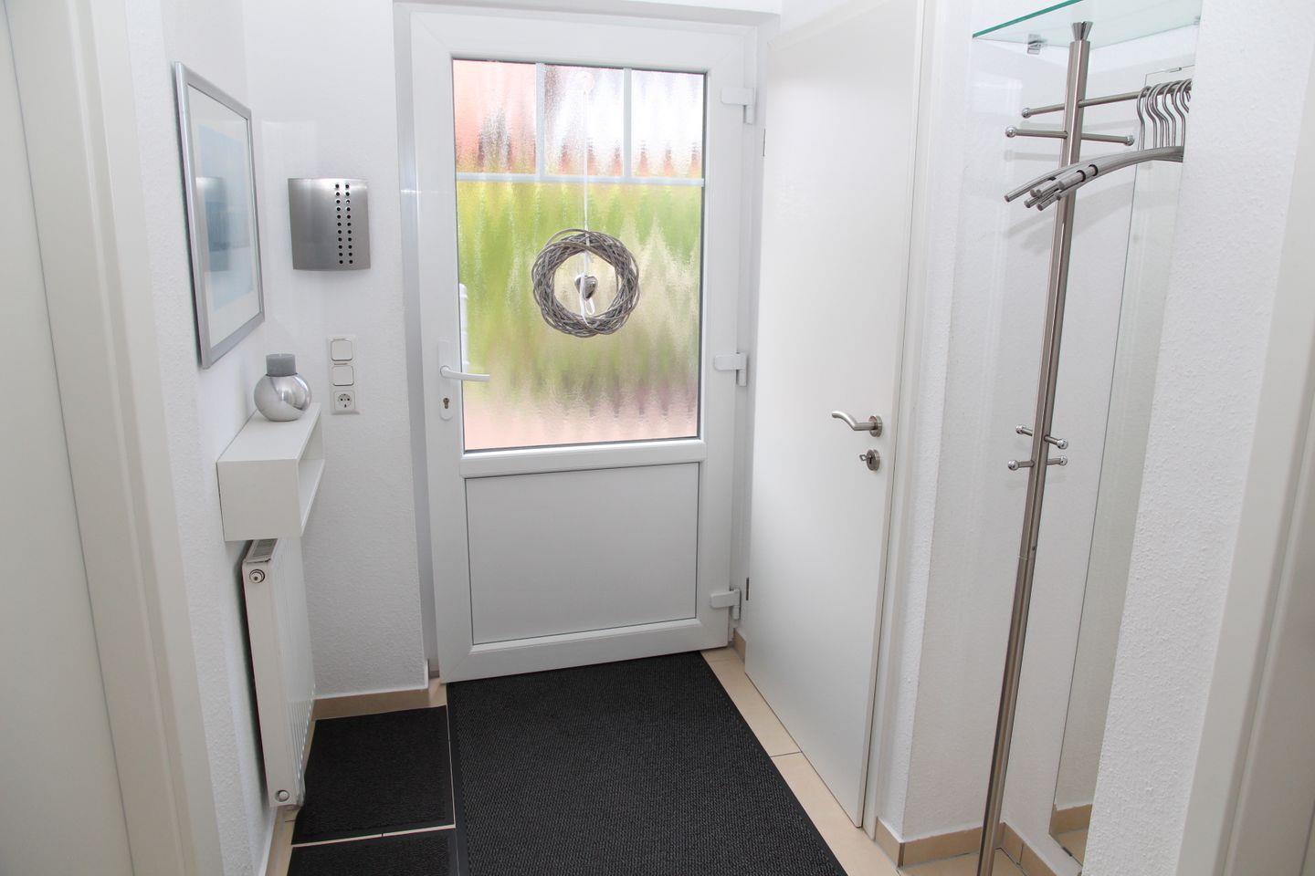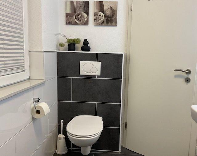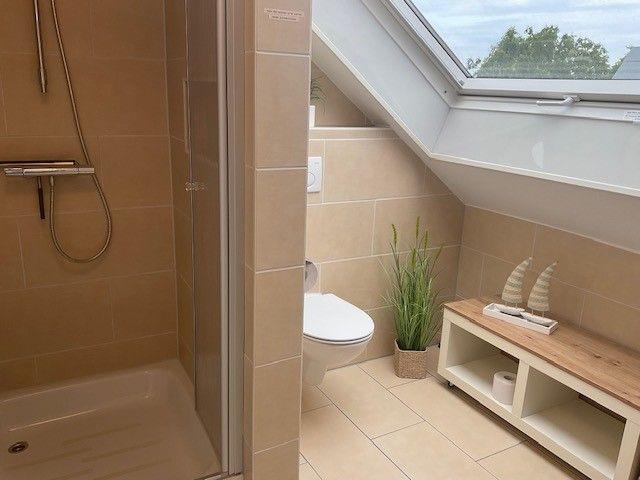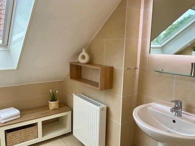 Die beiden hochwertig ausgestatteten Dusch-Bäder im Erdgeschoss und Obergeschoss sind jeweils mit einem beleuchteten Schminkspiegel sowie einem Föhn ausgestattet. Ein Bügelbrett und ein Bügeleisen sind vorhanden.