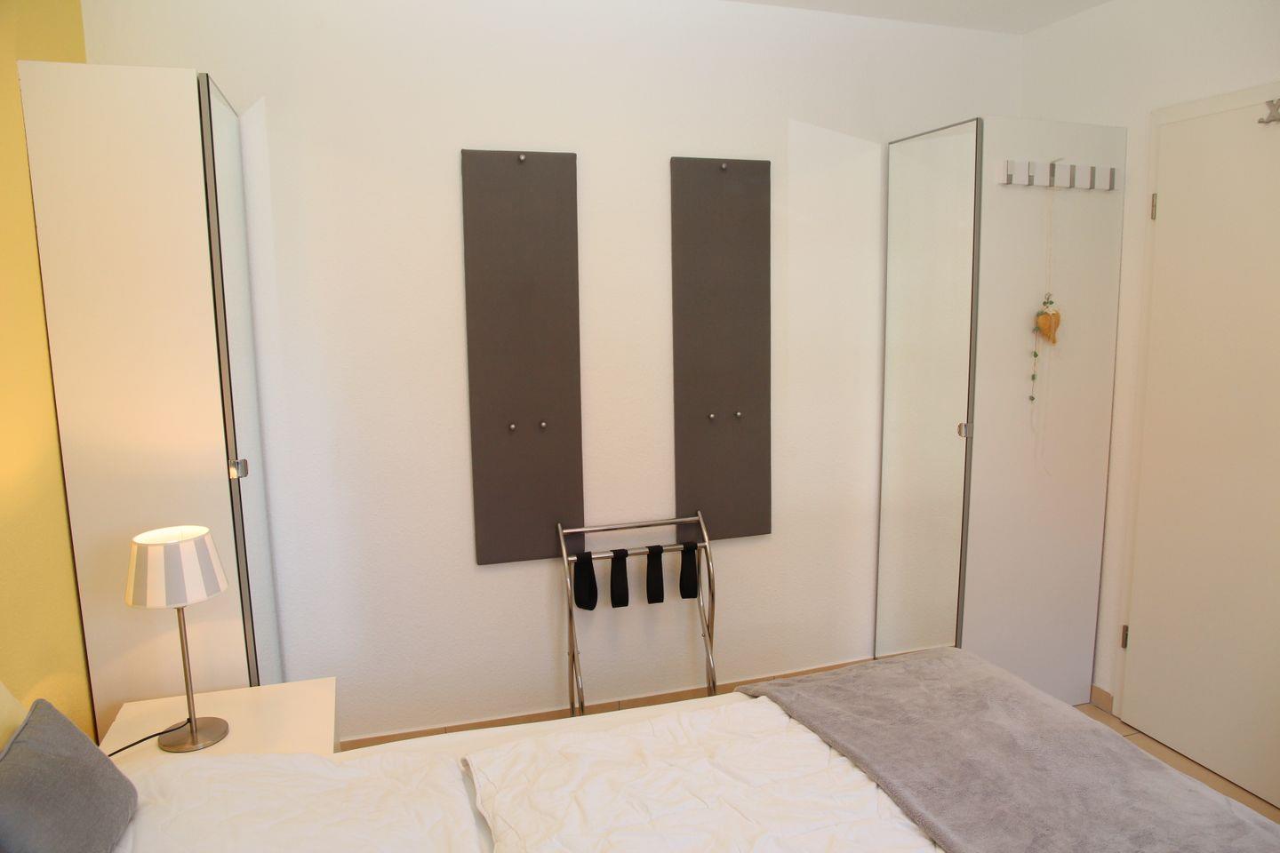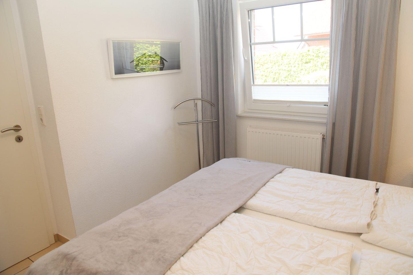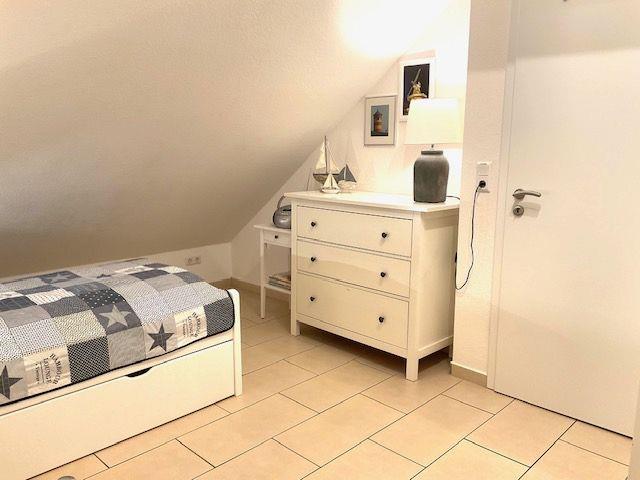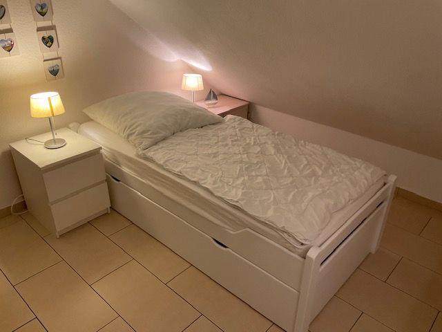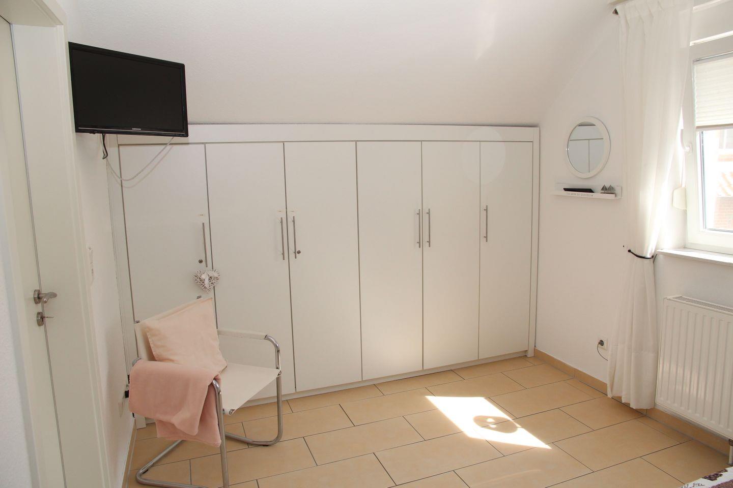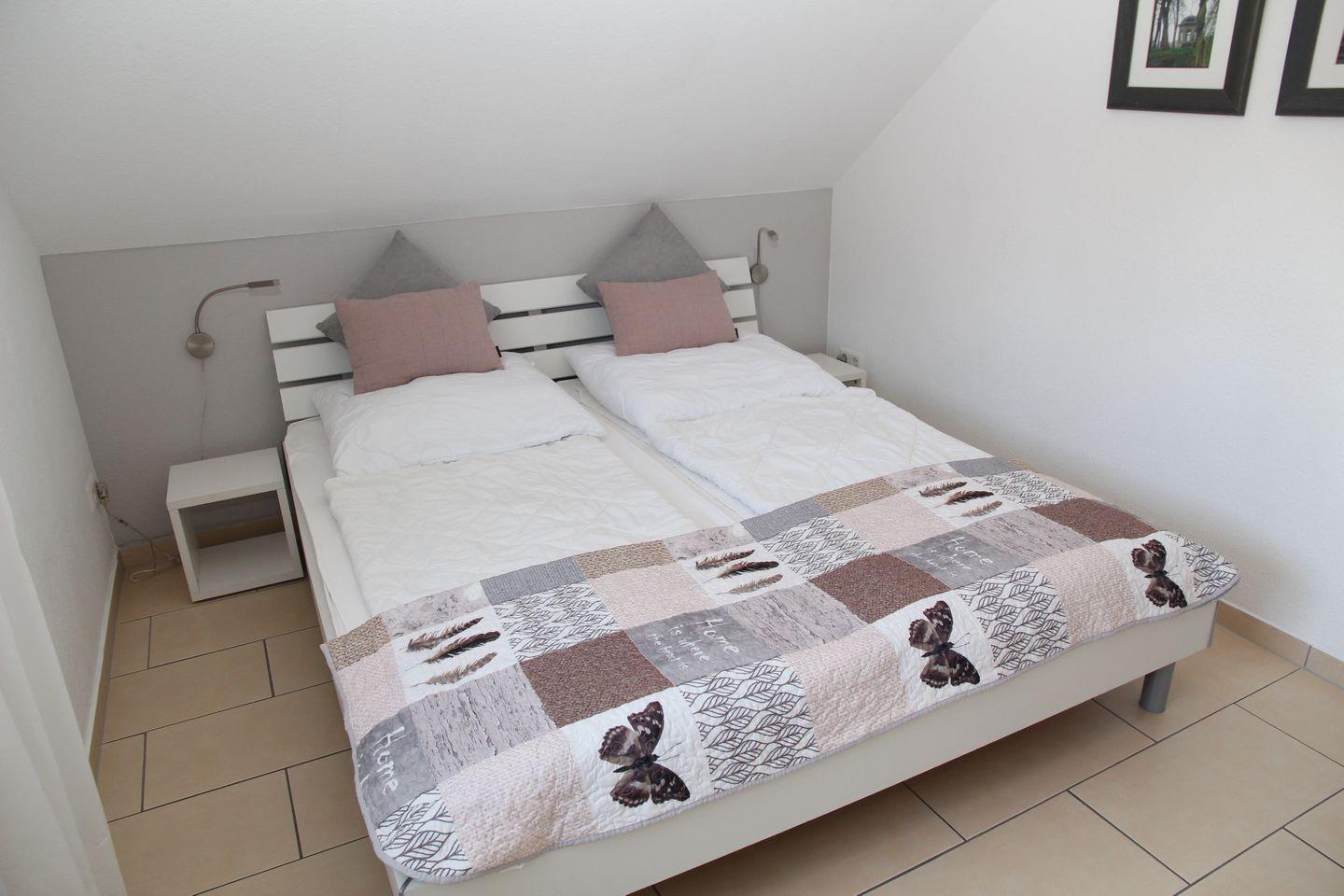 Die 3 Schlafzimmer (alle Betten 2 m x 1,80 m) mit jeweils 2 Betten (einmal 3 Betten im OG) verteilen sich auf das Erdgeschoss (1) und im Obergeschoss (2). An den Fenstern sind Rollläden (auch im EG-Bad). In einem Schlafzimmer befindet sich noch ein 21 Zoll Flachbildfernseher mit integriertem DVD-Player und im weiteren großzügigen (Kinder-) Schlafzimmer TV und CD-Radio-Kassettengerät. Außerdem steht kostenlos ein Kinderreisebett und ein Hochstuhl zur Verfügung.