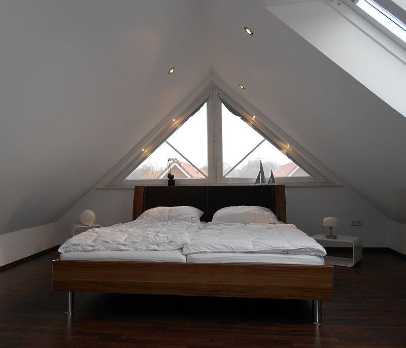Im DG-Schlafzimmer sind Plissee-Verdunkelungen installiert.