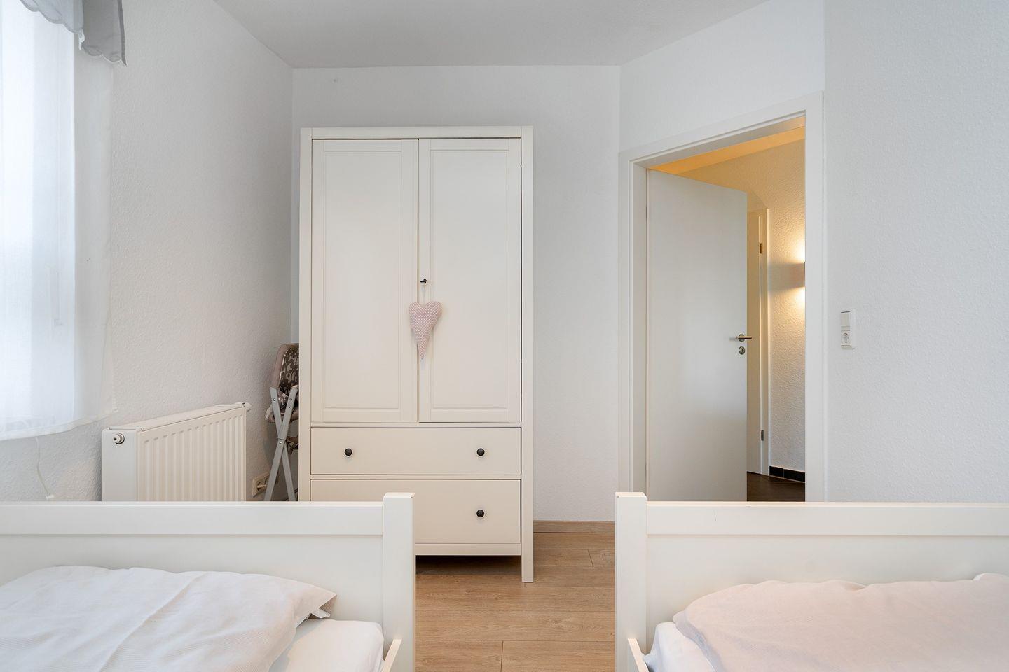 Es gibt zwei gemütliche Schlafräume, 1 x mit Doppelbett und 1 x mit zwei Einzelbetten (Außenrollos), ein modernes Bad mit Dusche (ohne WC) und großem Doppelwaschtisch, sowie ein separates WC.