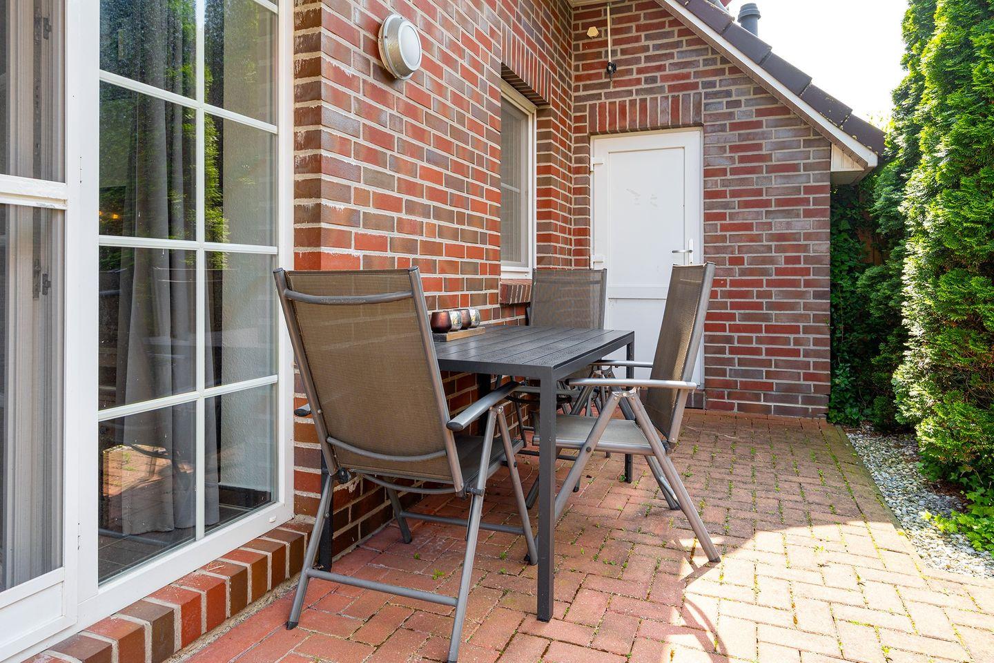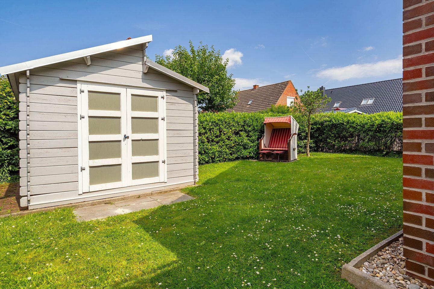 Ein kleiner Garten mit gemütlicher Terrasse, Grill und einem Strandkorb für die Sonnenstunden, laden zu einem erholsamen Urlaub ein.