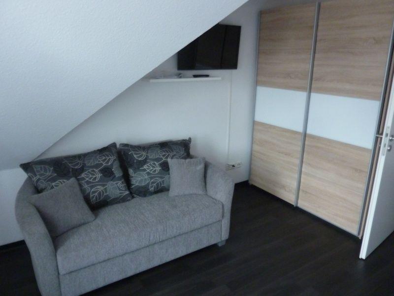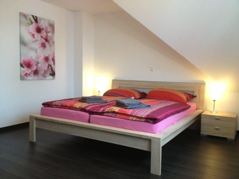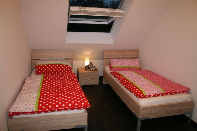 Das Ferienhaus verfügt über 2 Schlafzimmer (Doppelbett 2x 90x2m + 2 Einzelbetten 90x2m), die sich im Obergeschoss befinden. Im Elternschlafzimmer befindet sich ein zweiter Fernseher. Das große Dachfenster im Kinderzimmer ist mit einem Verdunklungsrollo ausgestattet, im Elternschlafzimmer befinden sich Plissees. Ebenfalls in der ersten Etage befindet sich ein Duschbad mit WC und Waschmaschine. Die Dusche verfügt über einen niedrigen Einstieg. Das Duschbad ist gefliest, die Schlafräume sind mit Klick-Vinyl ausgelegt.