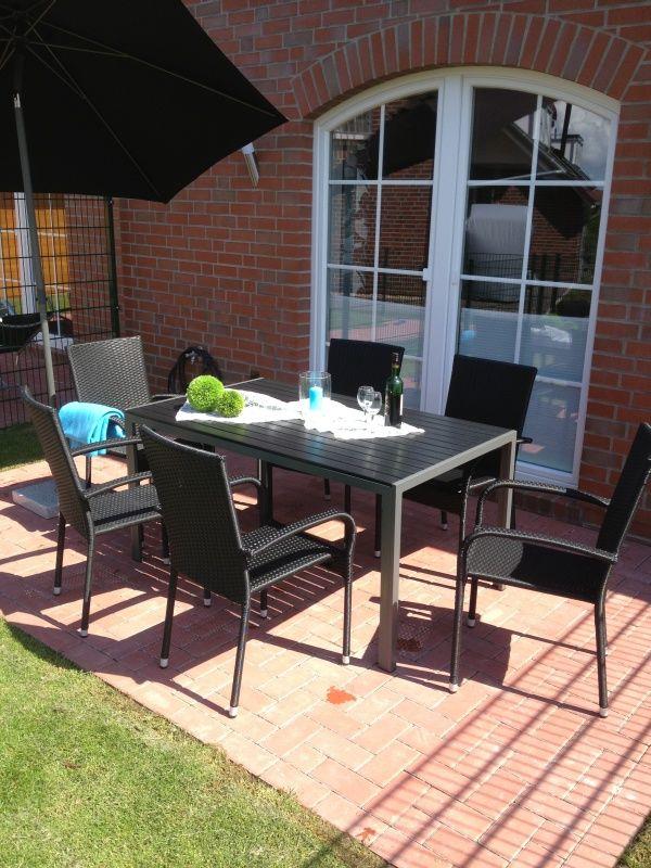 Die Terrasse ist mit Mobiliar ausgestattet und verfügt über Gartenstühle, Gartenliegen und einen Sonnenschirm, der Garten ist komplett eingezäunt.