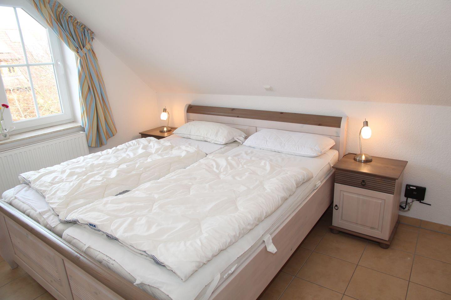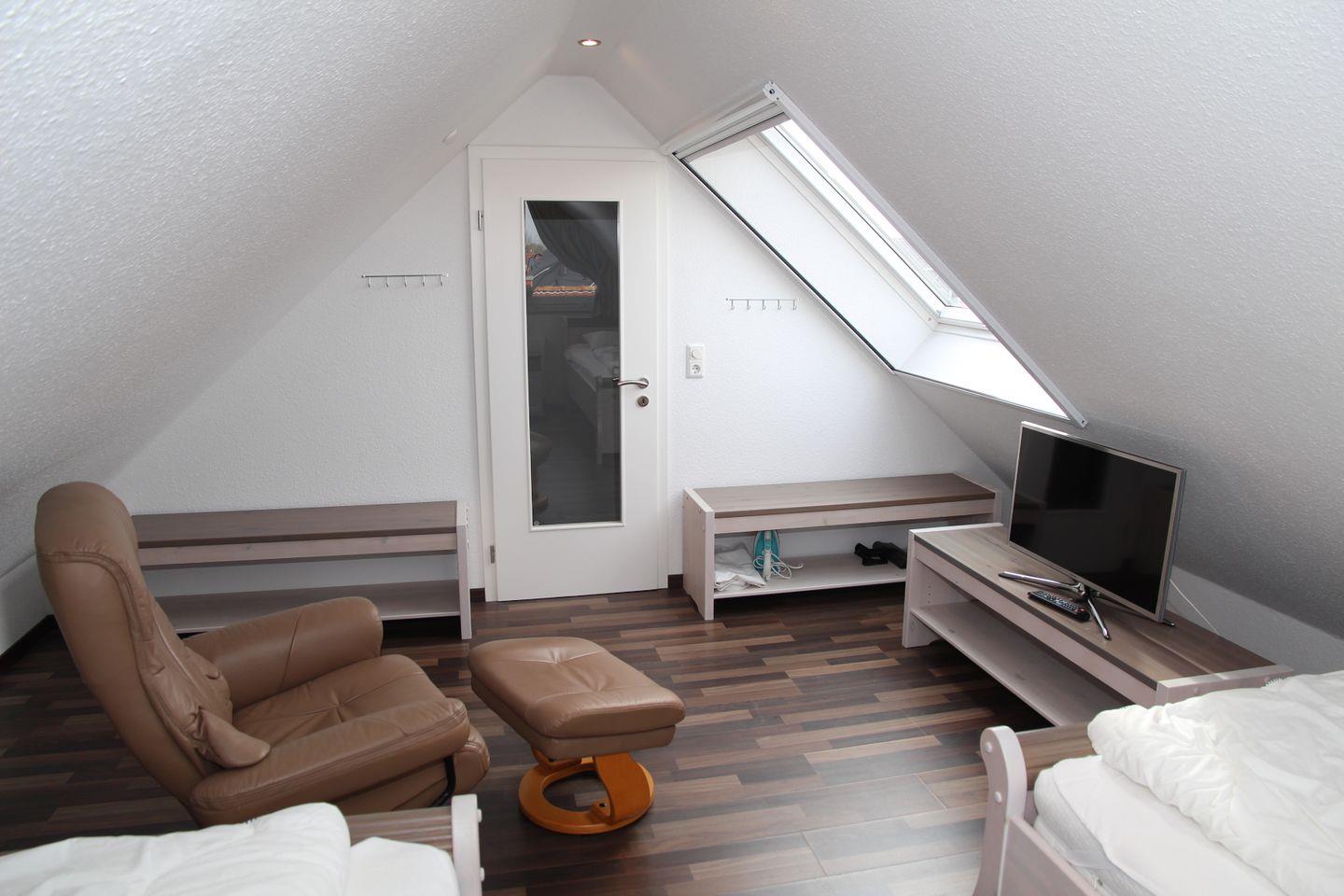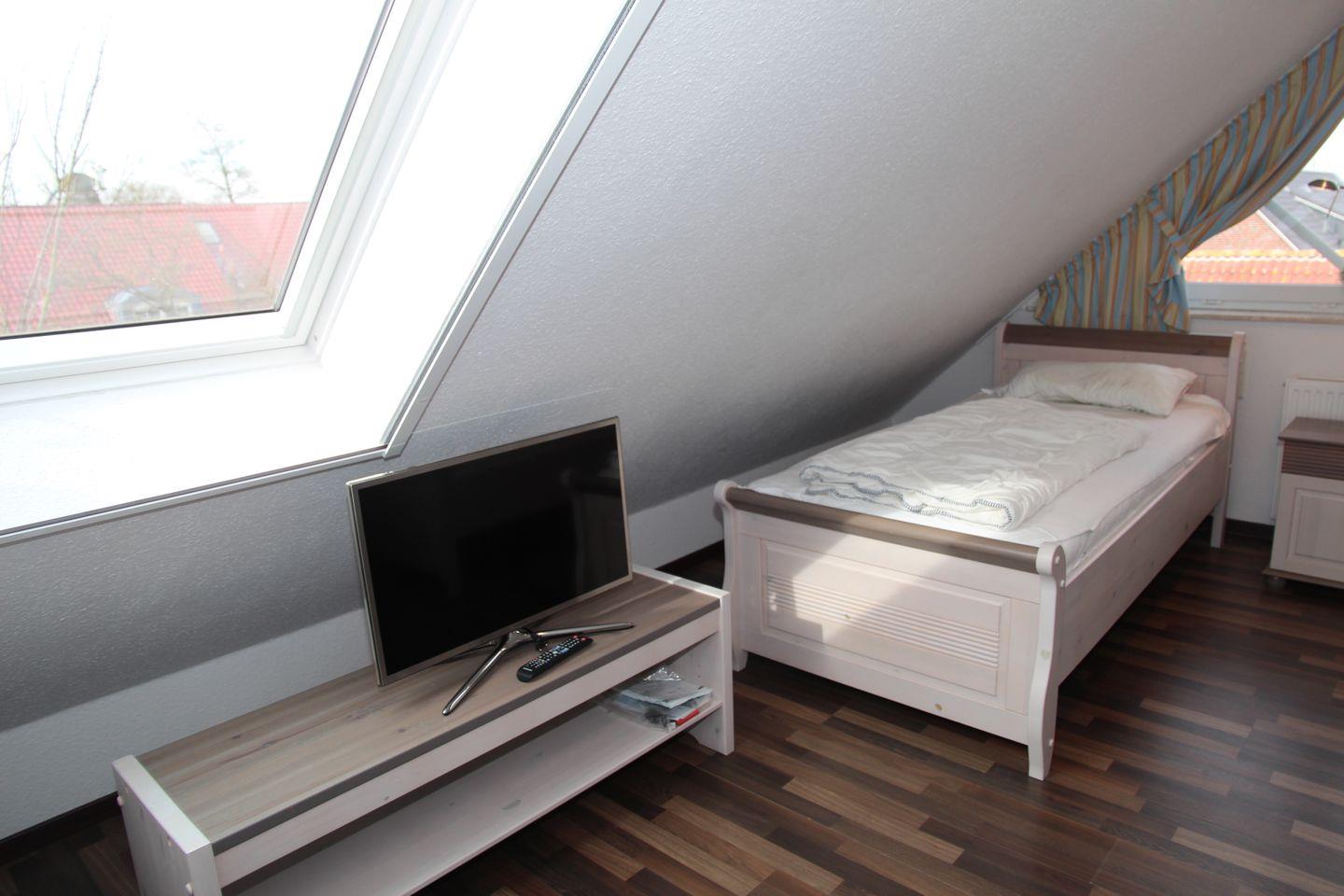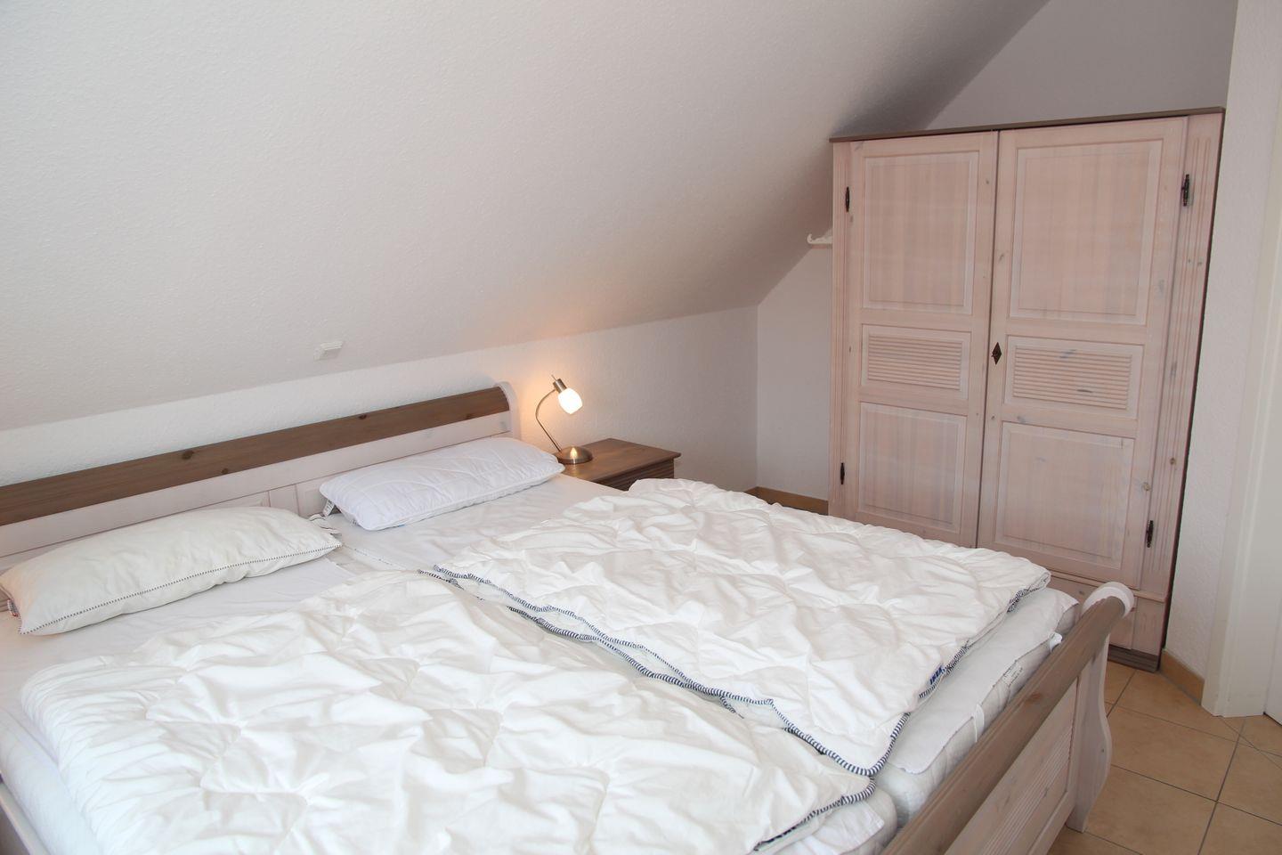 2 Schlafzimmer (1 x mit Doppelbett und Kleiderschrank, 1 x mit 2 Einzelbetten und großem TV im ausgebauten Dachgeschoss mit Tür) sorgen für erholsamen Schlaf. Es gibt ein modernes Bad mit barrierefreier Dusche (Waschmaschine / Fön vorhanden!) und ein sep. Gäste-WC.